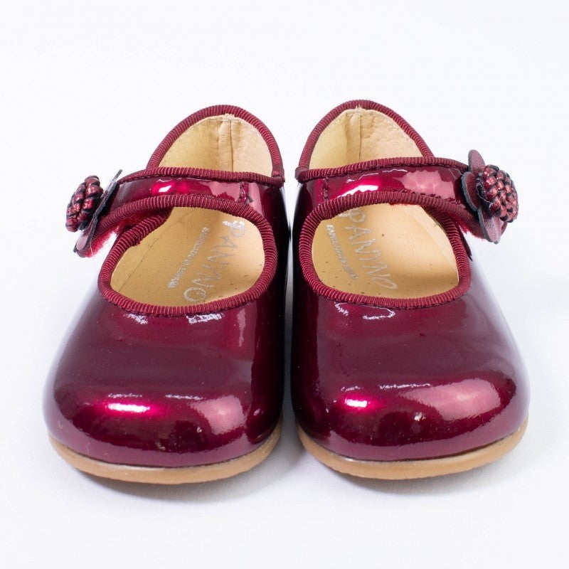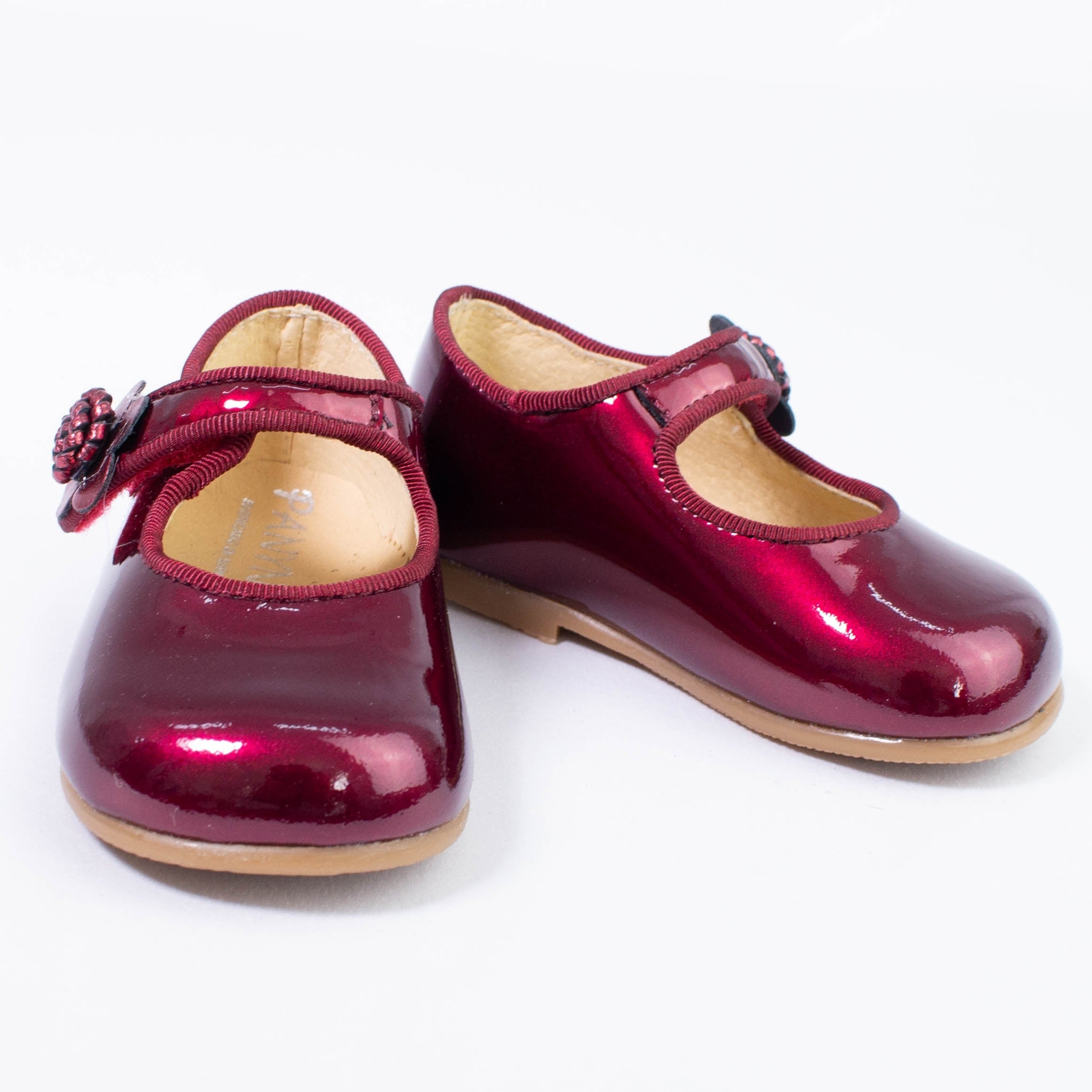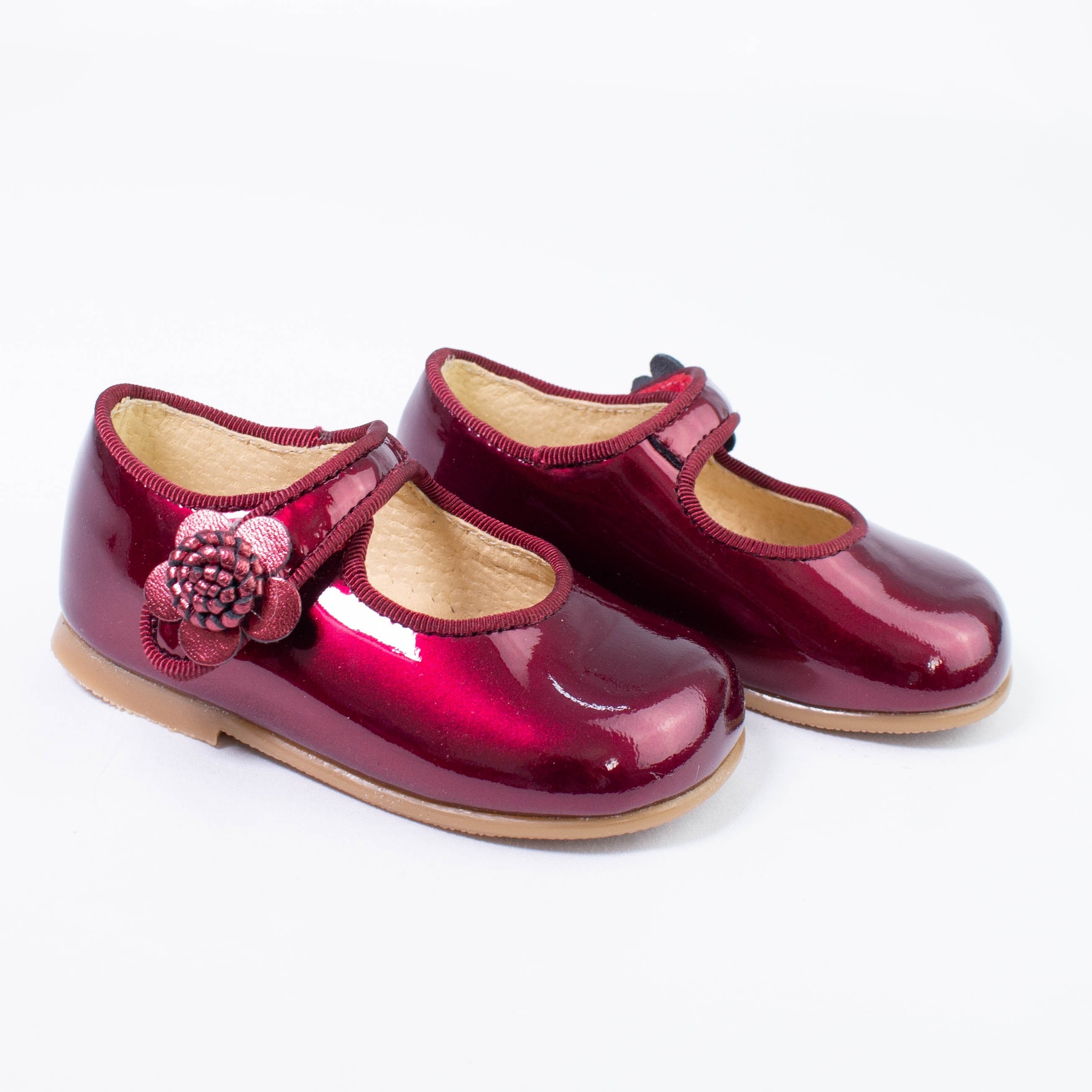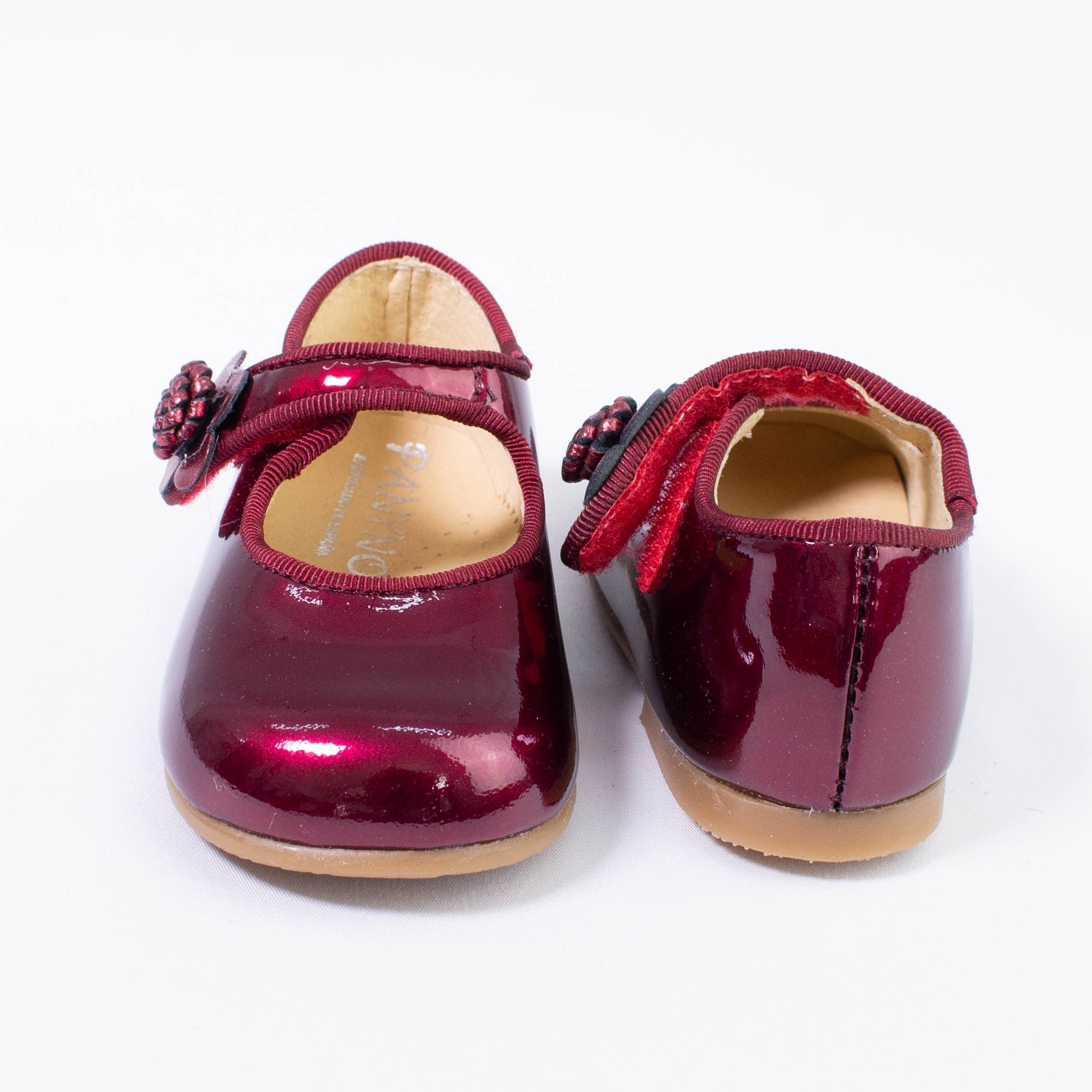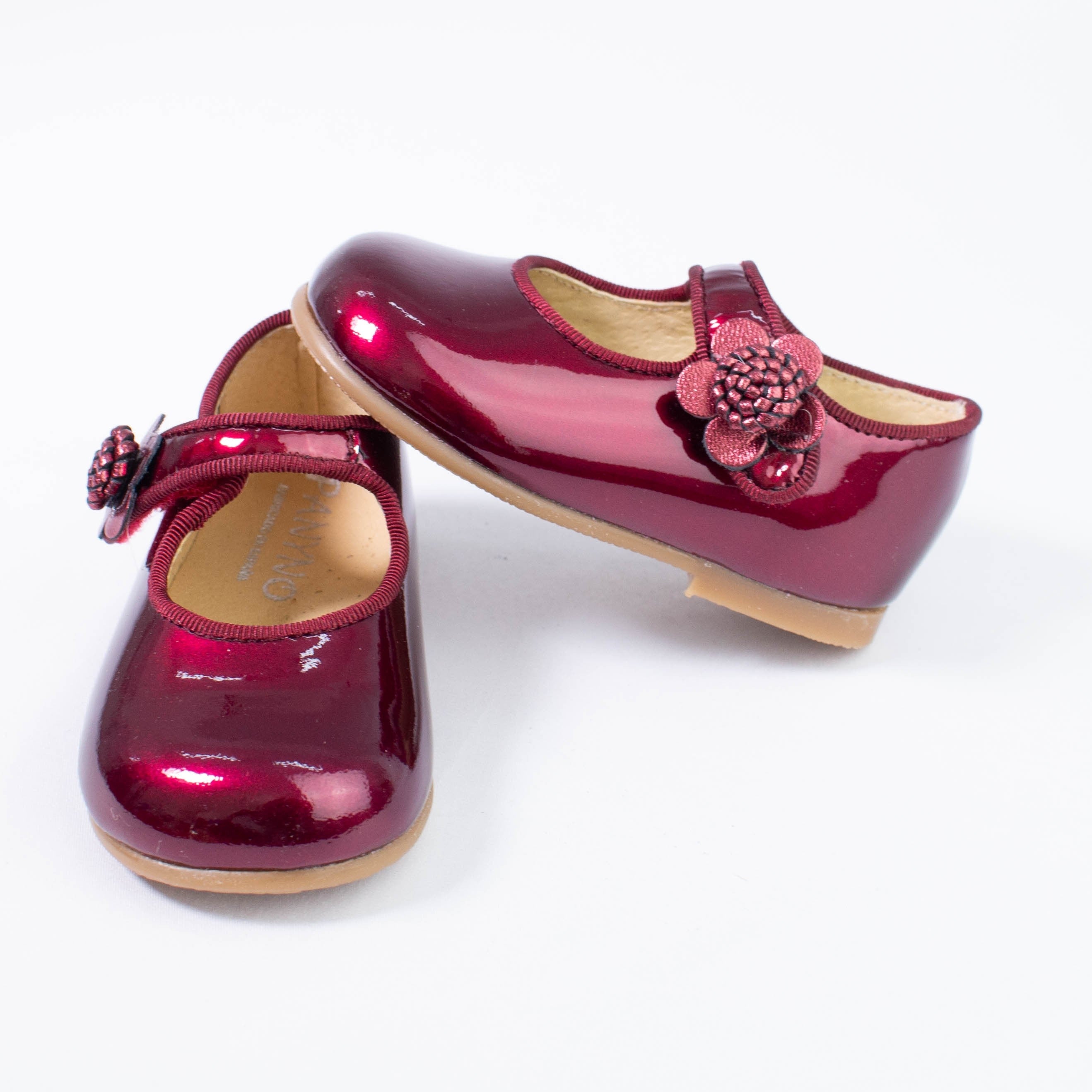 First Steps Shoes. In Glossy Paint. Ballerina model with tear and flower closure.