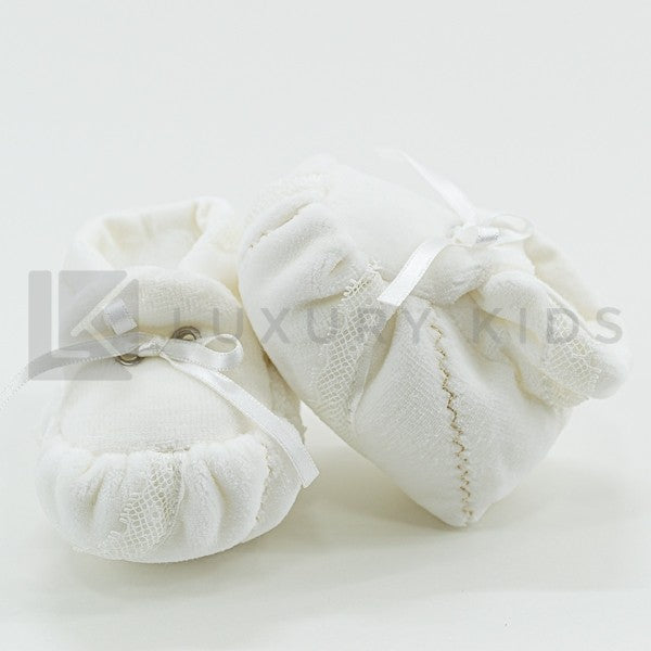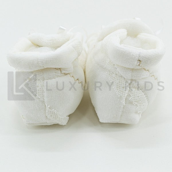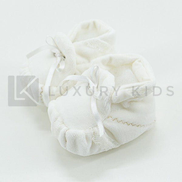 Cradle shoes in cream chenille with lace application and gold stitching.