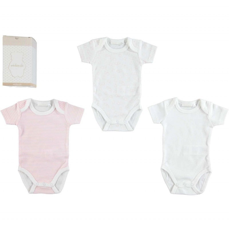 Set of three half-sleeve cotton bodysuits in nice patterns with flap closure.