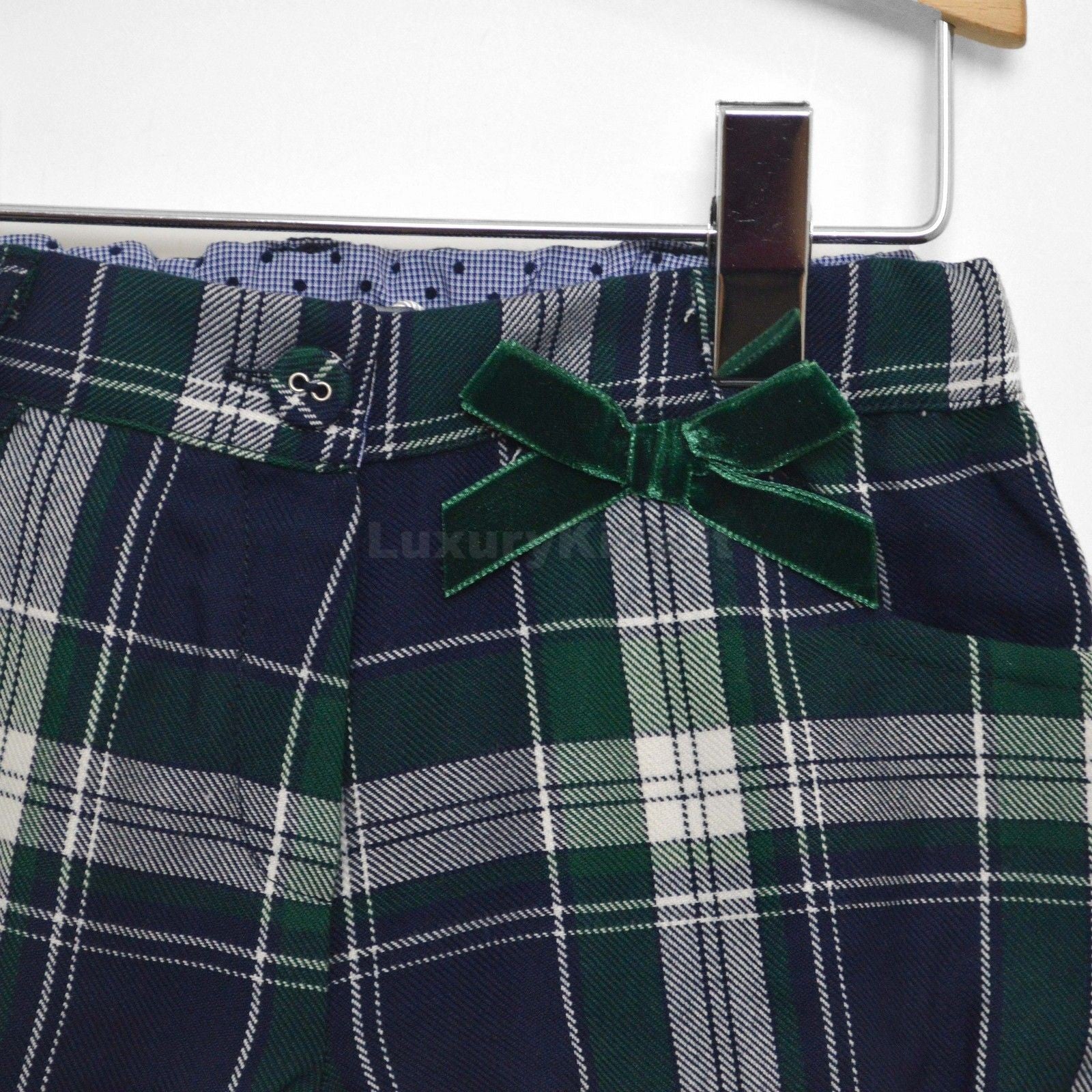 -Short in warm cotton with green and blue checked pattern with green velvet bow applied on the front