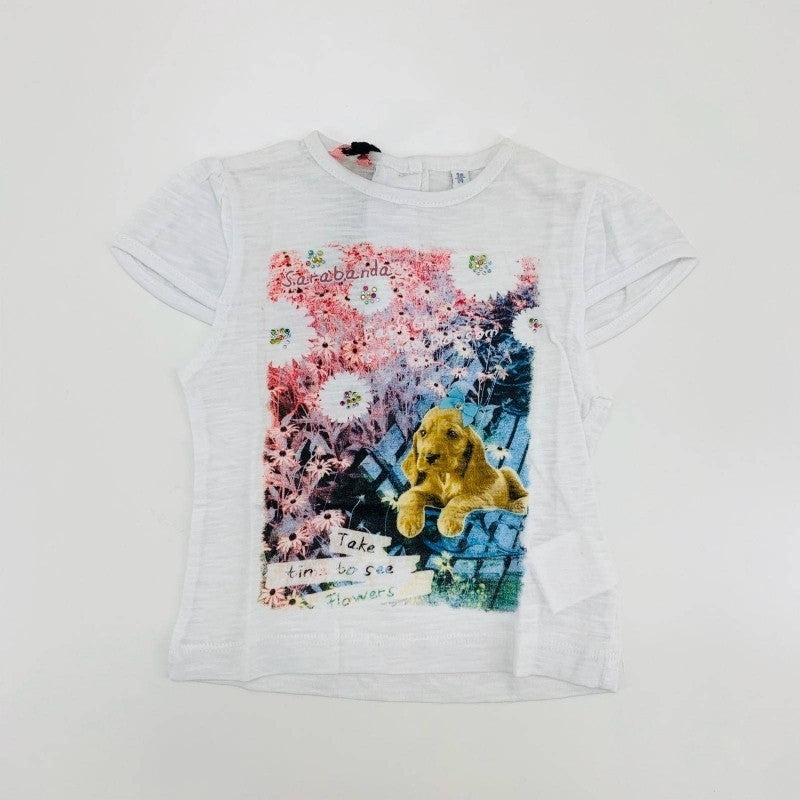 White cotton half sleeve T-shirt with multicolor print on the chest and rhinestone application