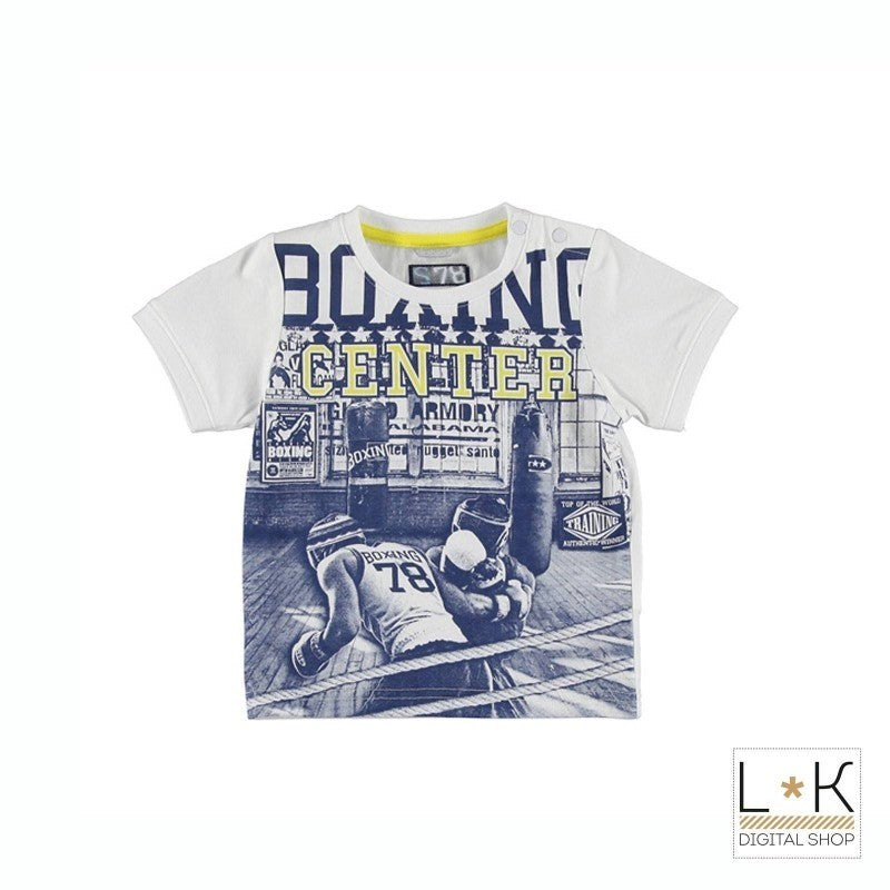 White cotton T-shirt with blue and yellow Boxing print on the chest