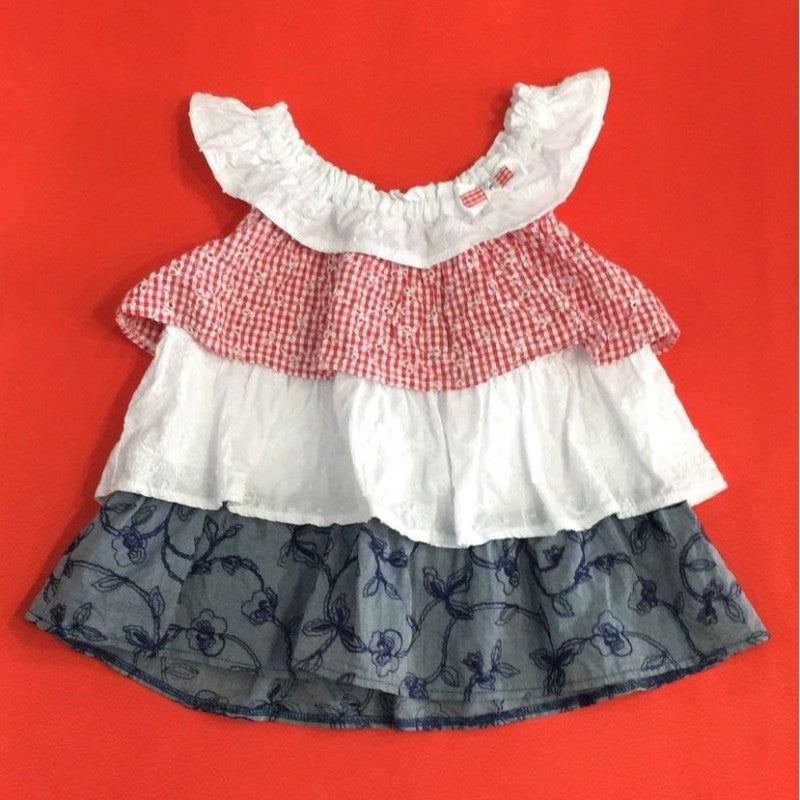 -Top with ruffled collar and different colored flounces with embossed embroidery