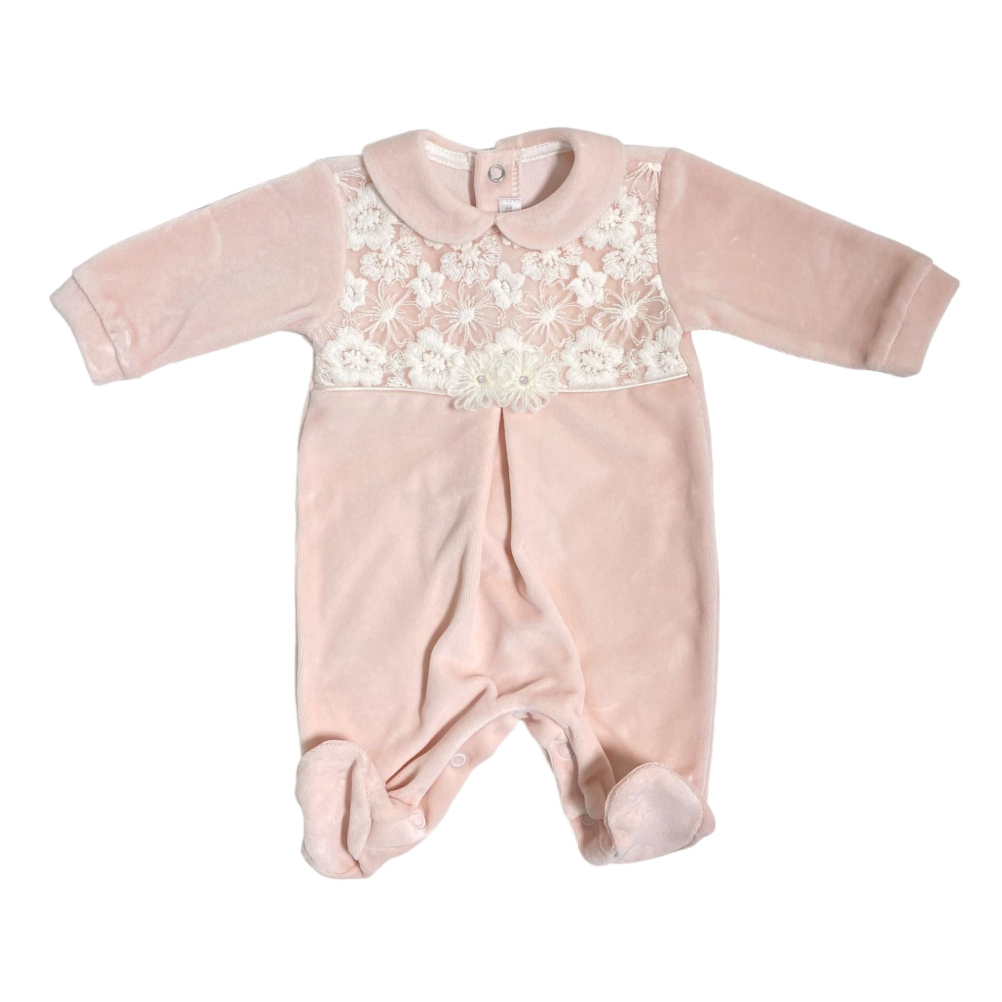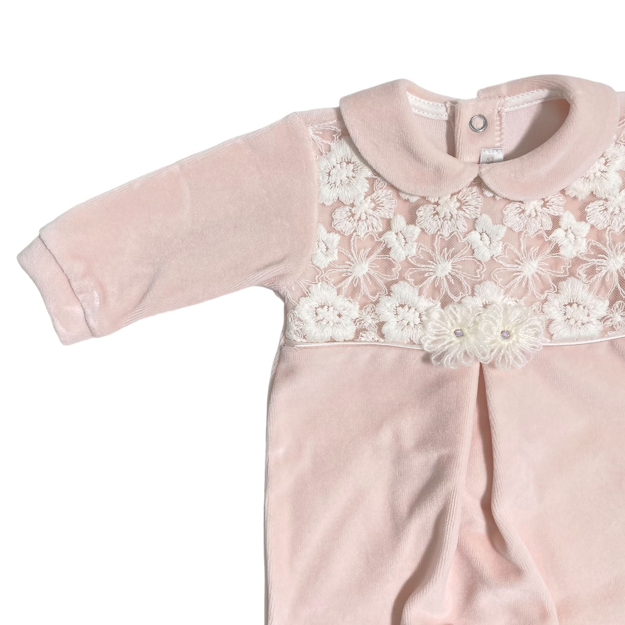 Scopri la graziosa tutina intera in ciniglia e pizzo, perfetta per la tua neonata. Realizzata con cura in Italia, è elegante e comoda per le prime uscite dalla clinica. Regala al tuo bambino il meglio della qualità e dello stile.