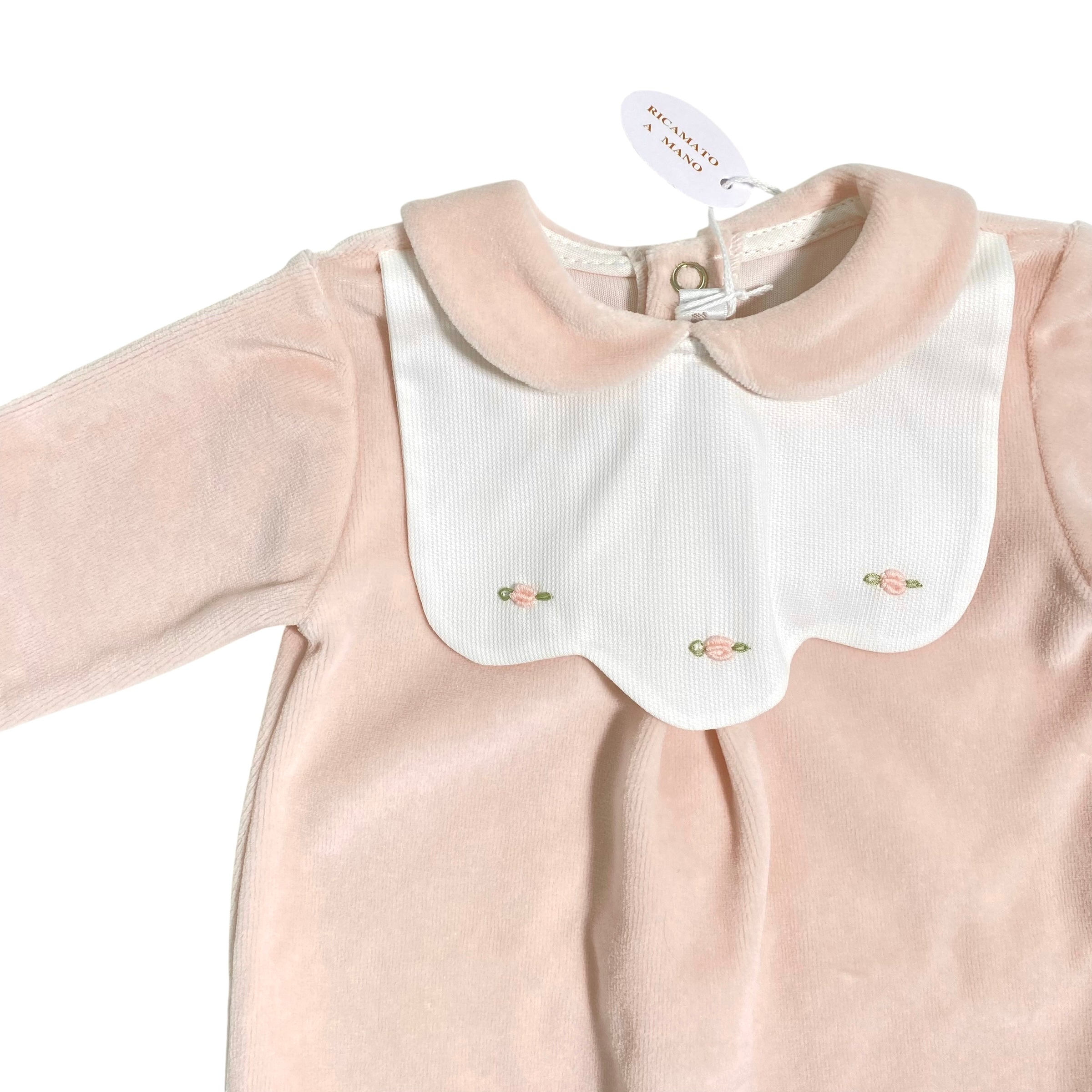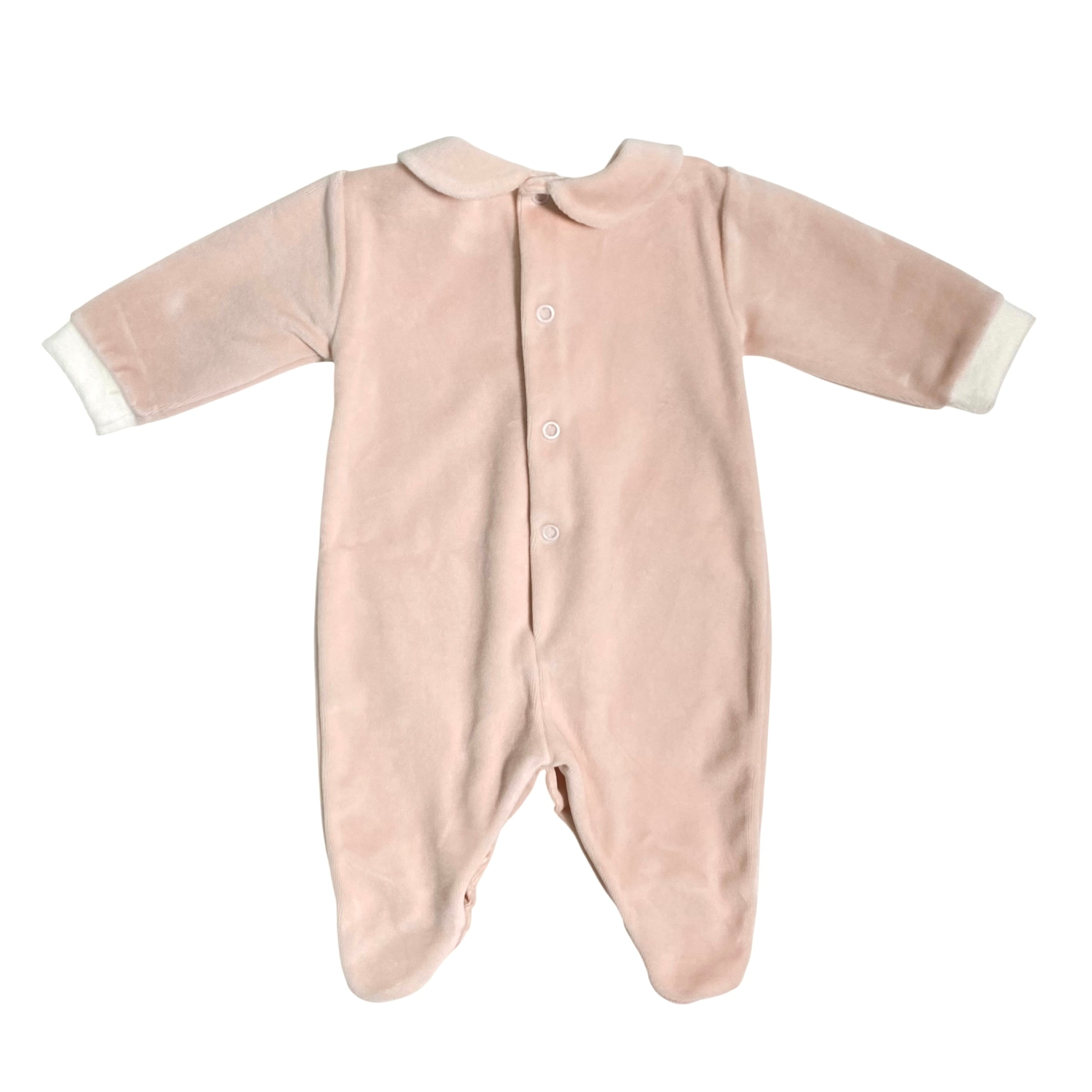 Questa tutina intera in ciniglia, arricchita da ricami raffinati sul davanti, è ideale per i primi giorni della neonata. Realizzata con materiali morbidi e caldi, assicura comfort e protezione delicata sulla pelle sensibile del bambino. Un capo elegante e funzionale, perfetto per completare il corredino essenziale.