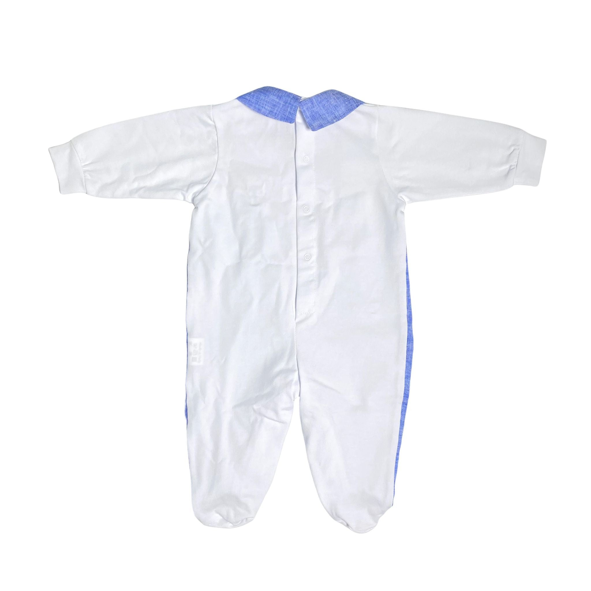 Whole suit in white cotton, fake dungarees, with the lower part in light blue linen and striped suspenders.