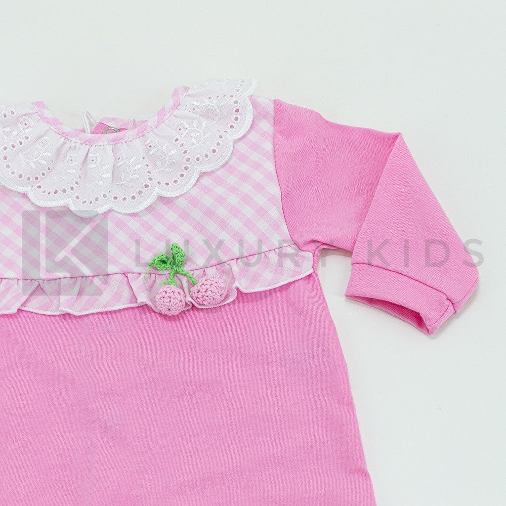 One-piece suit in fuchsia cotton with pink checked bodice, application of strawberries and ruffled neck in San Gallo lace.