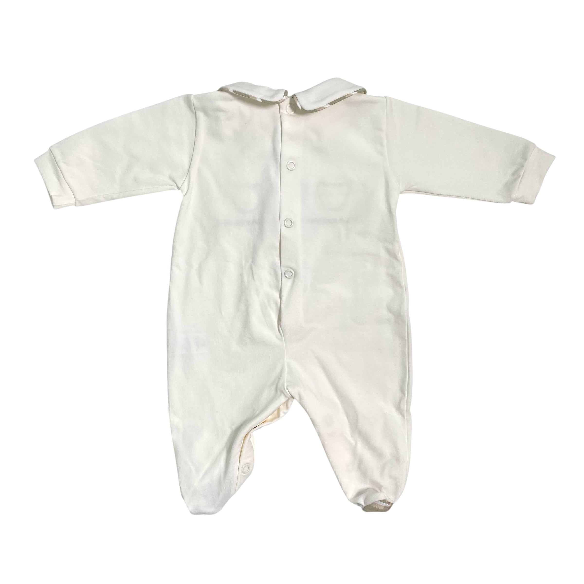 Questa tutina intera in cotone è perfetta per neonati in panna, con dettagli verde militare e beige. Il corpetto ha un ricamo adorabile di orsetti e il disegno a righe sotto ai piedini e nel profilo del colletto.Chiusura con bottoni a pressione sul retro e sotto . 100% MADE IN ITALY.