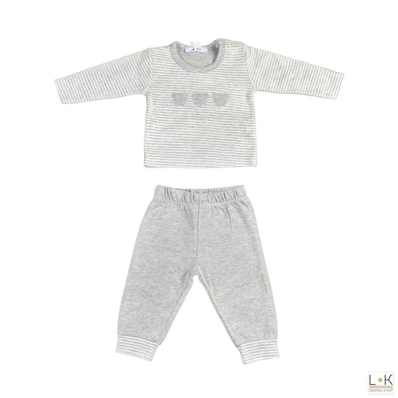 Two-piece suit in warm gray cotton with plain gray titna trousers and striped sweater.