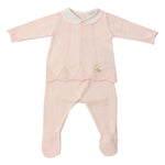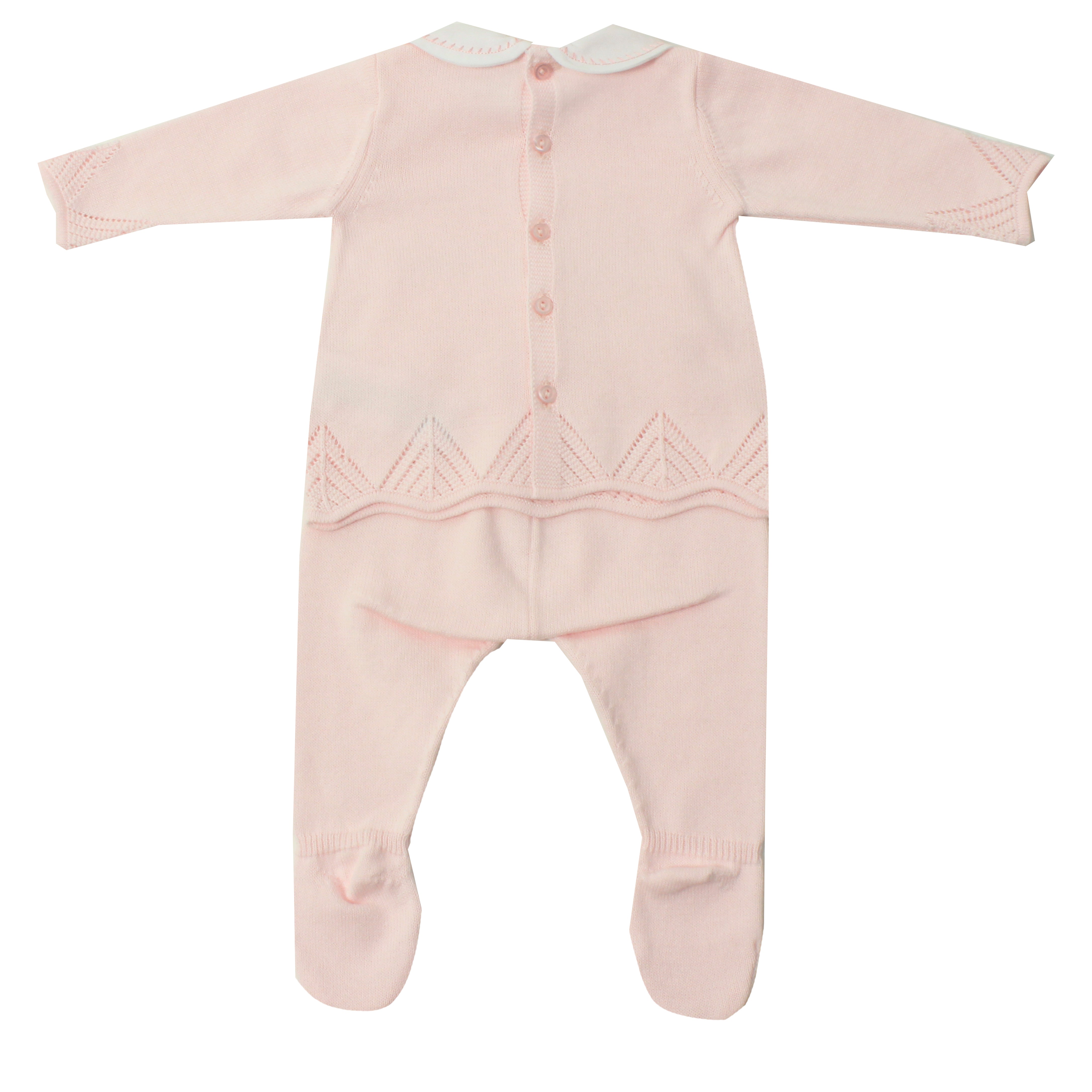 Questa tutina spezzata è realizzata in morbido filo di cotone e presenta una deliziosa lavorazione traforata. Ideale per l'uscita dalla clinica, grazie al suo collo ricamato, garantirà comfort e protezione alla tua neonata.