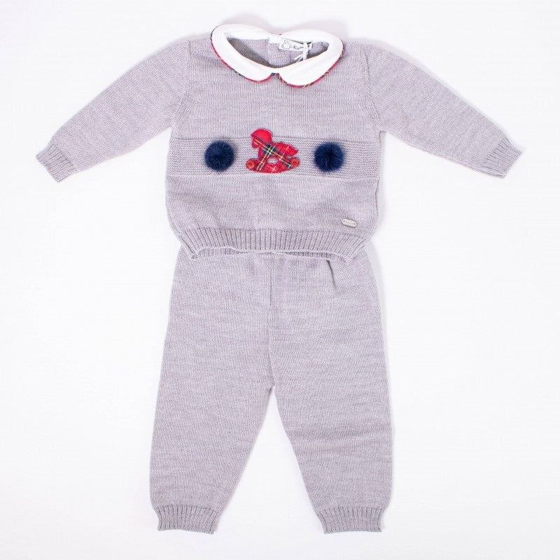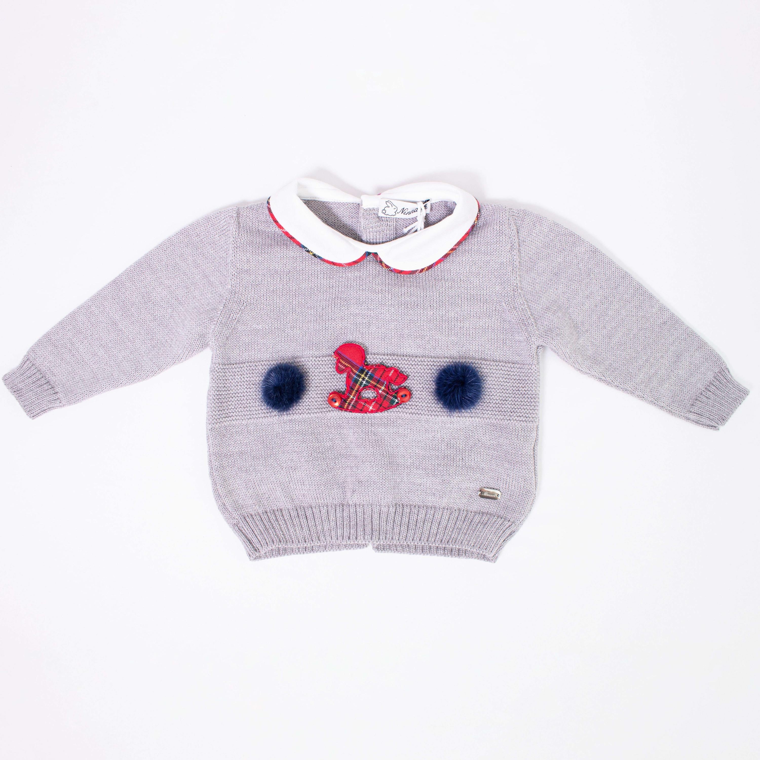 Gray jumpsuit in 100% certified wool, with rocking horse and blue pom poms.