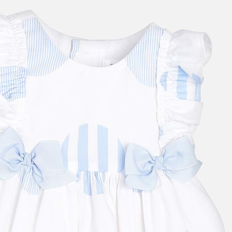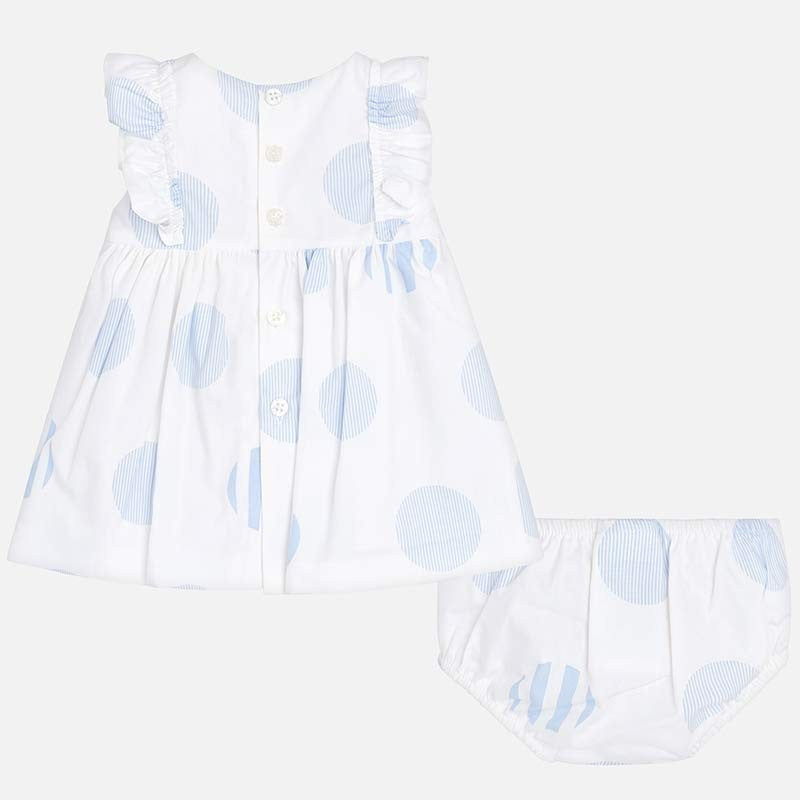 Two-piece suit for baby girl consisting of a delightful dress with matching culottes. Short sleeve dress with ruffles. Crewneck. Design with cut at the waist. Button closure on the back to facilitate the fit of the garment. Comfortable, durable and easy-care poplin fabric. Model with hedgehog. Decorative elements: bows. Polka dot print.