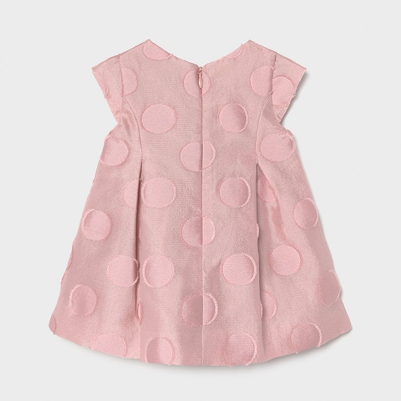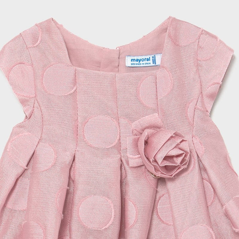Short sleeve dress in pink cotton. Square collar. Back opening with invisible zipper. Soft, stretch fabric for daily comfort. Model with pleats. Decorative elements: floral application. Polka dot print.