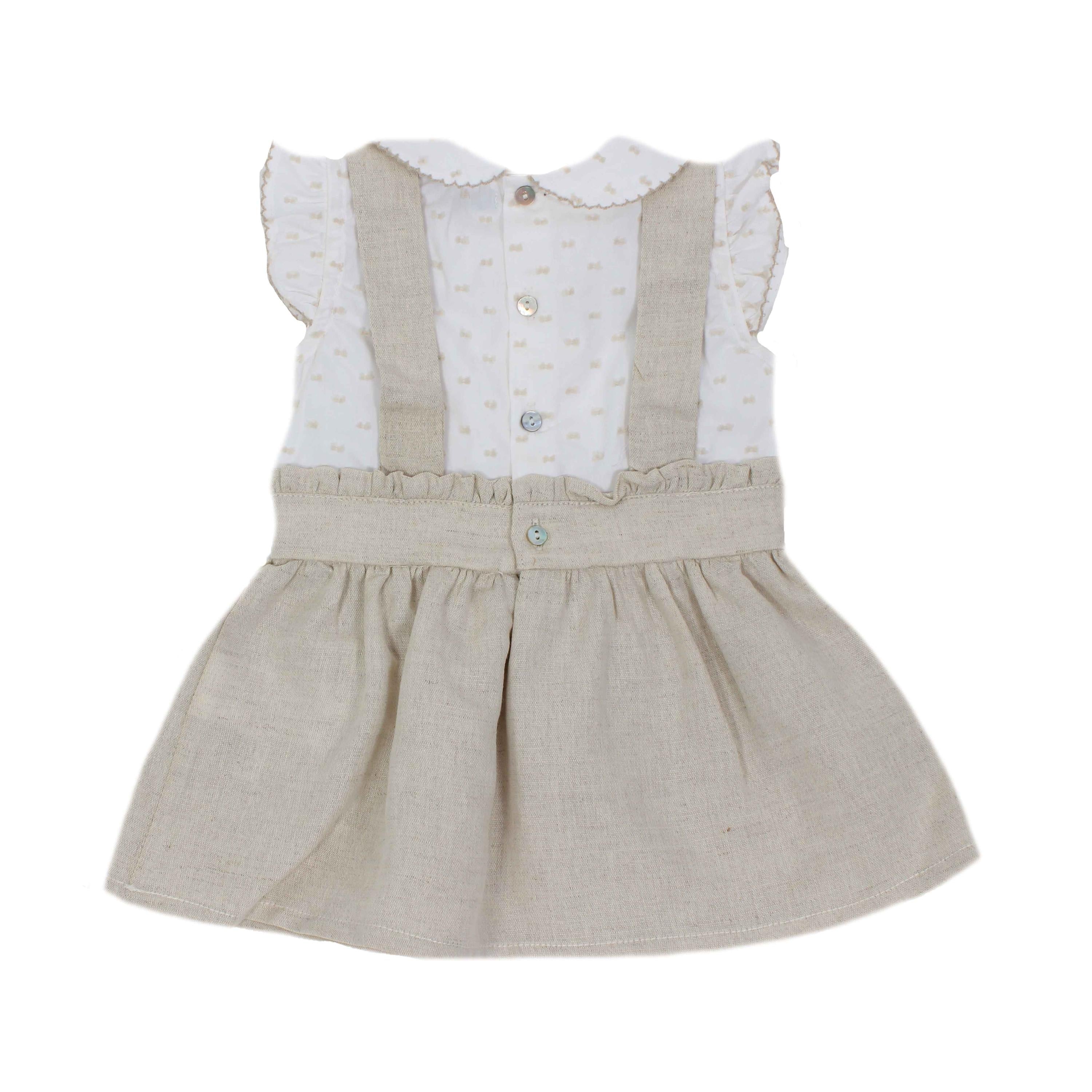 Plumetis Cotton Dress White / beige In The Top. Dull collar. Rouche at the Giro Manica. Lace in the front central part and fake braces in linen.