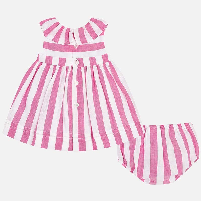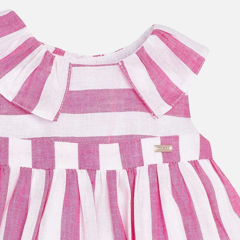 Armhole dress. Crewneck. Closure with snap buttons in the back that facilitate the fit of the garment. Model with hedgehog and ruffles. Striped texture.