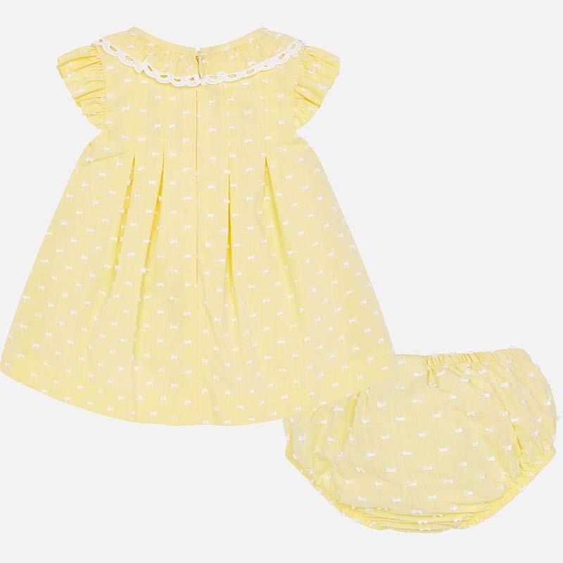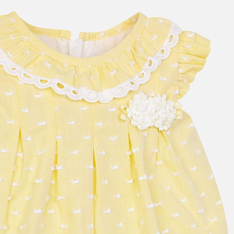 Two-piece suit for baby girl consisting of a delightful dress with matching culottes. Armhole. Round neck with ruffles. Back opening with invisible zipper. Packaged in original plumetis fabric. Model with inner lining. Model with pleats. Decorative elements: floral applications.