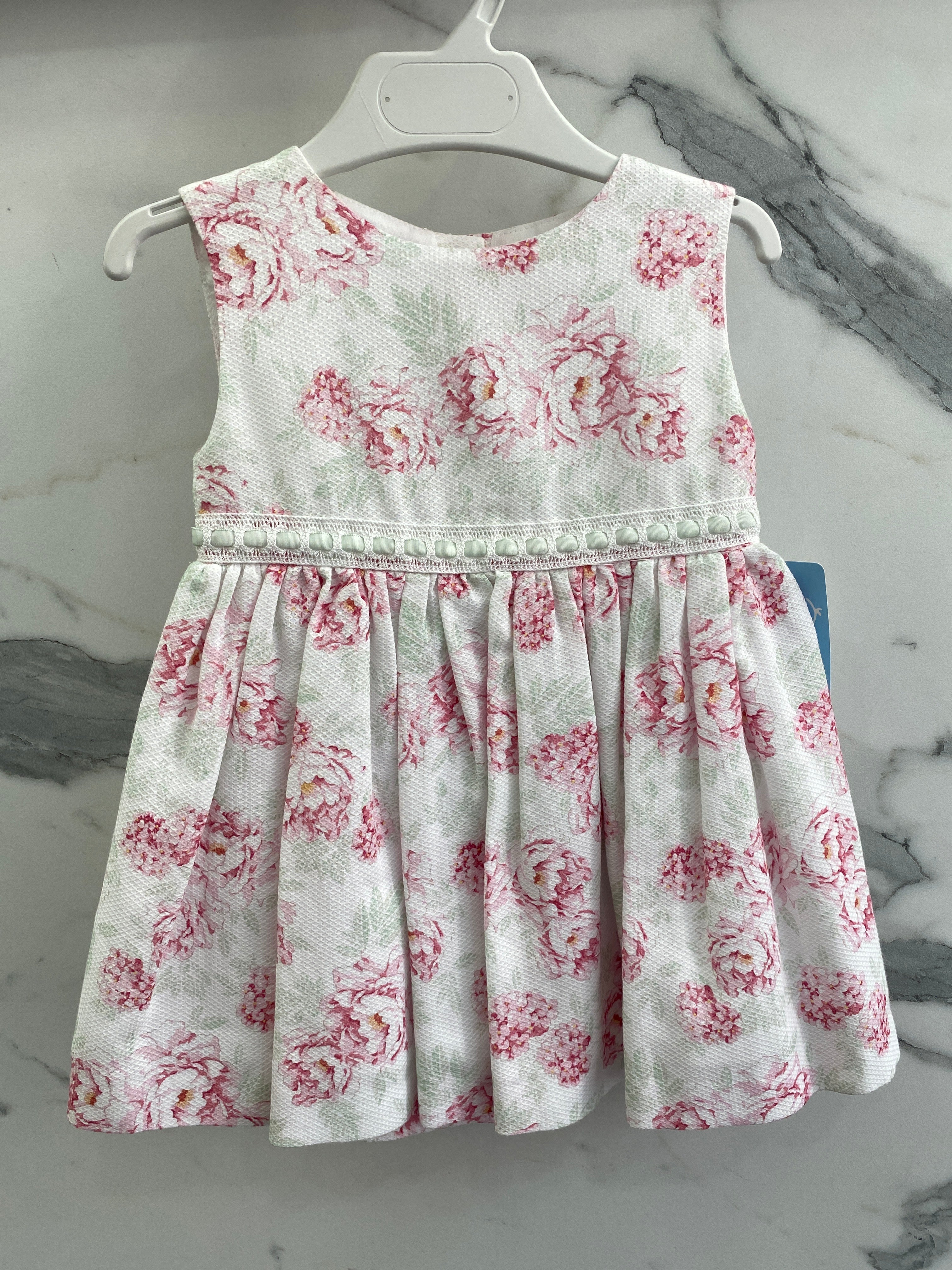 Abito smanicato a base bianca con fantasia floreale. Sulla vita è impreziosito dalla passamaneria verde pastello. Scollo tondo sul retro che fa intravedere la schiena impreziosito con un bellissimo fiocco con rifiniture sui bordi una striscia rosa. Apertura sul retro del colletto con un bottoncino