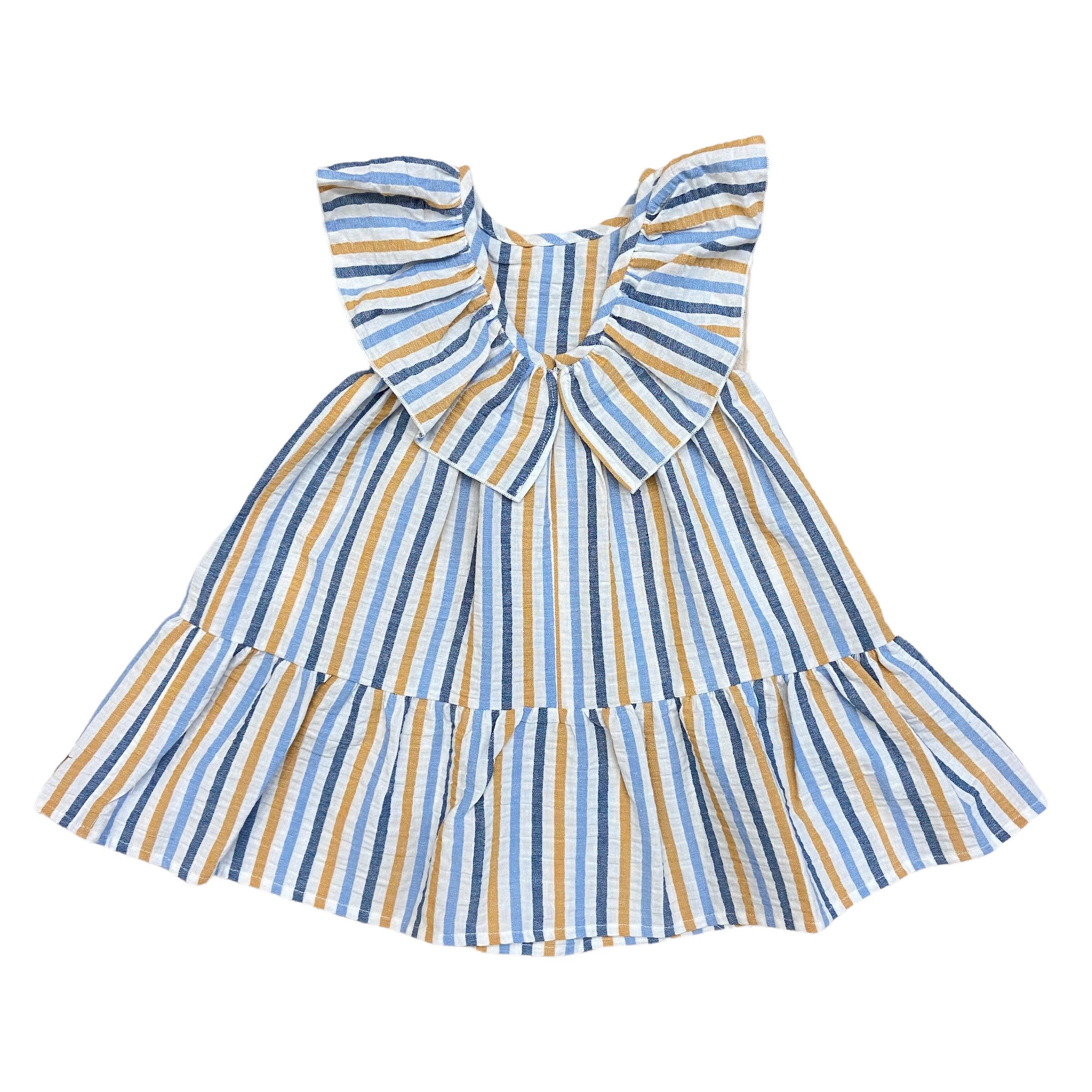 Tutto il vestito ha la stessa fantasia a righe verticali su base bianca con righe senape, celeste e blu denim.