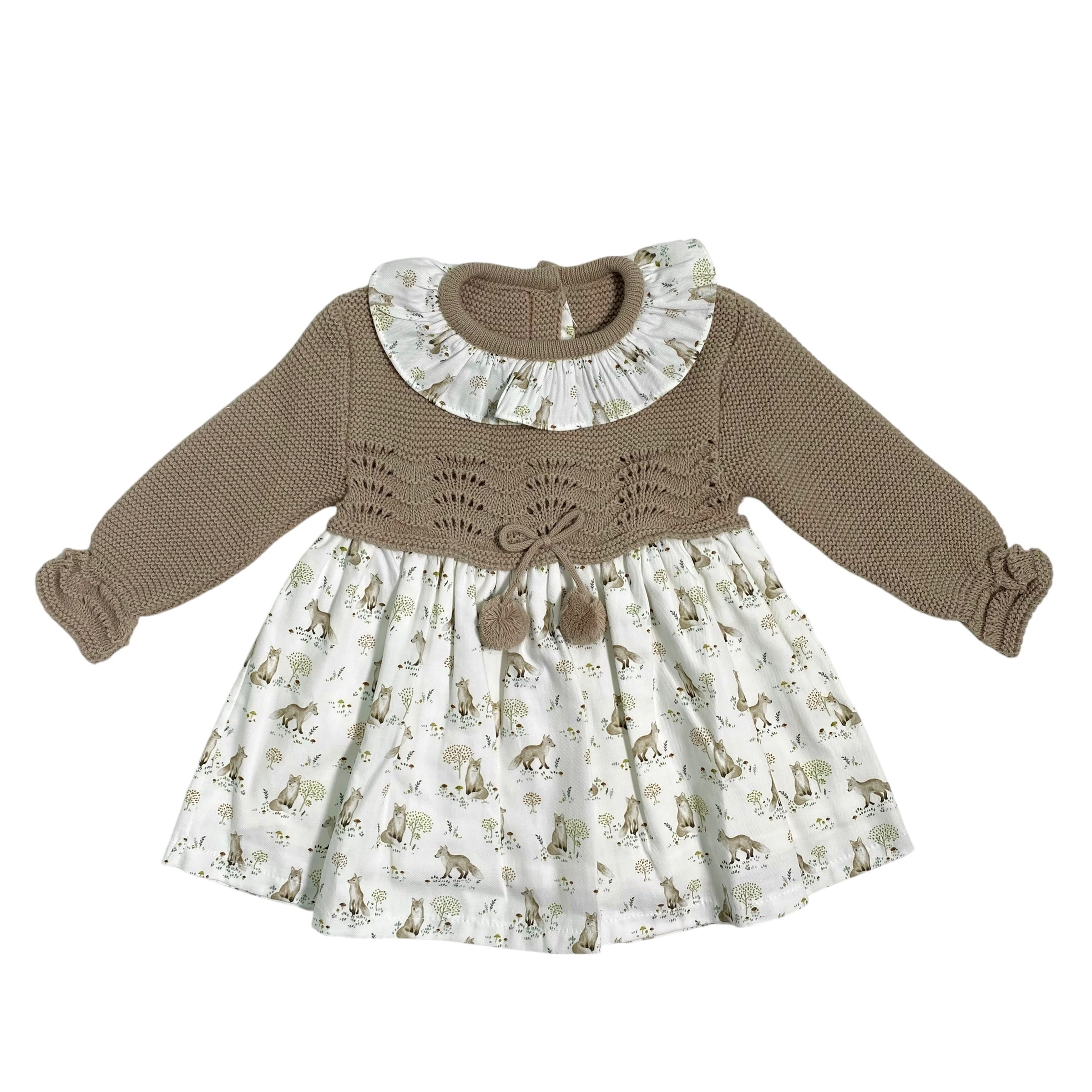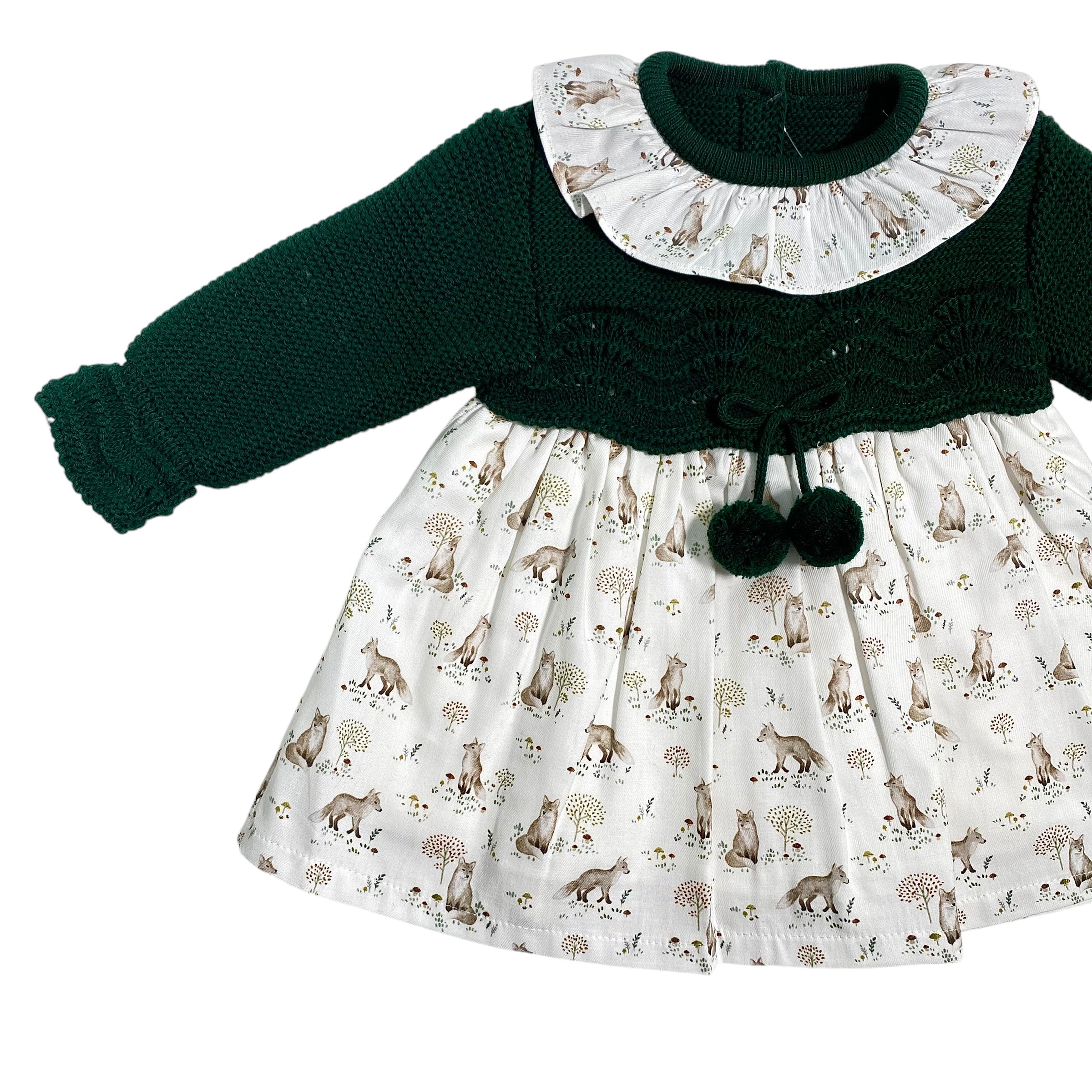 Questo abito combinato e' perfetto per la tua neonata! Il corpetto in maglia offre comfort, mentre il tessuto stampato aggiunge un tocco di stile. Il collo arricciato e i pom pon sul petto rendono questo capo elegante e sofisticato. Aggiungi un tocco di classe al guardaroba della tua piccola con questo abito.