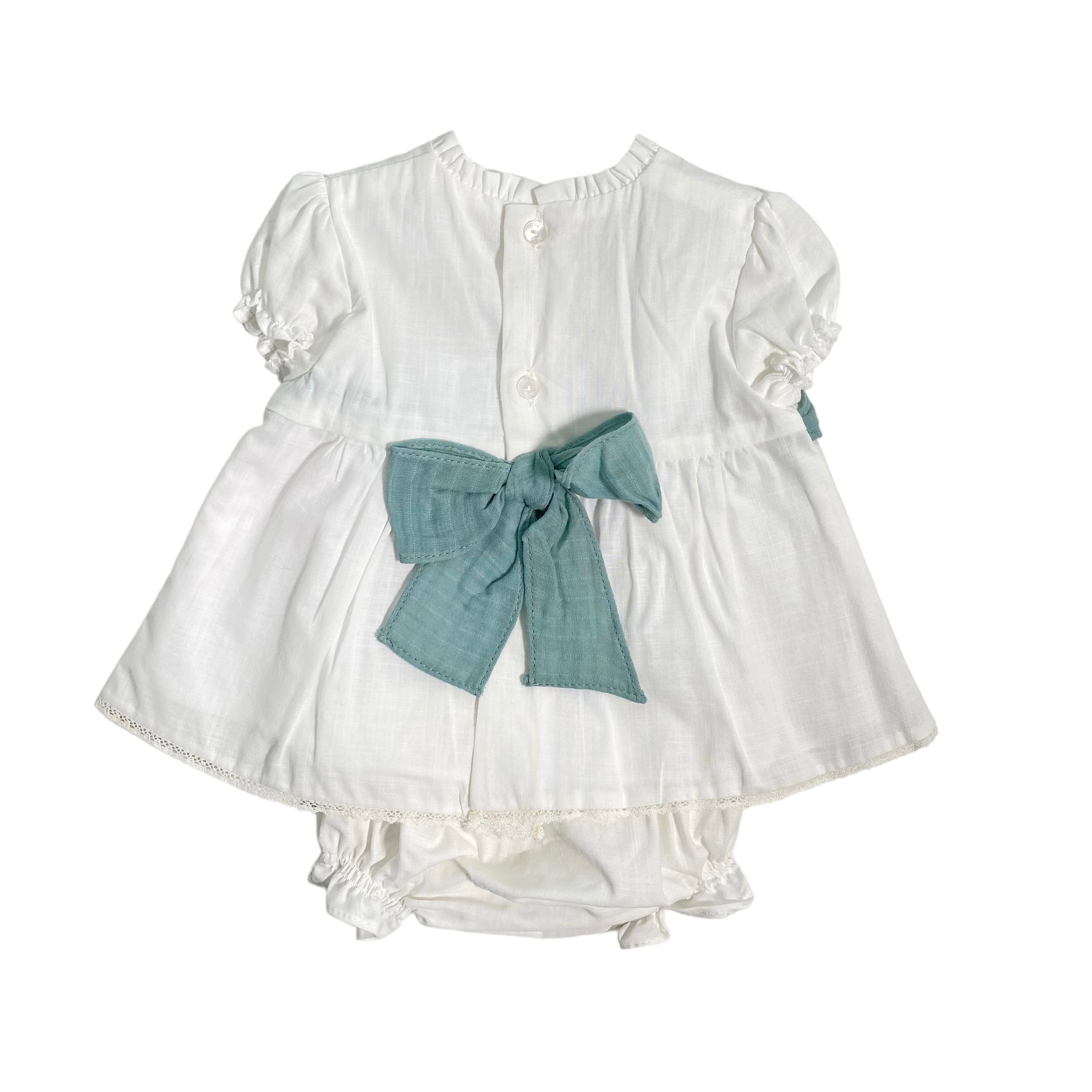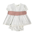 Abito con culotte, in cotone tinta unita bianco, con fascia in vita colorata.
