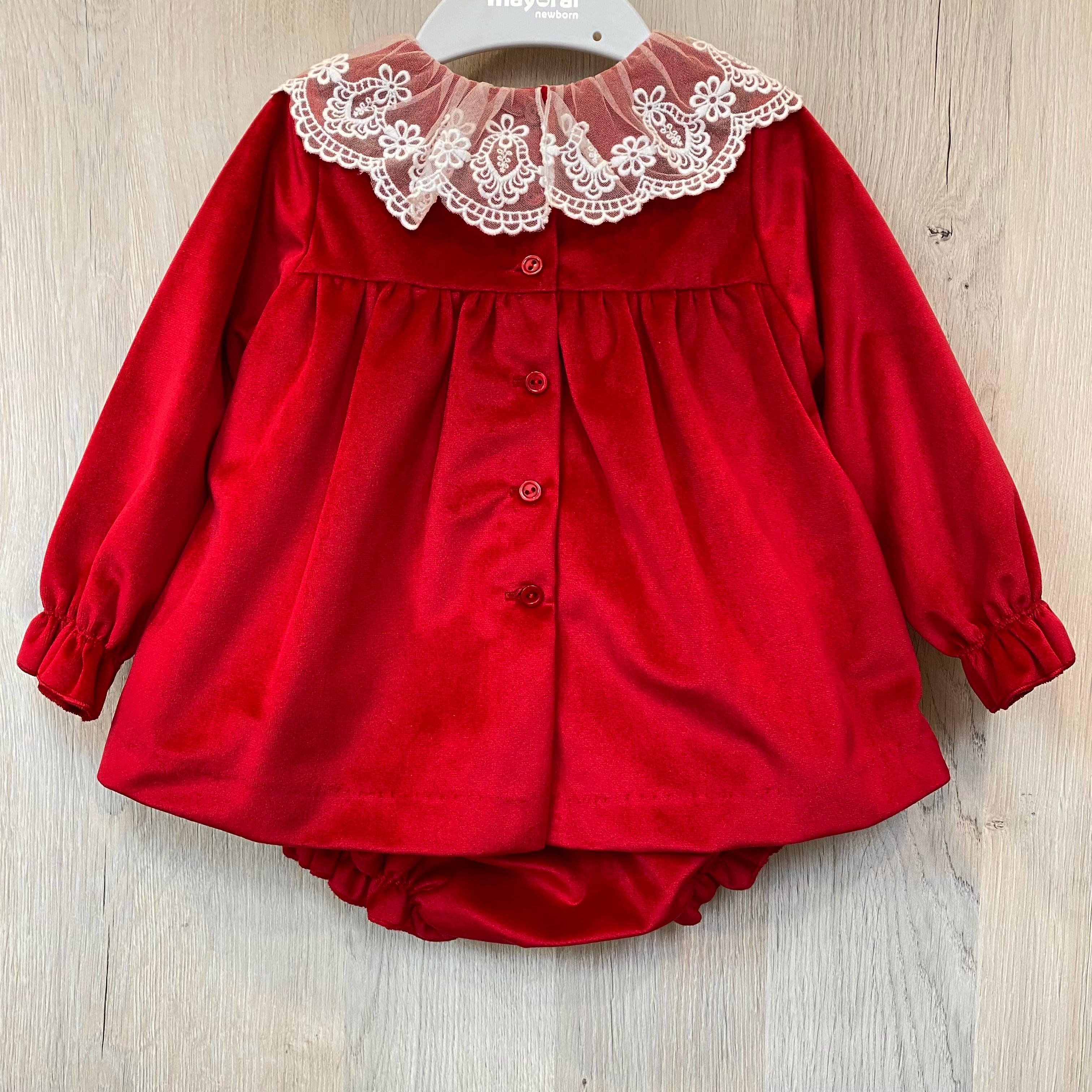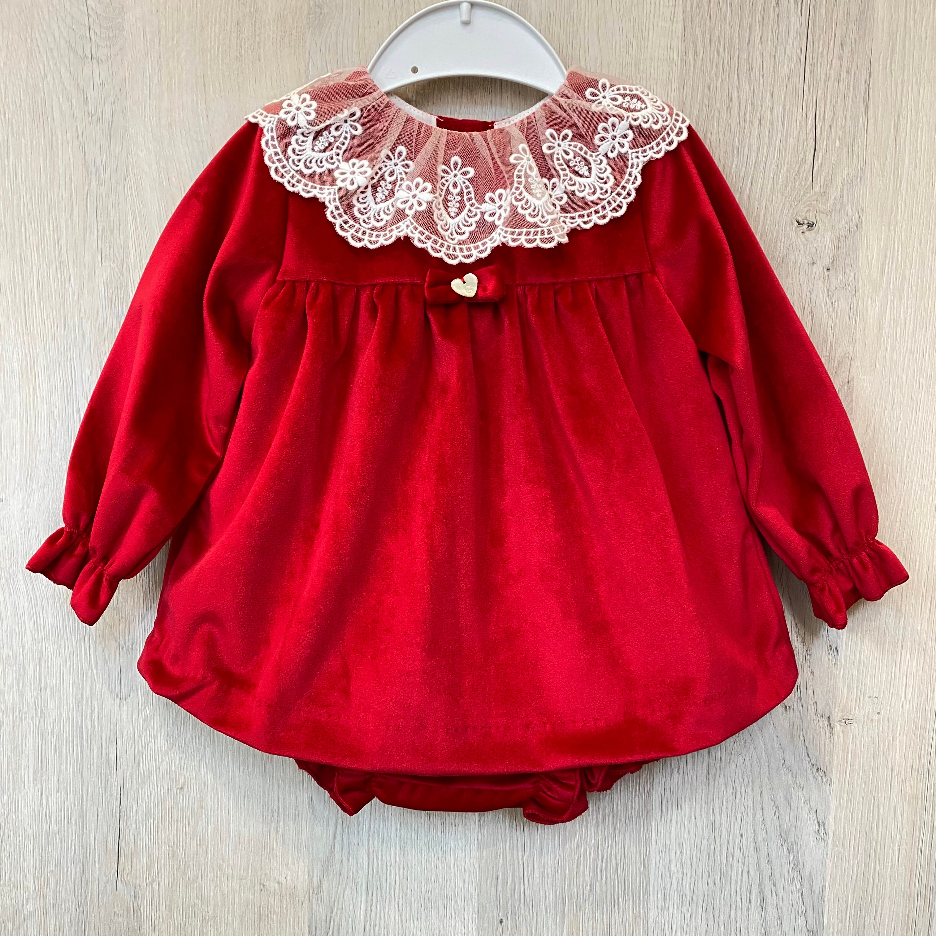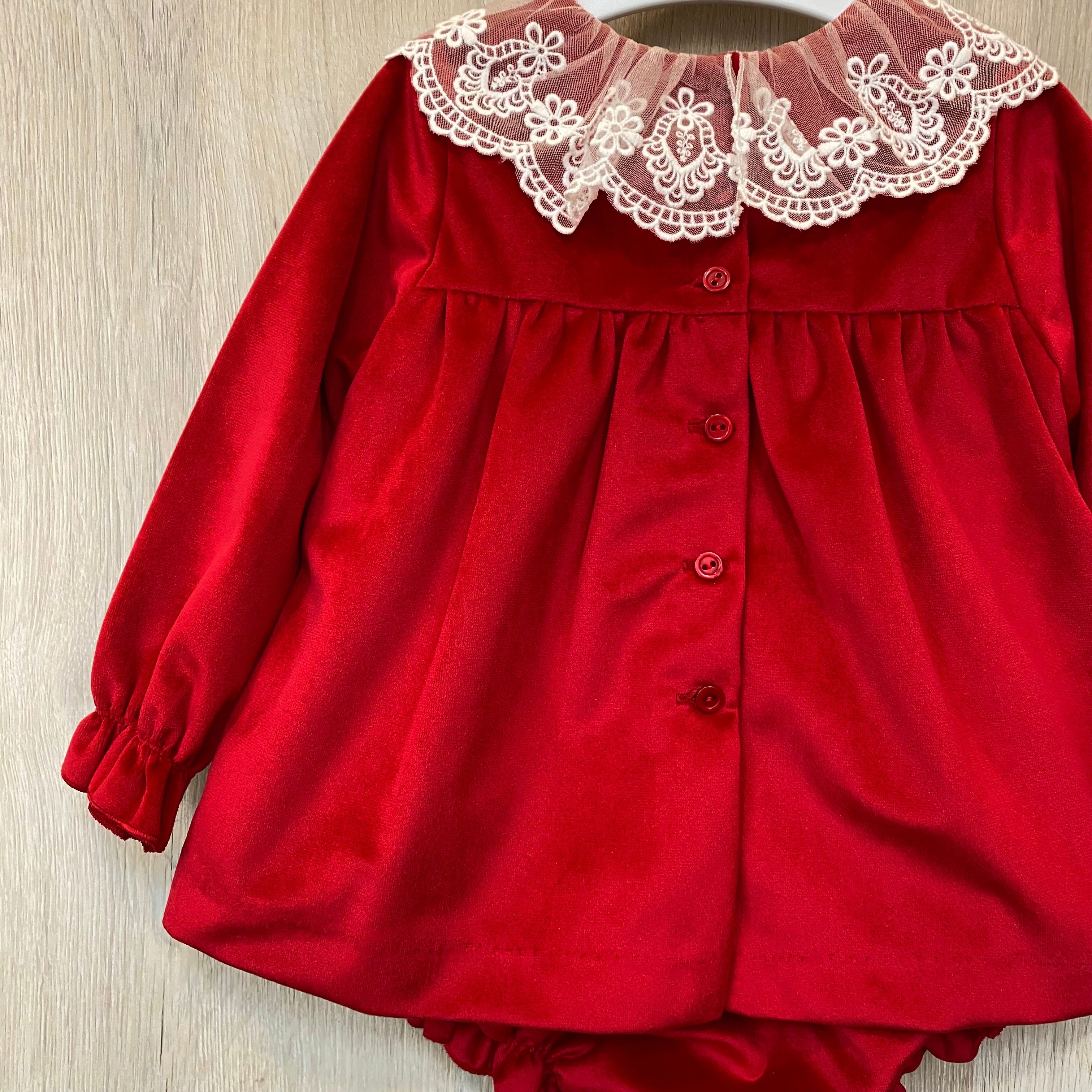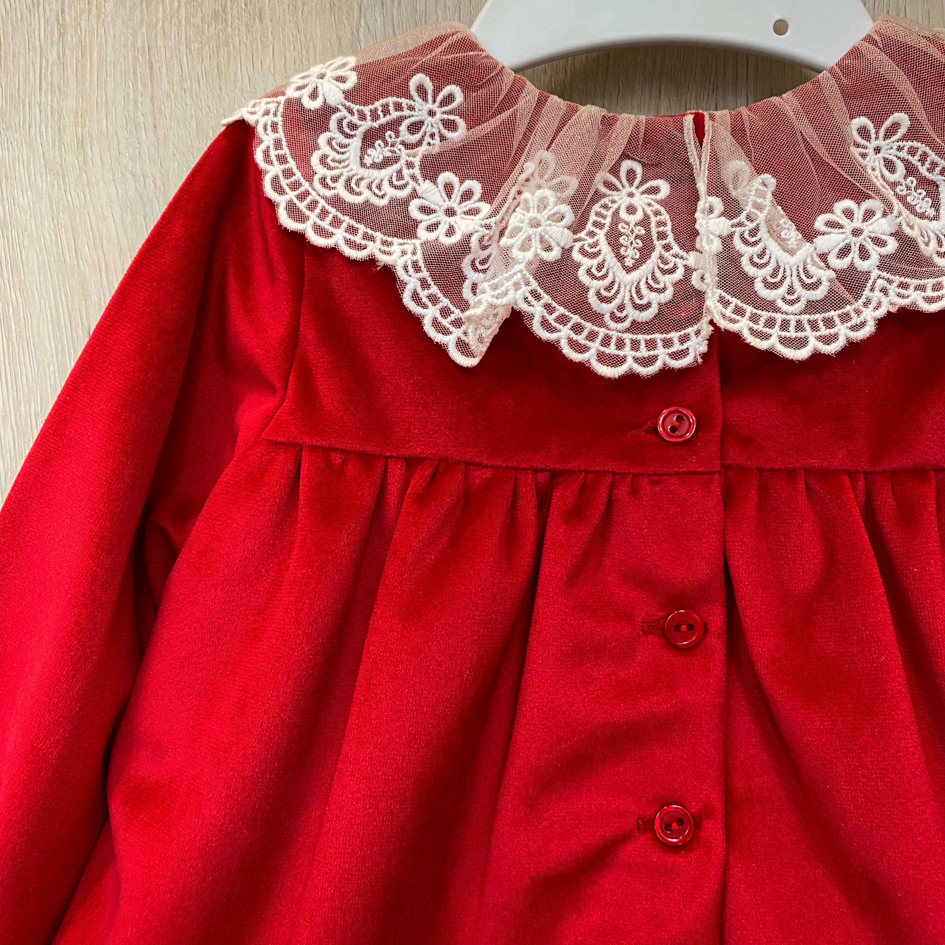 Abito manica lunga in velluto, con collo volant in pizzo.