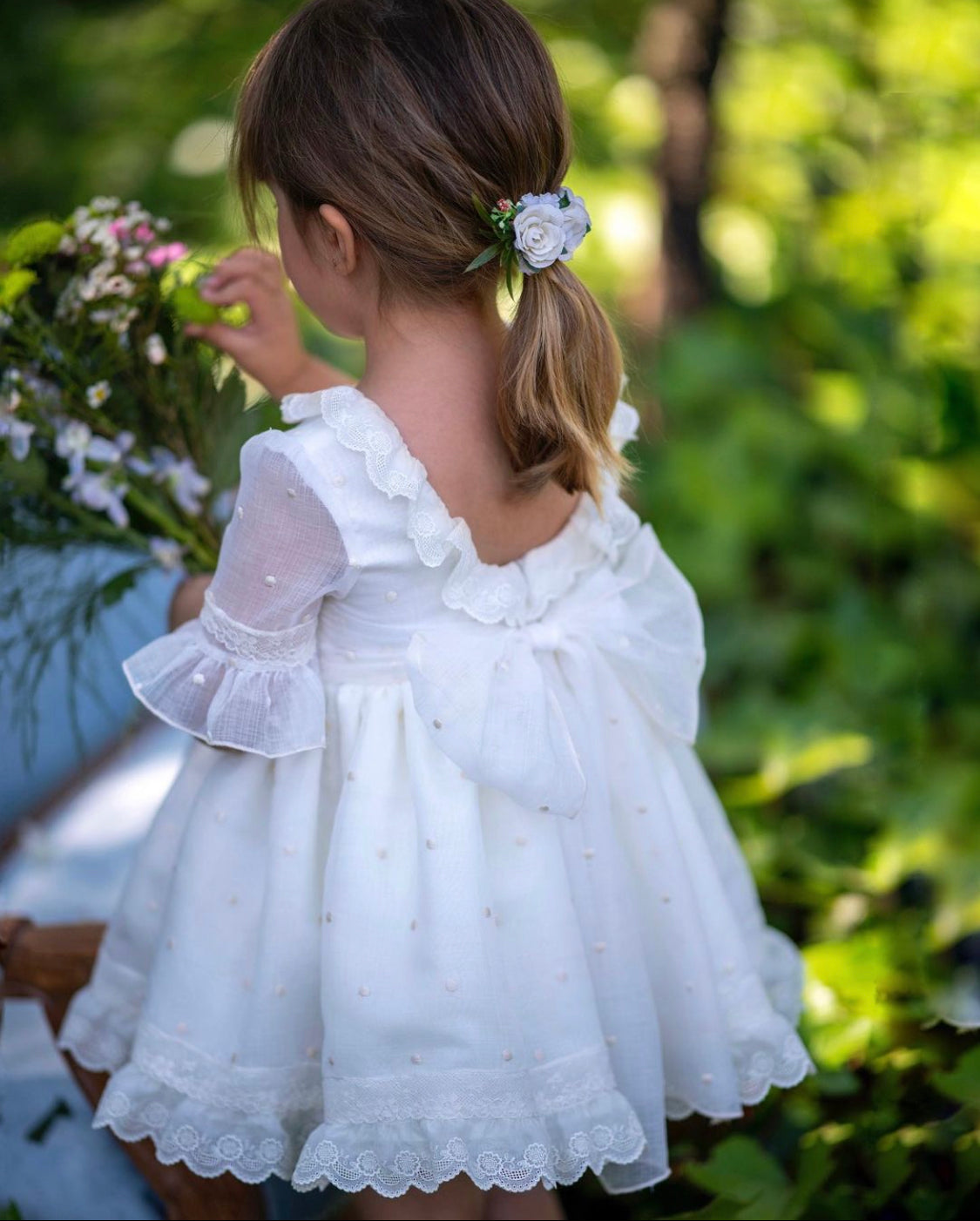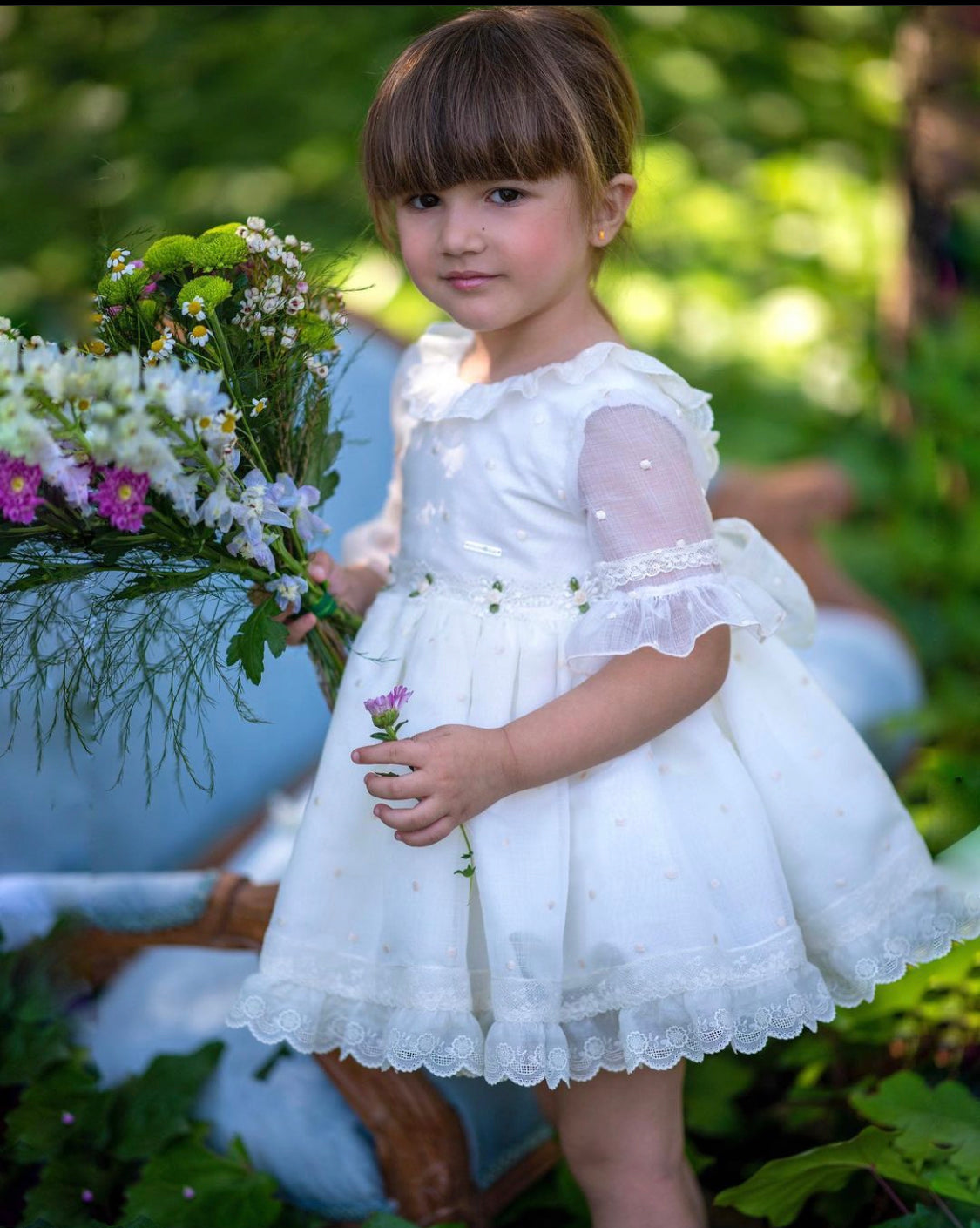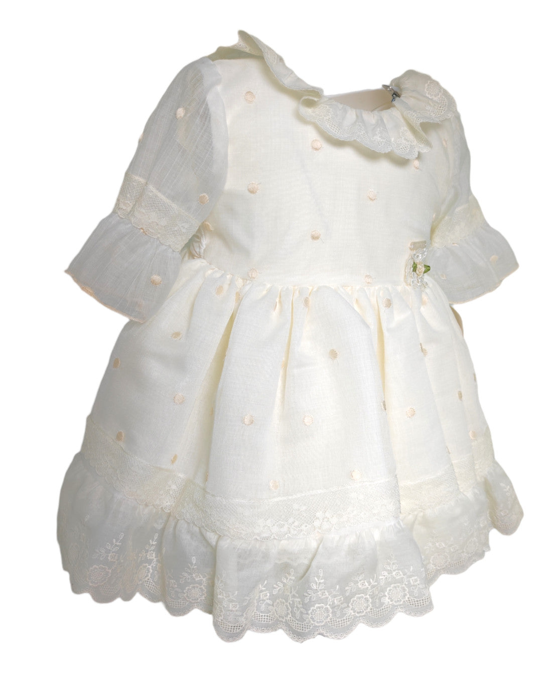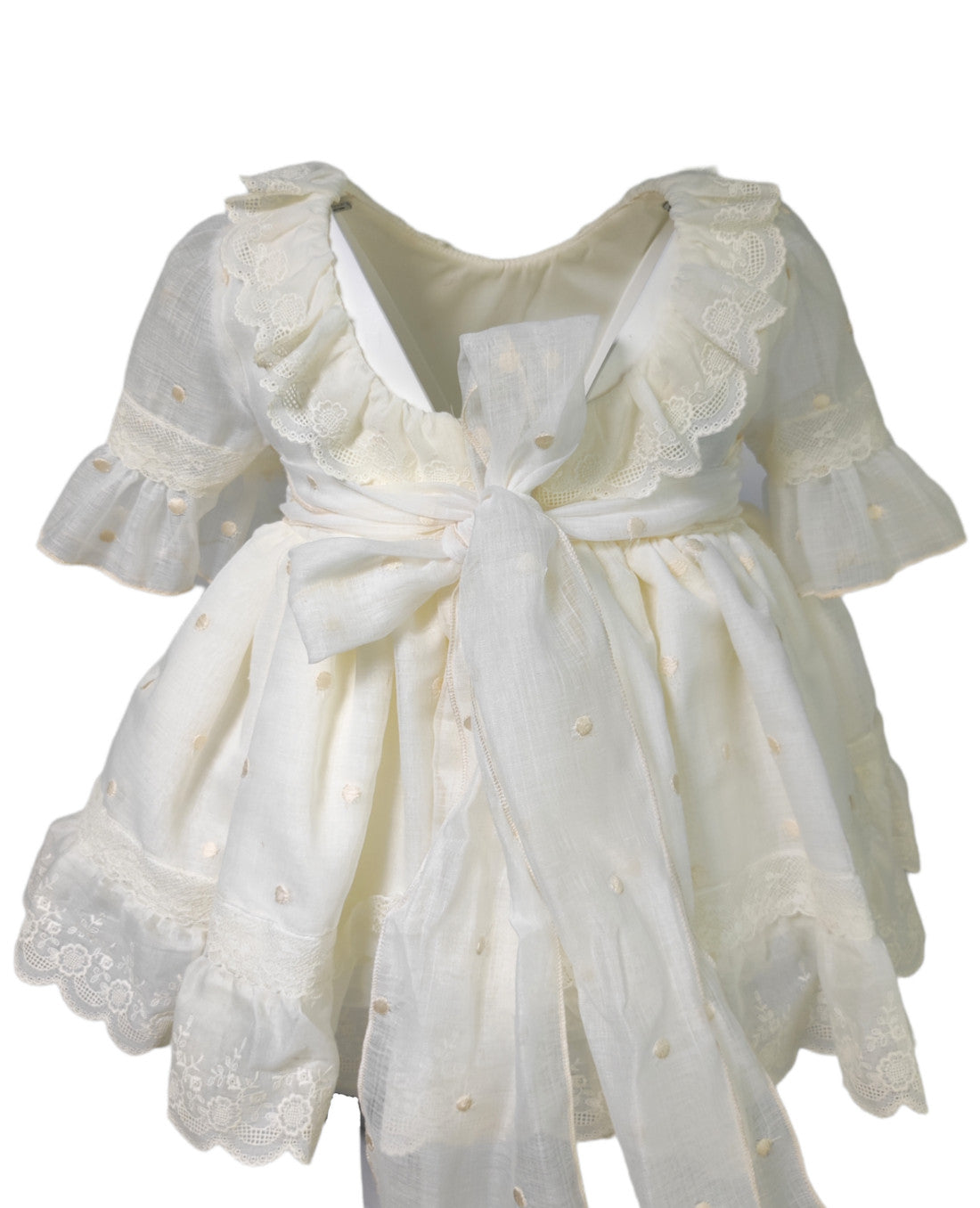 Abito elegante in cotone, ricoperto da strato di cotone finissimo con ricami pois.