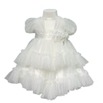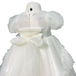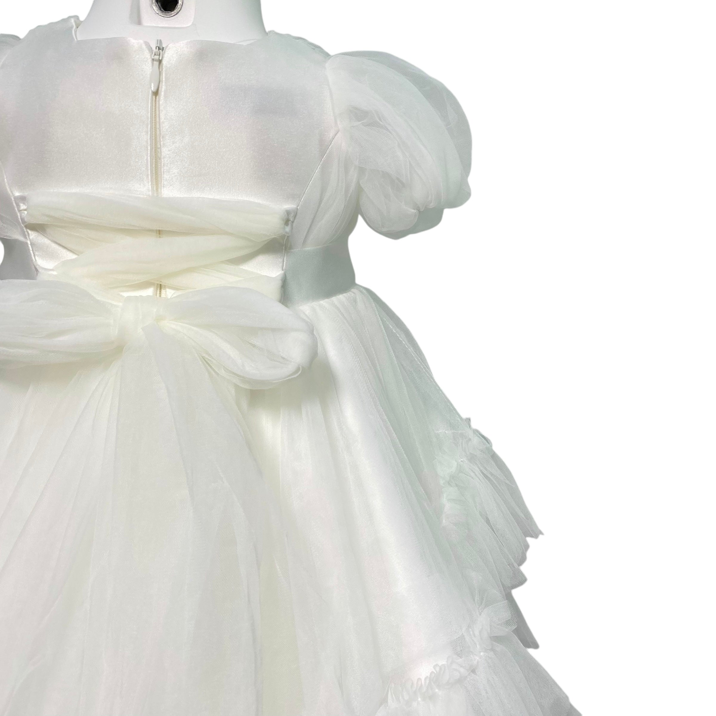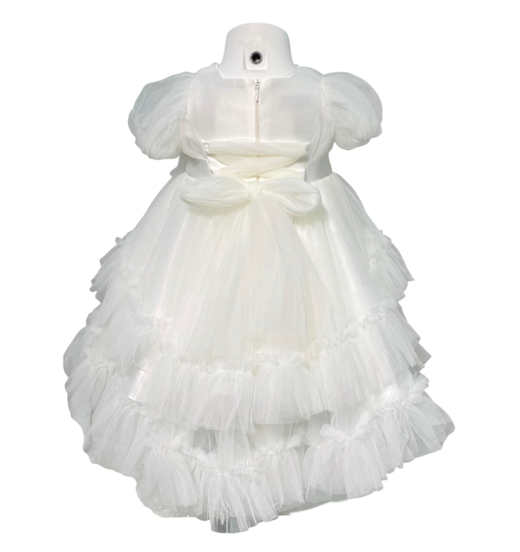 Scopri l'eleganza e la raffinatezza dell'Abito Elegante Battesimale Con Code' Neonata PETIT. Realizzato con un corpetto in raso e balze in tulle, questo abito è impreziosito da una fascia in vita con fiori di strass e una chiusura sul retro con fioccone. La mezza manica a palloncino e la zip invisibile per la chiusura garantiscono un fit perfetto. Prodotto in Italia con alta qualità.