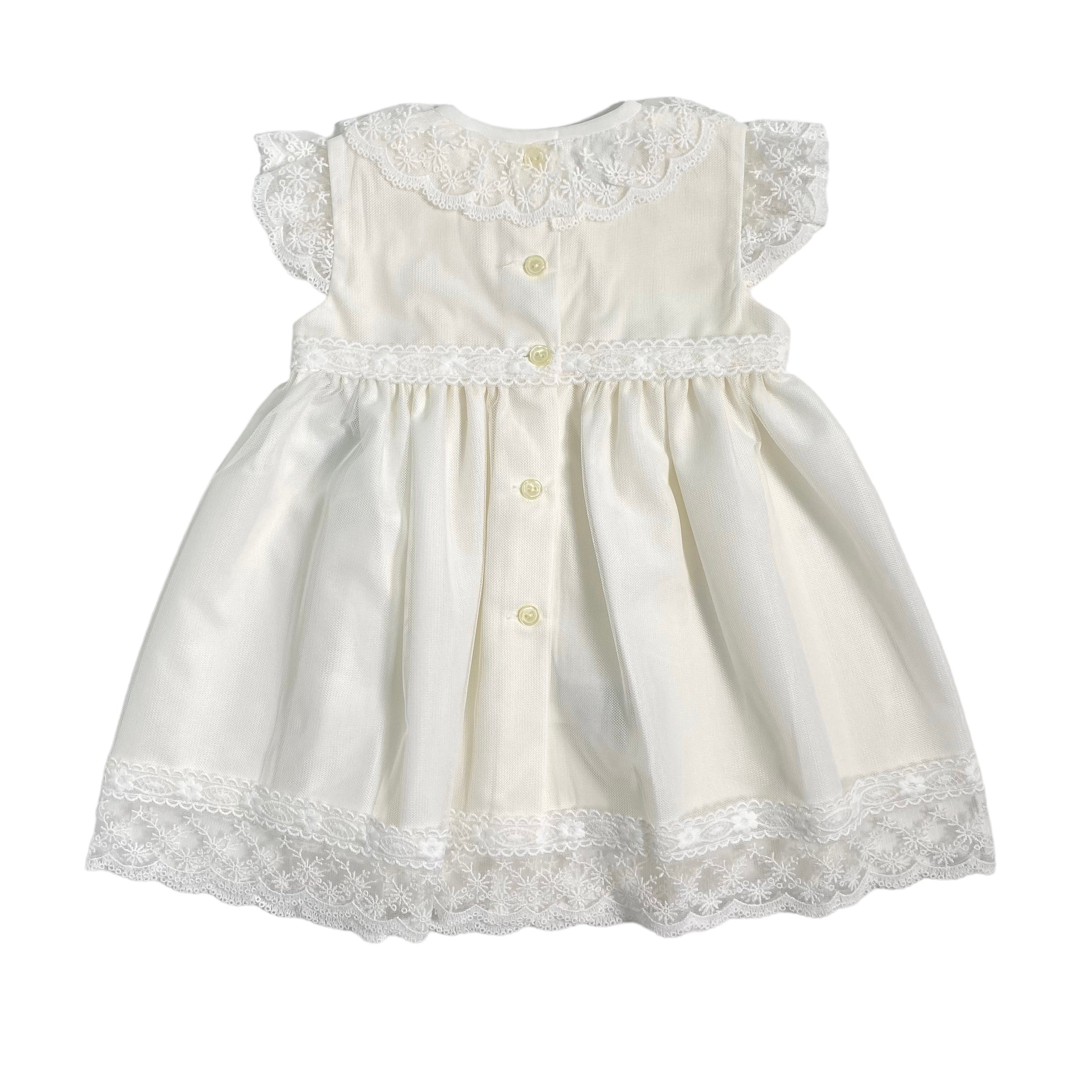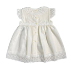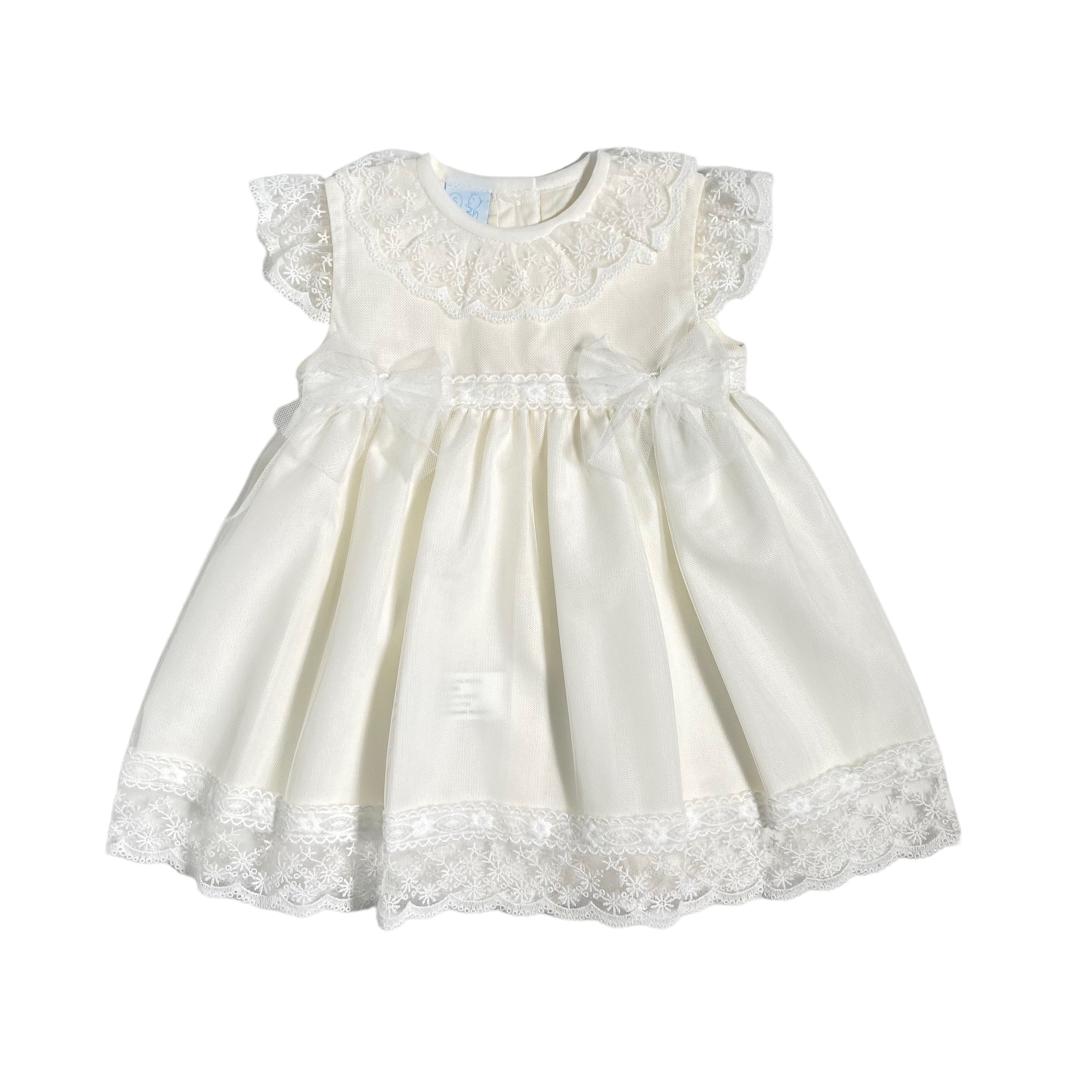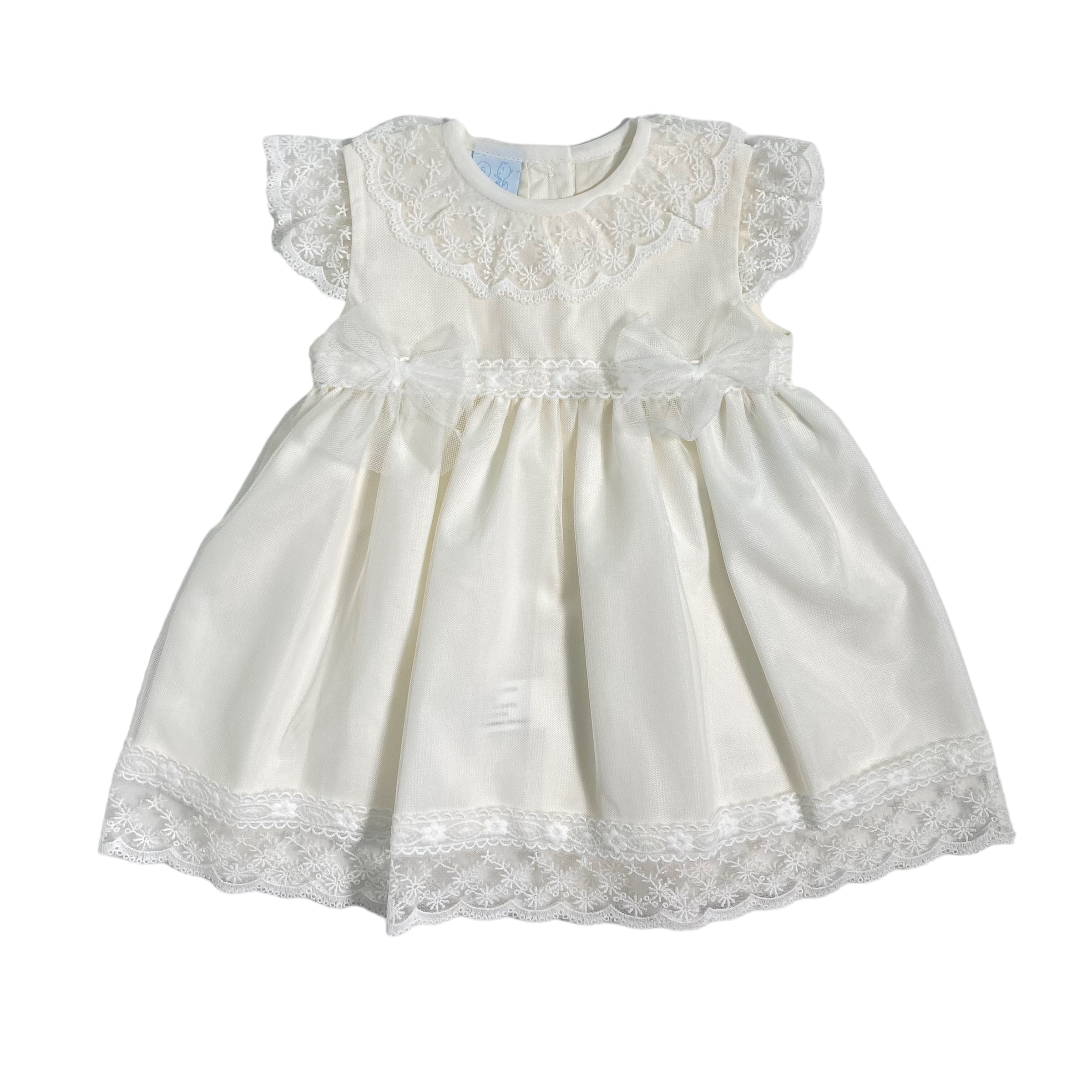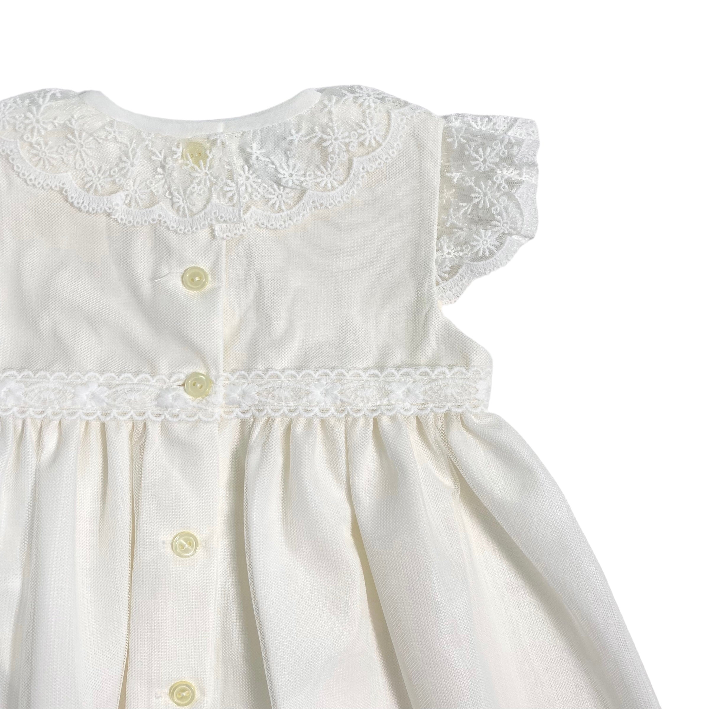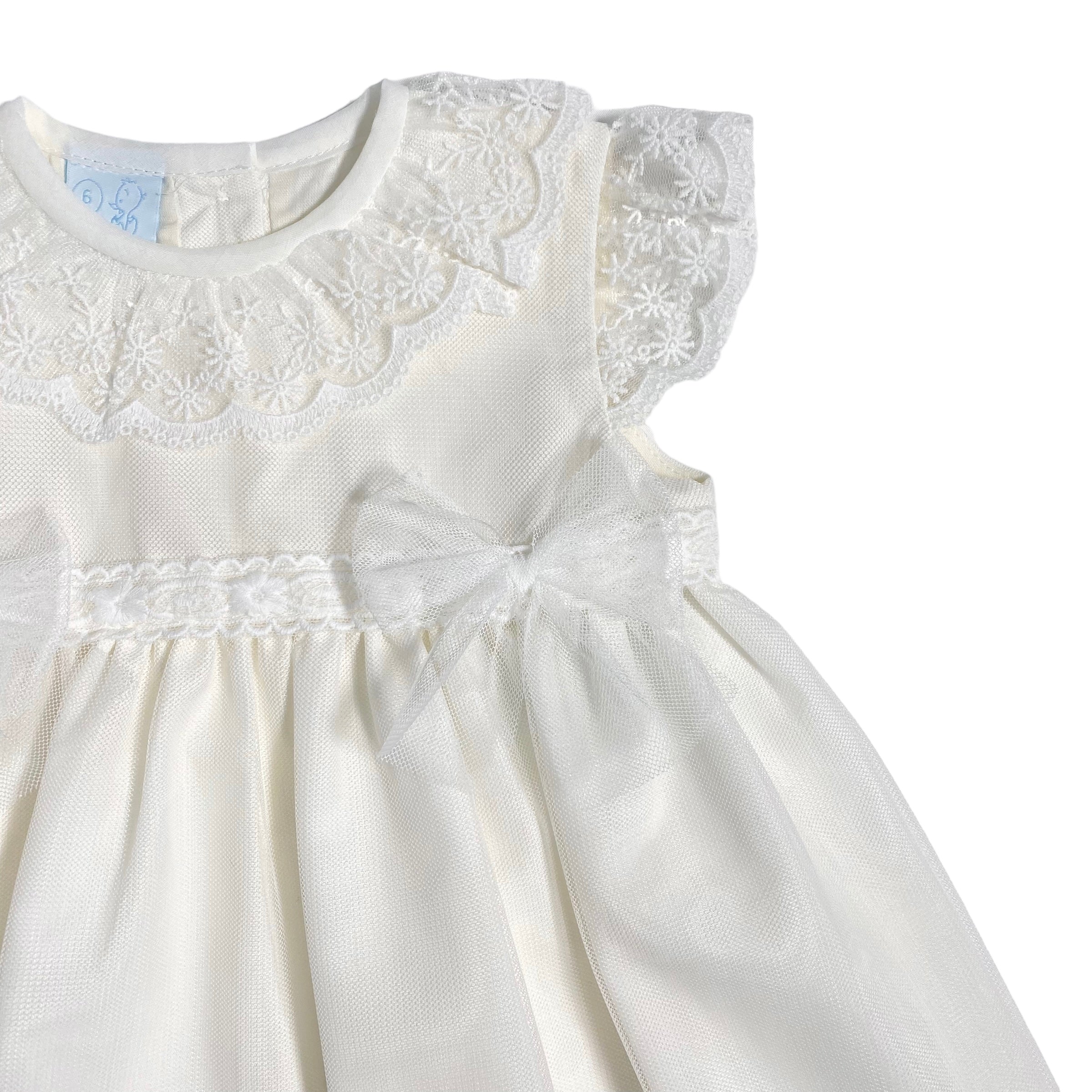 Abito elegante battesimale in tulle, con collo , fondo e manichetta in pizzo e applicazione di fiocco sul petto.