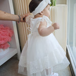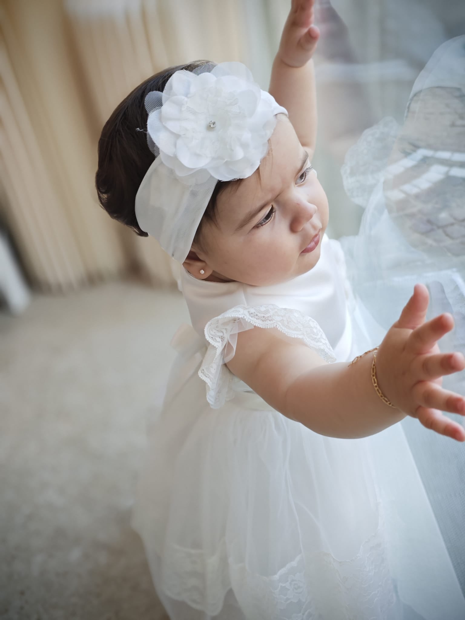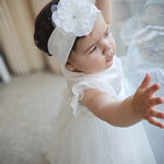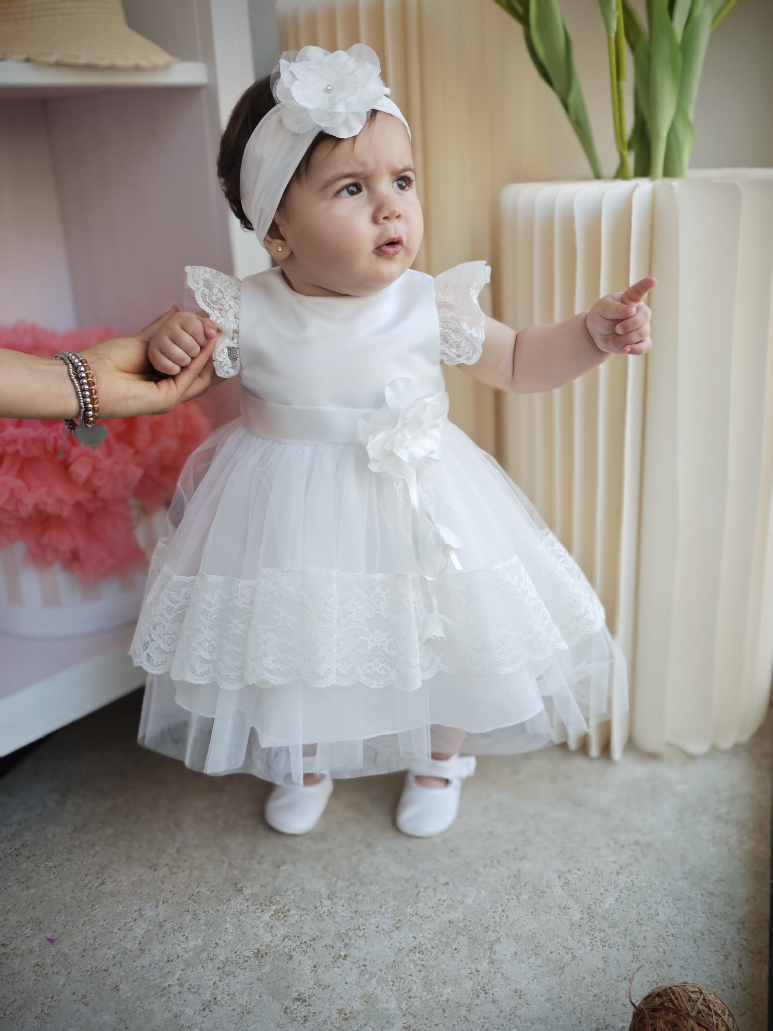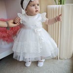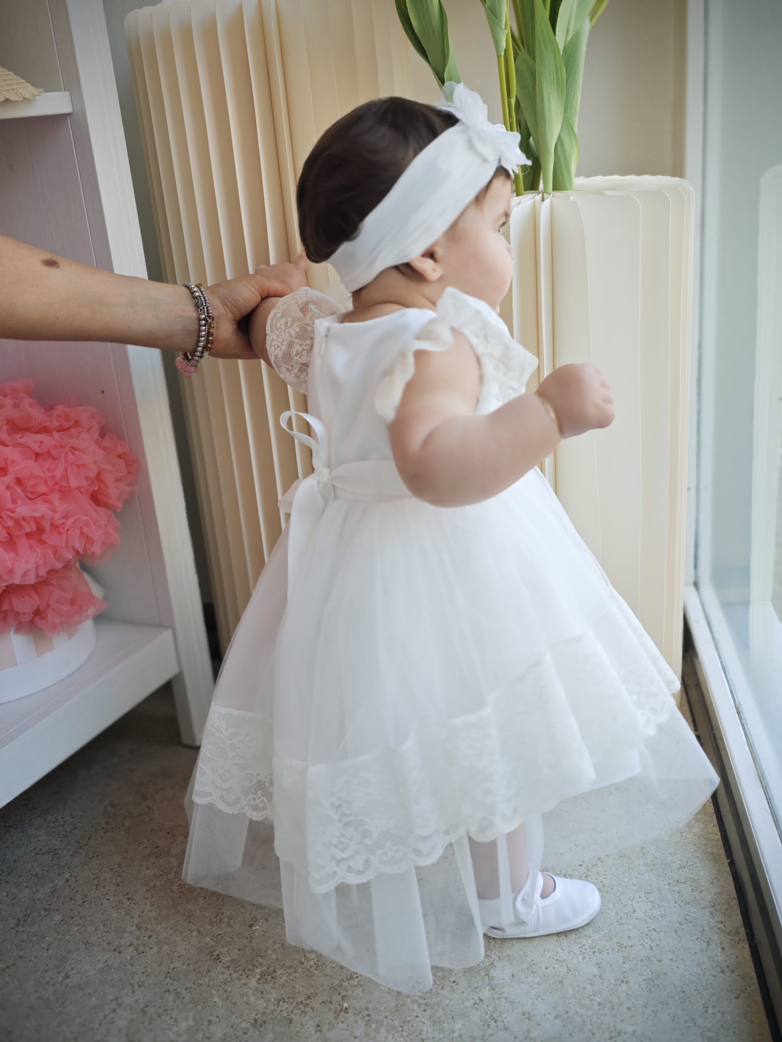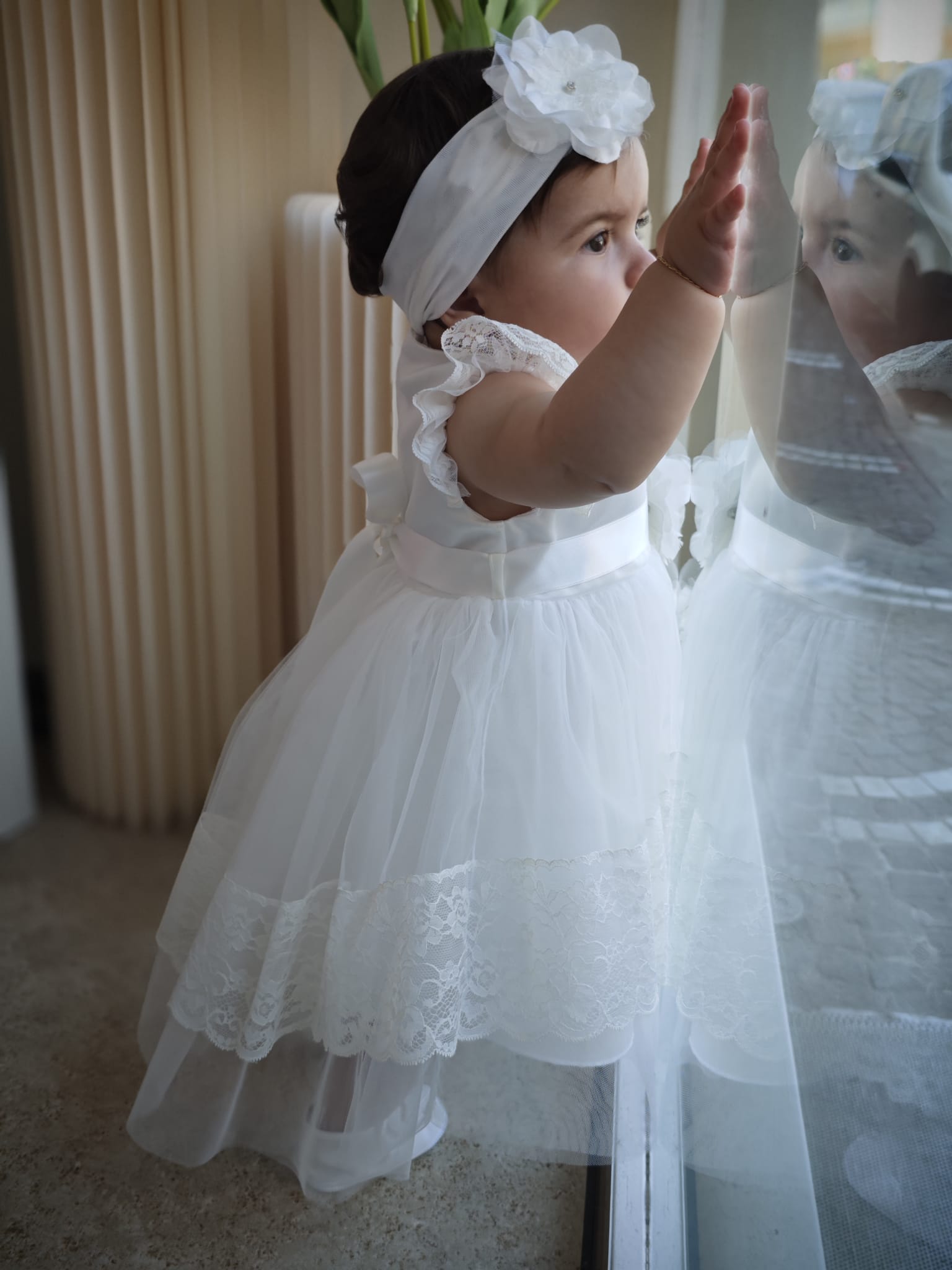 Questo abito elegante battesimale in tulle e pizzo è perfetto per la tua bambolina. La fascia in vita completa il look e l'applicazione di pizzo aggiunge un tocco di classe. L'abito è adatto per eventi battesimali e altre occasioni speciali, garantendo un aspetto elegante e raffinato.