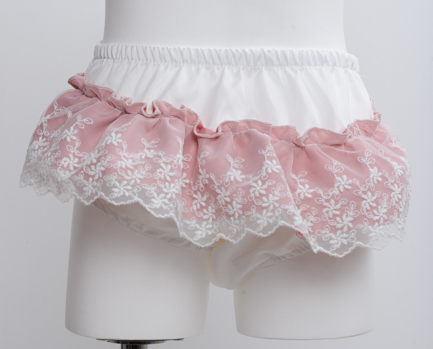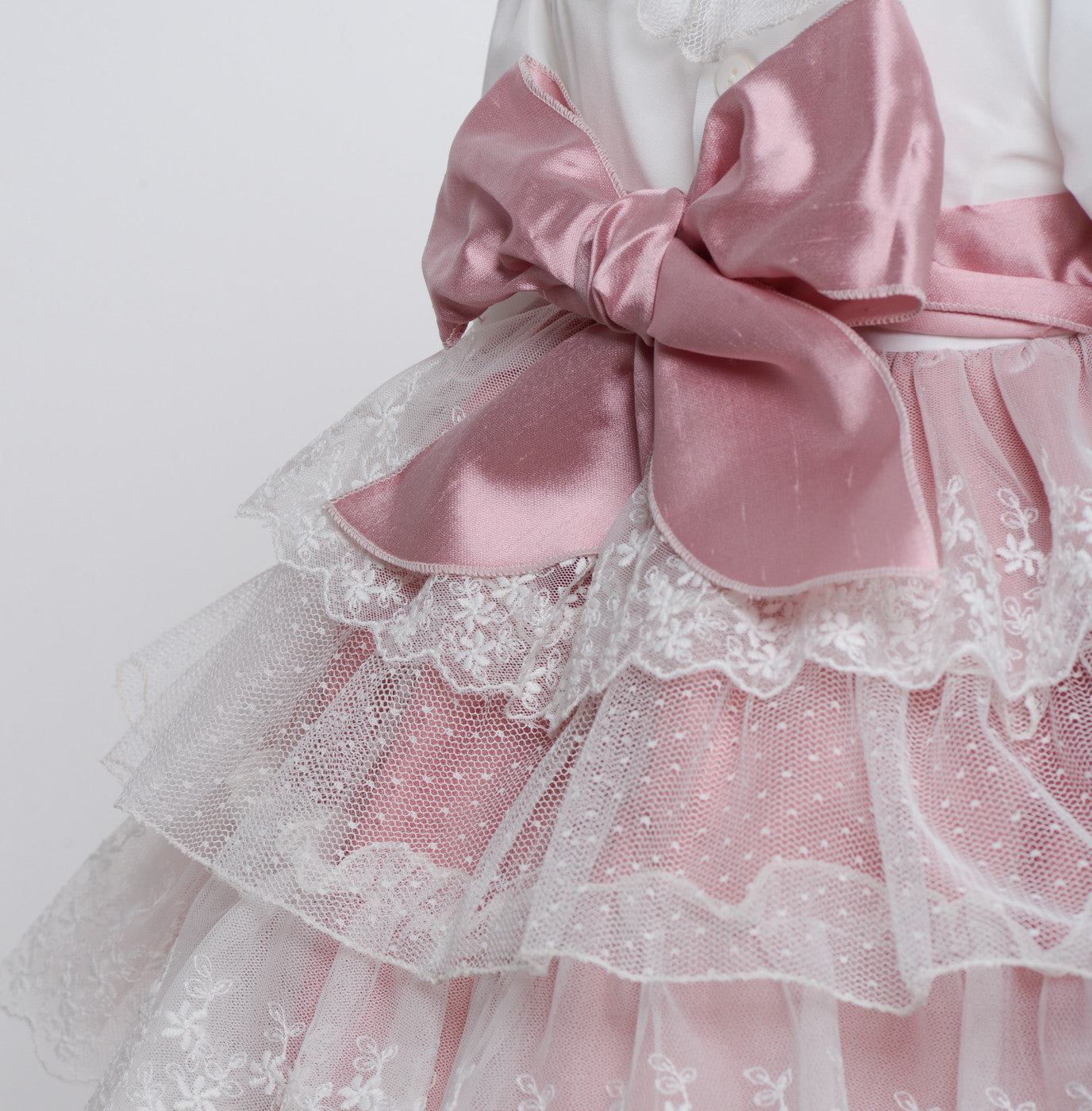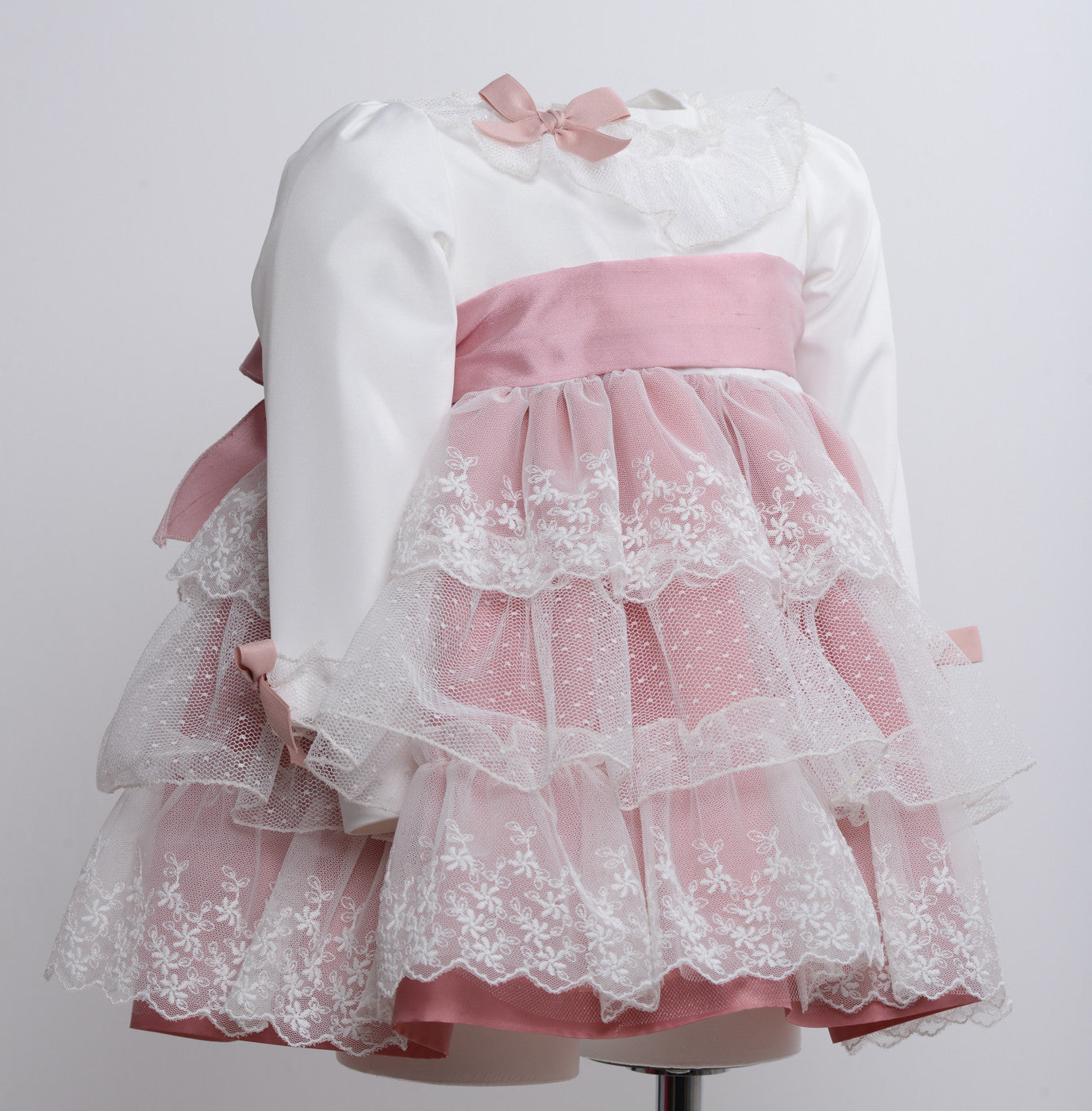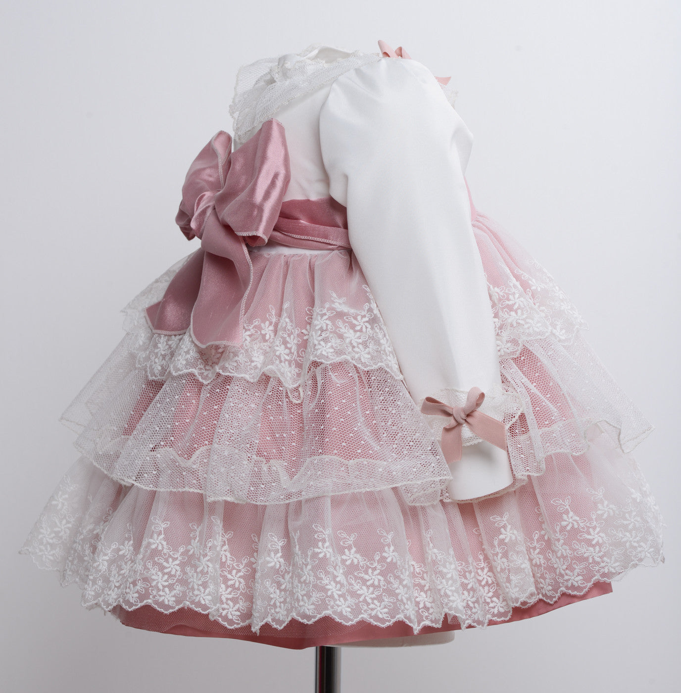 Abito battesimale elegante cerimonia con culotte per lei in taffetà manica lunga bianco con contrasto rosa.