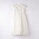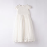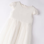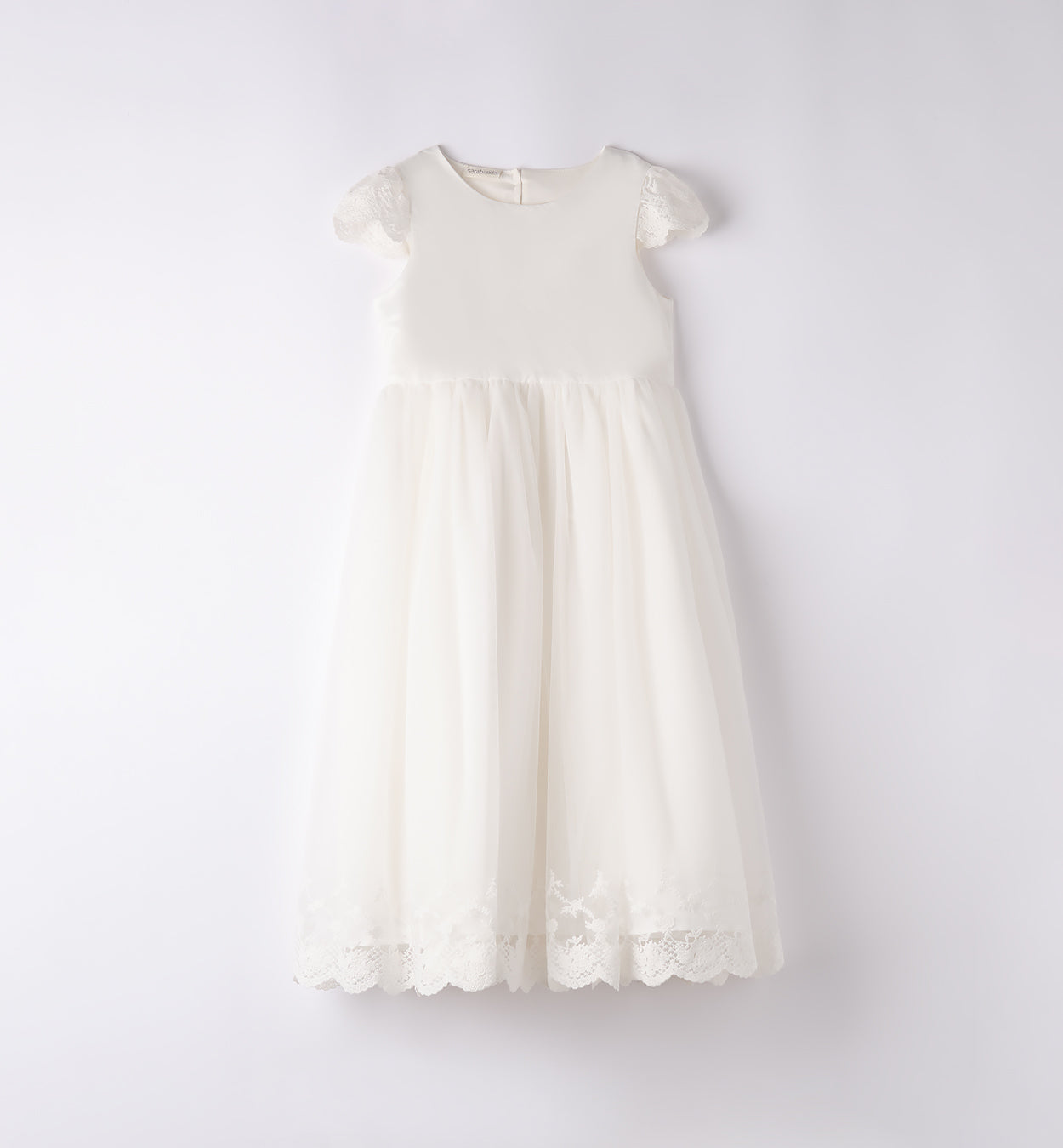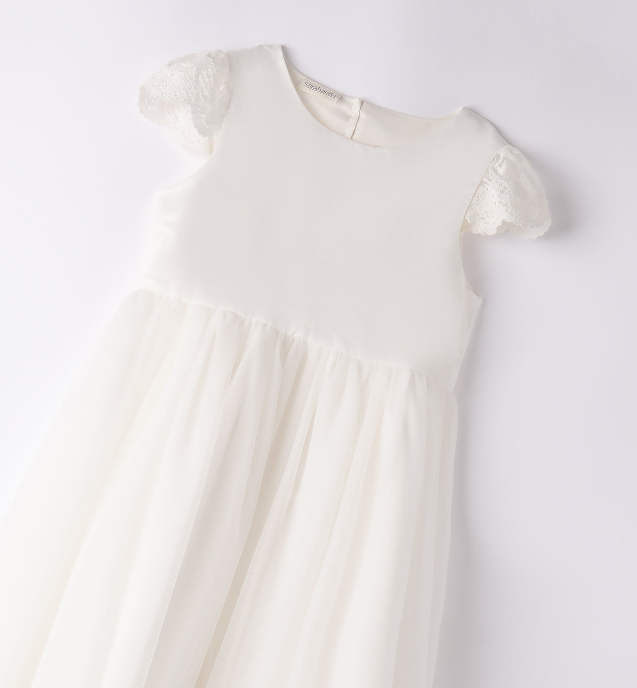 Questo elegante abito per ragazze Sarabanda è perfetto per le occasioni speciali. Realizzato in tessuto satin e tulle, il modello presenta apertura sul retro con bottoni, maniche in pizzo e una fantasia tinta unita. Con una lunghezza sopra al ginocchio, aggiunge un tocco di eleganza e femminilità al guardaroba delle giovani fashioniste.