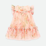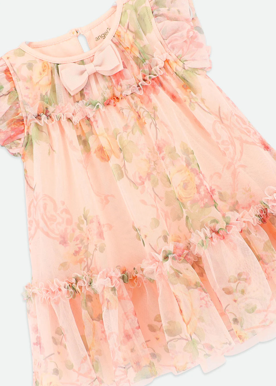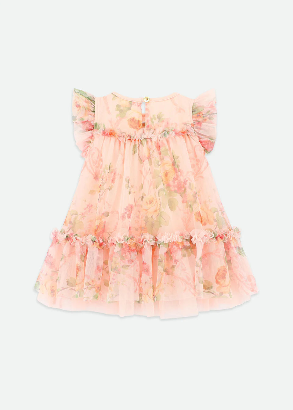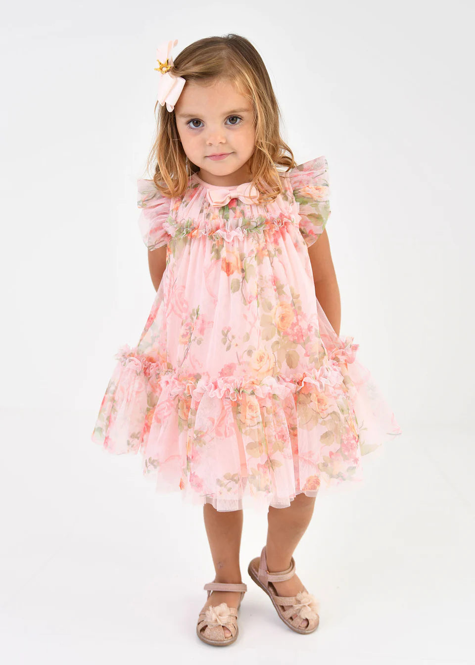 Voluminoso abito da festa in tulle per bambina. Questo lussuoso abito in tulle è decorato con uno squisito disegno floreale, completamente foderato in morbido misto cotone elasticizzato. L'abito è completato da un fiocco e da un ciondolo a cuore dorato sulla scollatura e si chiude sul retro con un bottone dorato.
