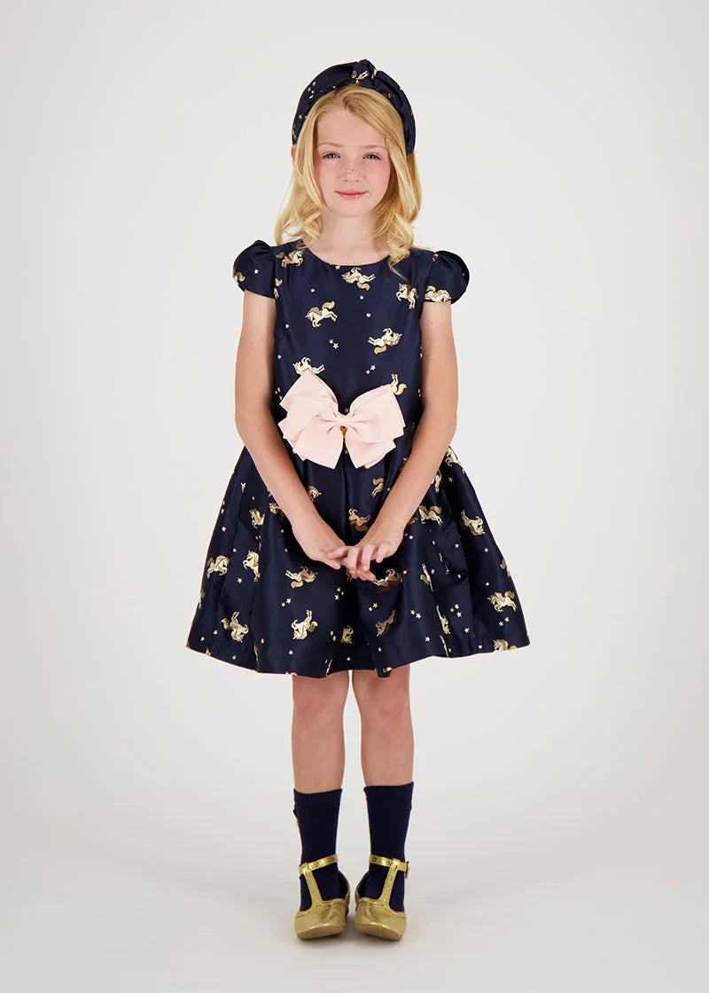 L'Abito Elegante Jacquard Fantasia Unicorno Bambina ANGEL'S FACE DESIREE è un abito magico realizzato in esterno in 100% poliestere, foderato in 100% poliestere per una migliore resistenza. Presenta graziose maniche a petalo, chiusura sul retro con zip dorata e iconico tiretto a cuore. Il tutto arricchito con il nostro fiocco firmato Angel's Face e un ciondolo a cuore d'oro al centro della vita. Splendido vestito blu scuro con unicorni dorati. Lavare in lavatrice a 30°.