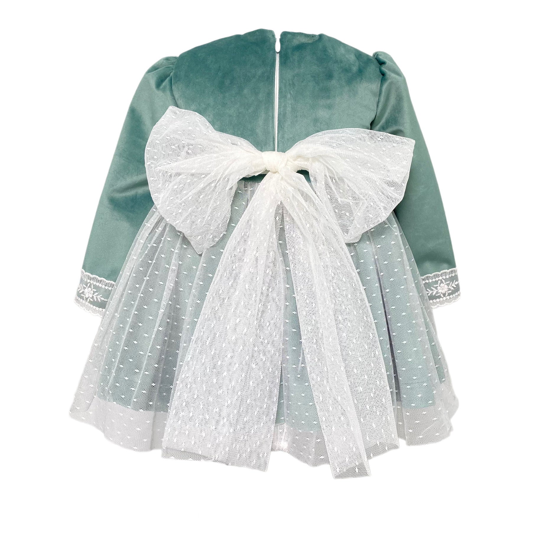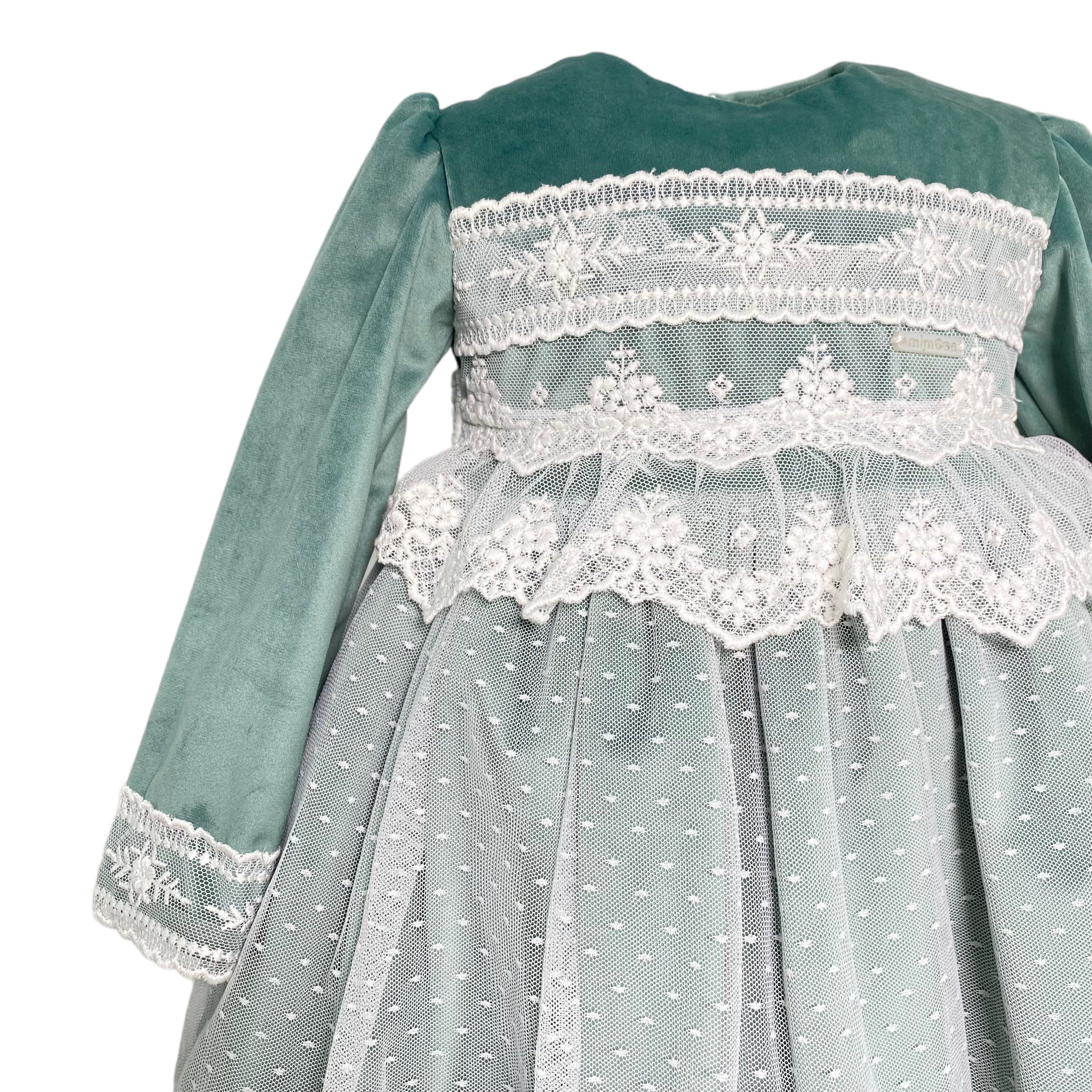 Abito elegante manica lunga in velluto verde, con applicazione di pizzi bianchi sul davanti e sulla gonna.