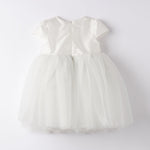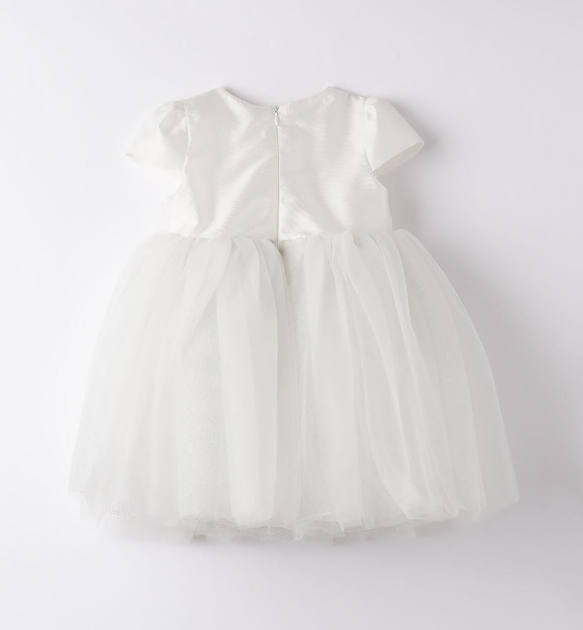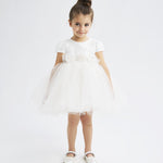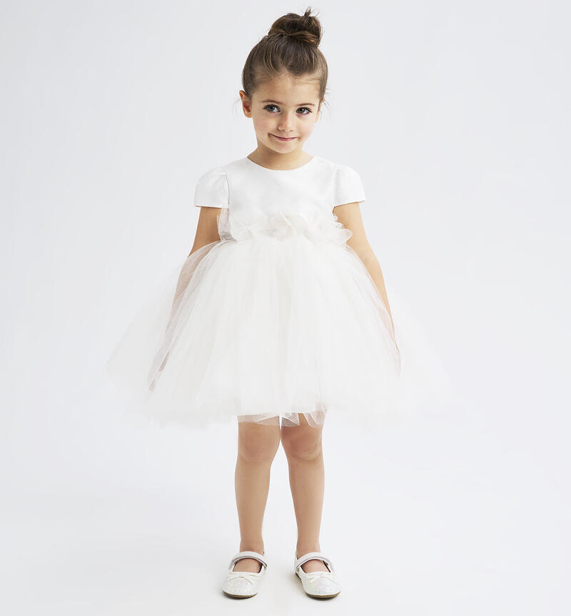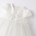 Abito cerimonia bambina Sarabanda realizzato con corpetto in tessuto mikado rivestito in tulle. Gonna in tulle. Il modello è foderato in cotone. Apertura posteriore con zip invisibile. Cintura in vita con fiori. Le maniche sono a sbuffo, la gonna in tulle è ampia e voluminosa. Lunghezza al ginocchio. L'articolo fa parte della collezione S Premium Sarabanda ideata per vestire le cerimonie più formali delle bambine