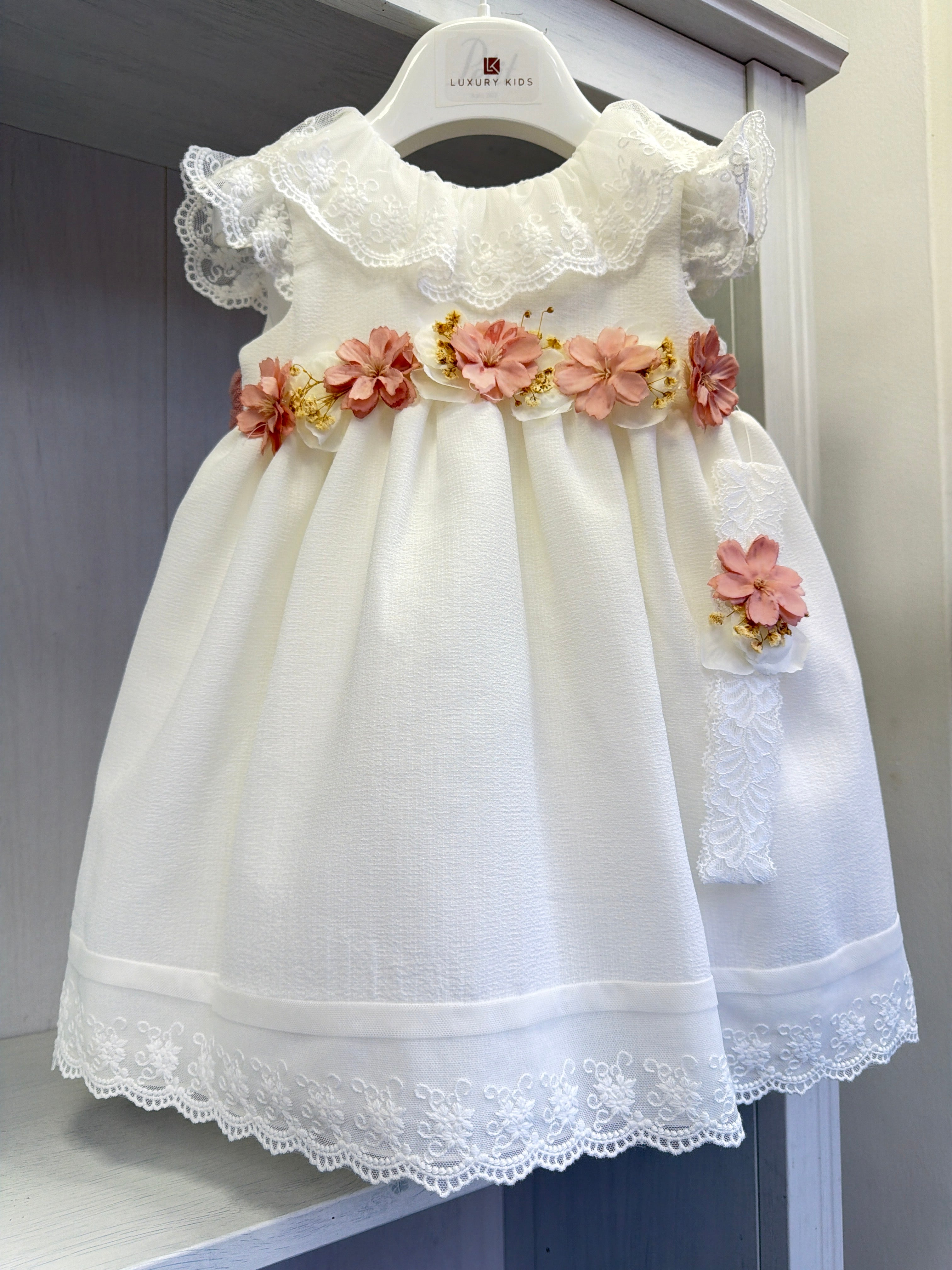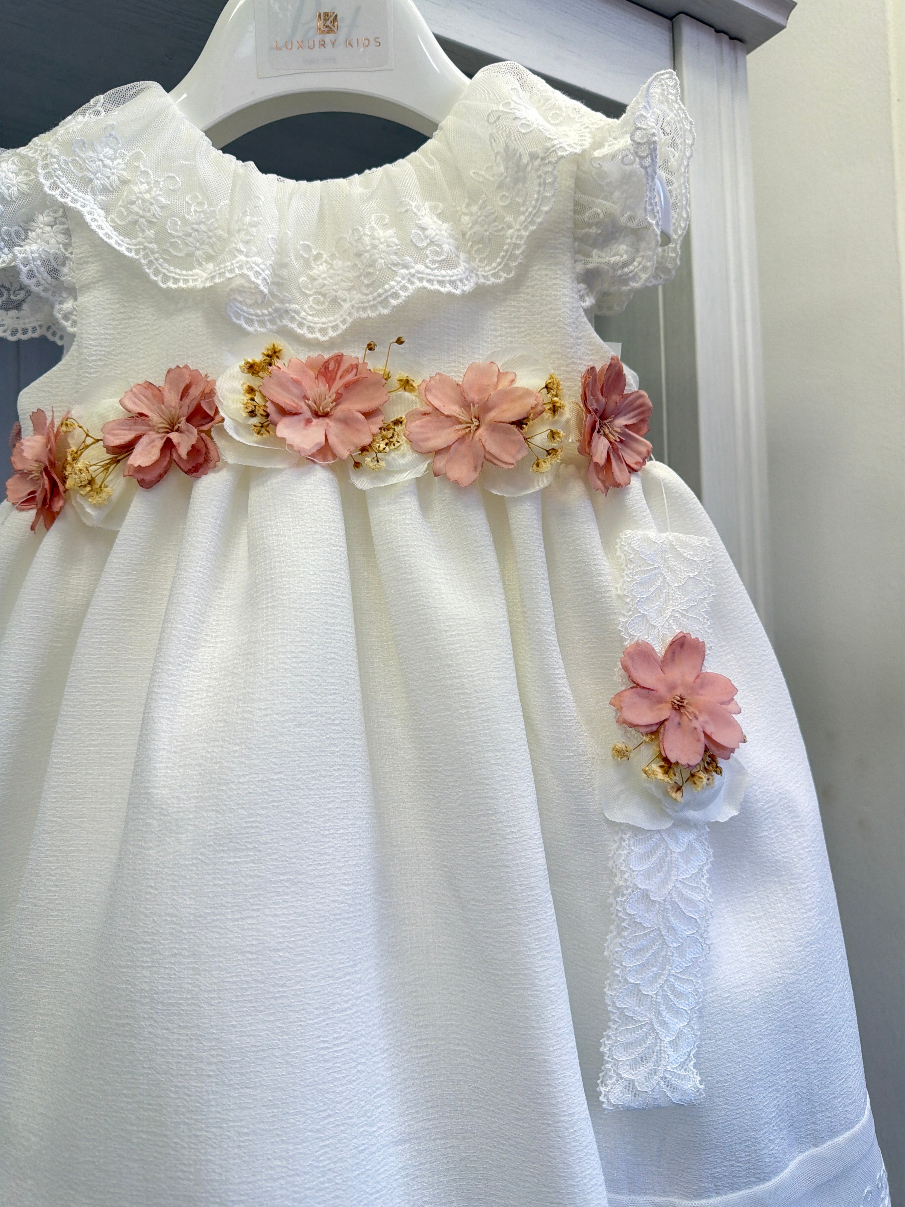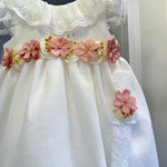 Abito battesimale smanicato in tessuto pregiato, perfetto per il giorno speciale della tua bambina. Il delicato collo volant in pizzo aggiunge un tocco di raffinatezza, mentre la cintura floreale sottolinea elegantemente la vita. La fascia coordinata completa l'ensemble con stile classico e sofisticato. Ideale per cerimonie importanti, garantisce comfort e bellezza in ogni momento della giornata.