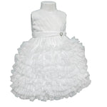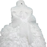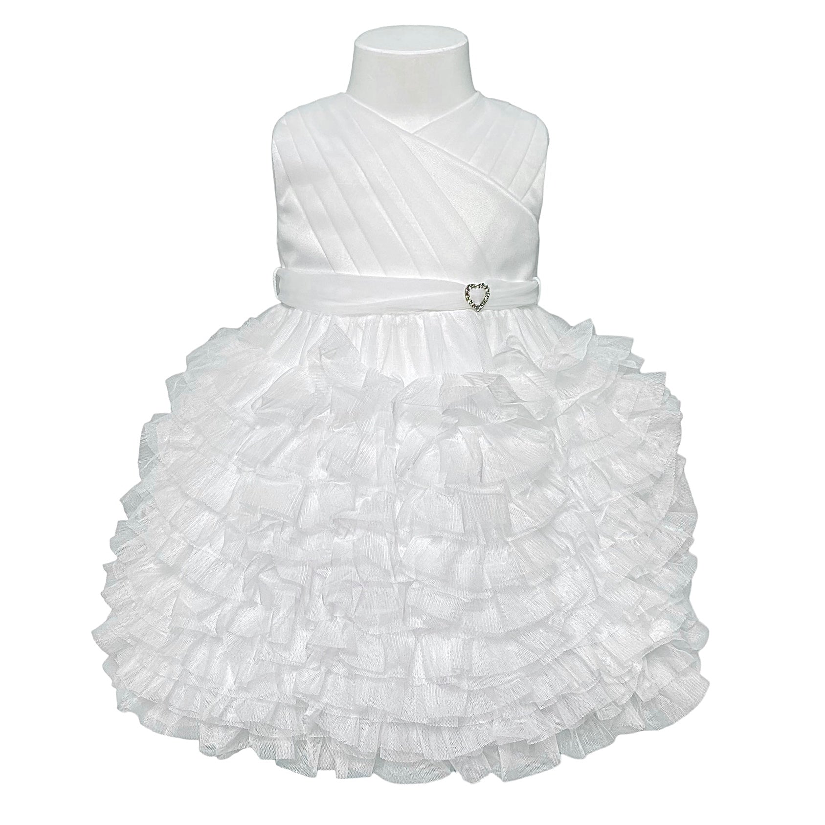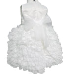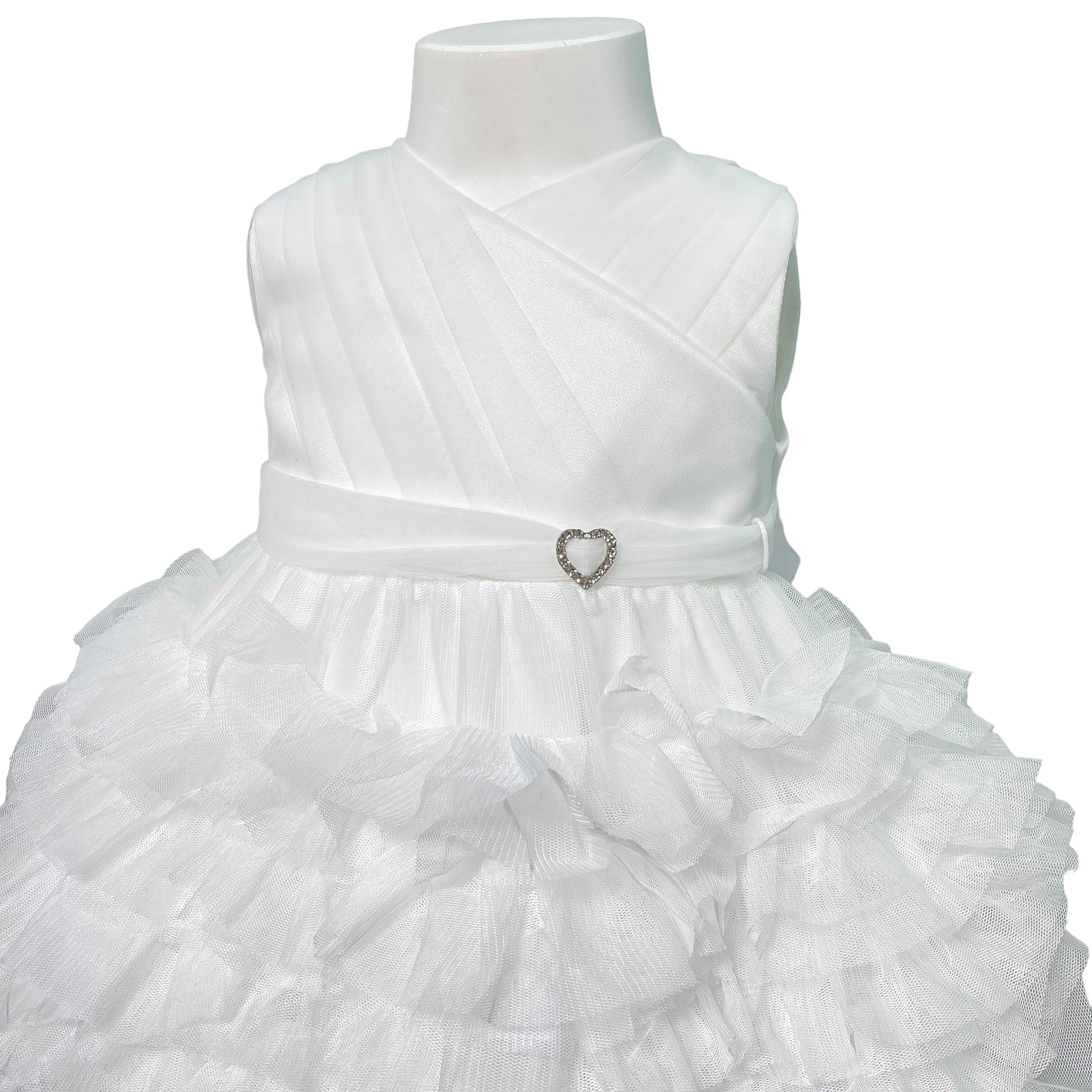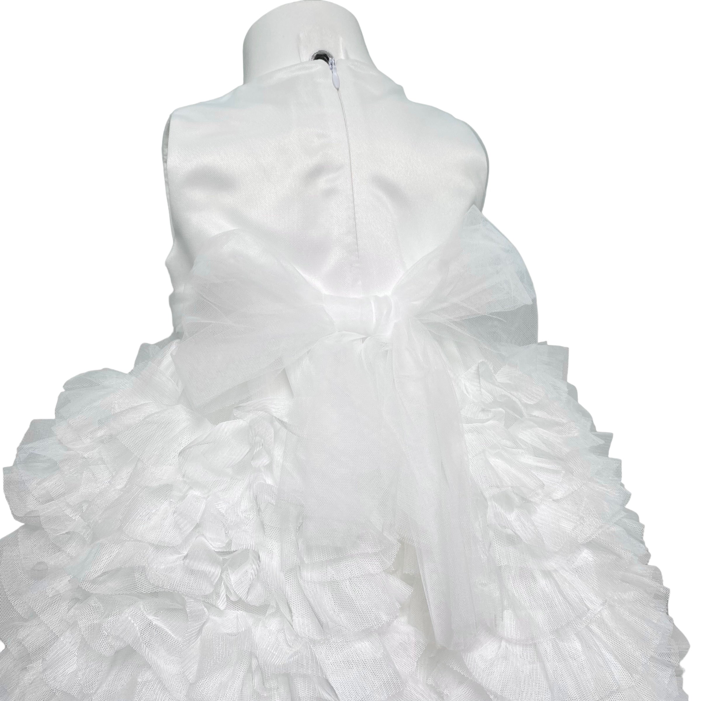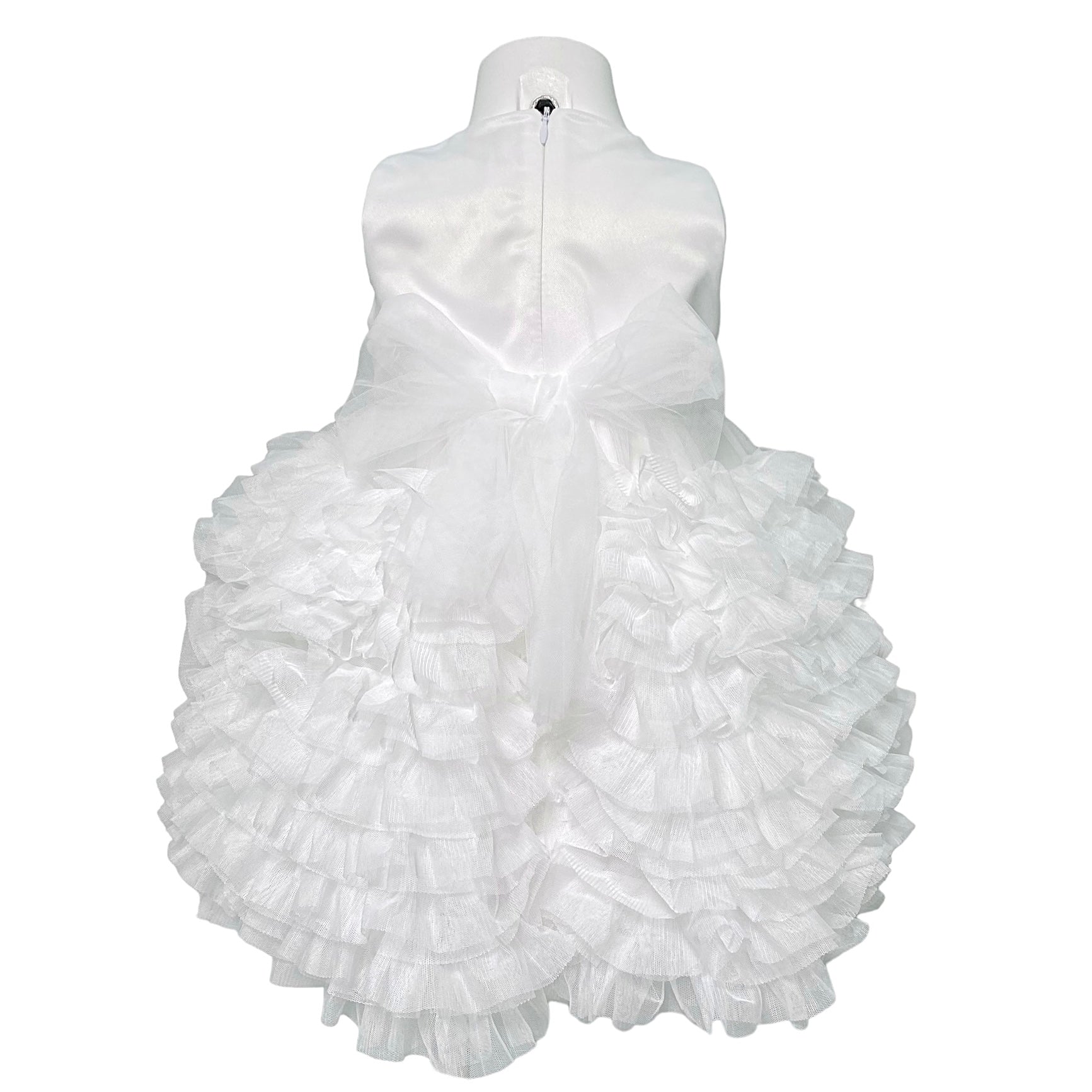 Abito elegante smanicato con corpetto in raso ricoperto di tulle, e gonna ampia con tulle arricciato.