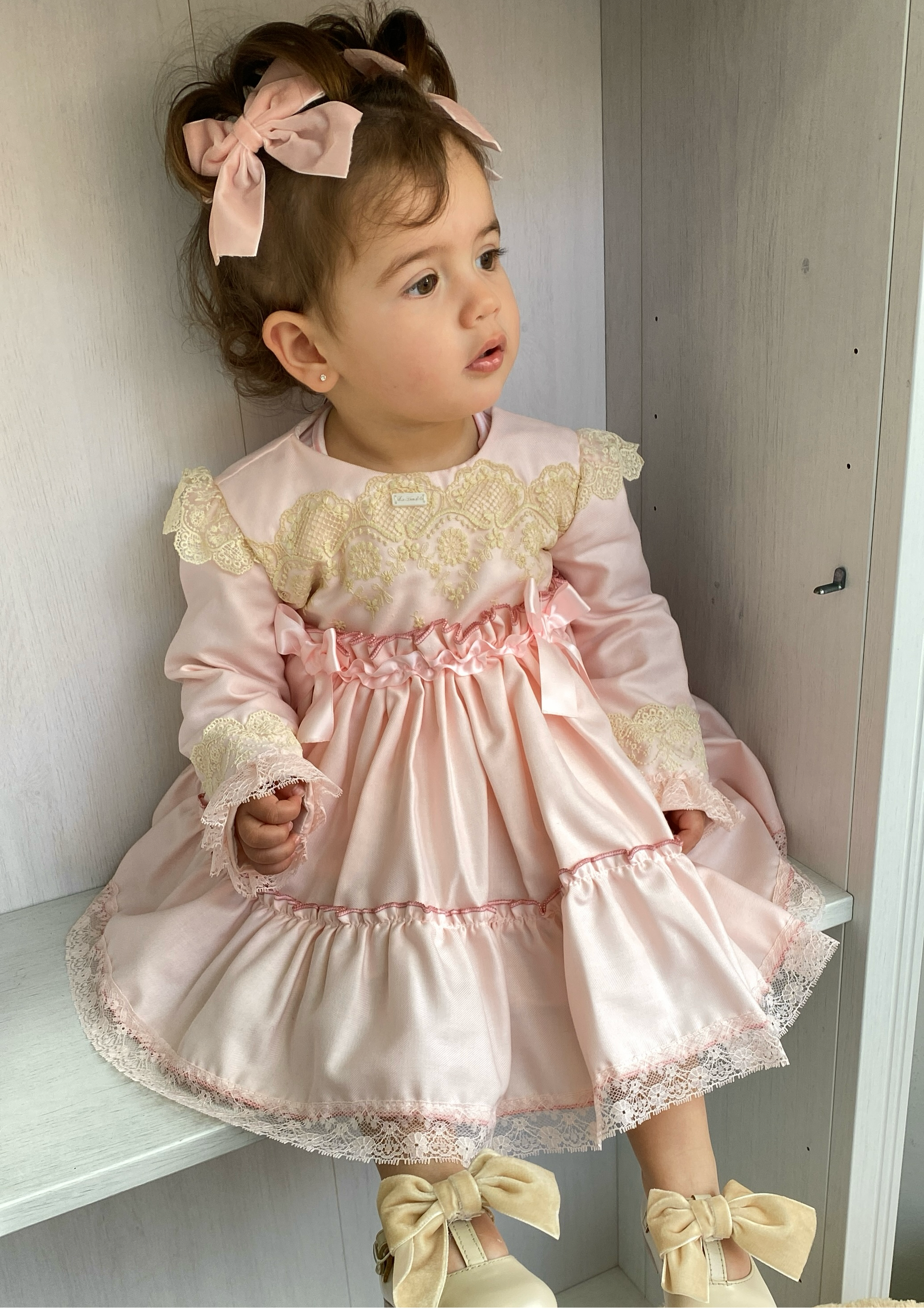 Abito manica lunga elegante svasato, con applicazione di pizzi e fiocchi rosa sul petto.