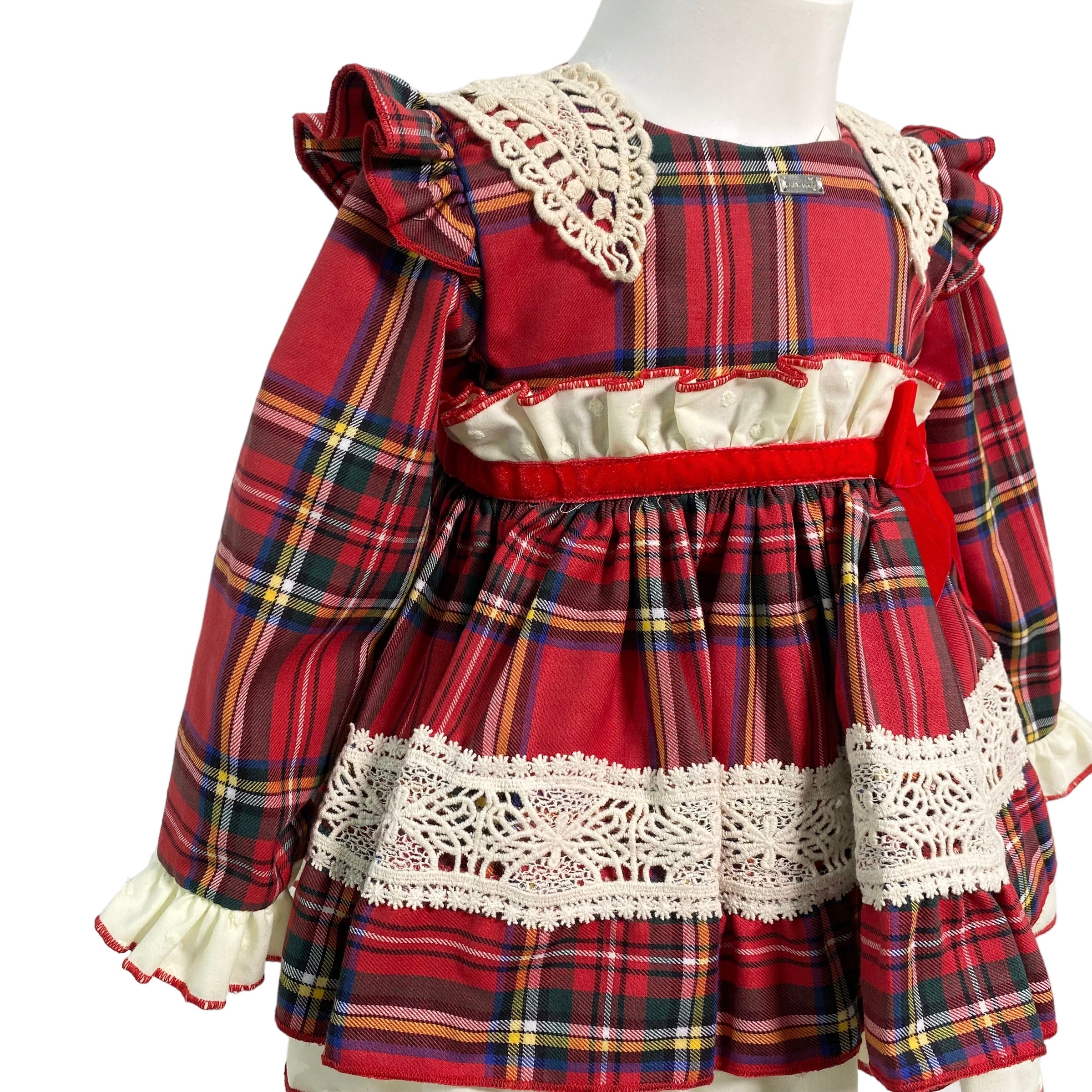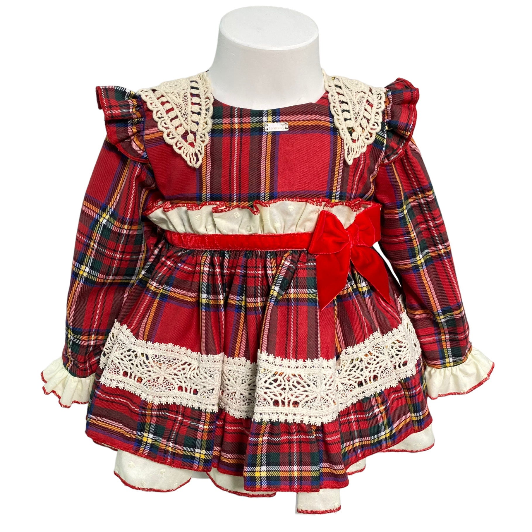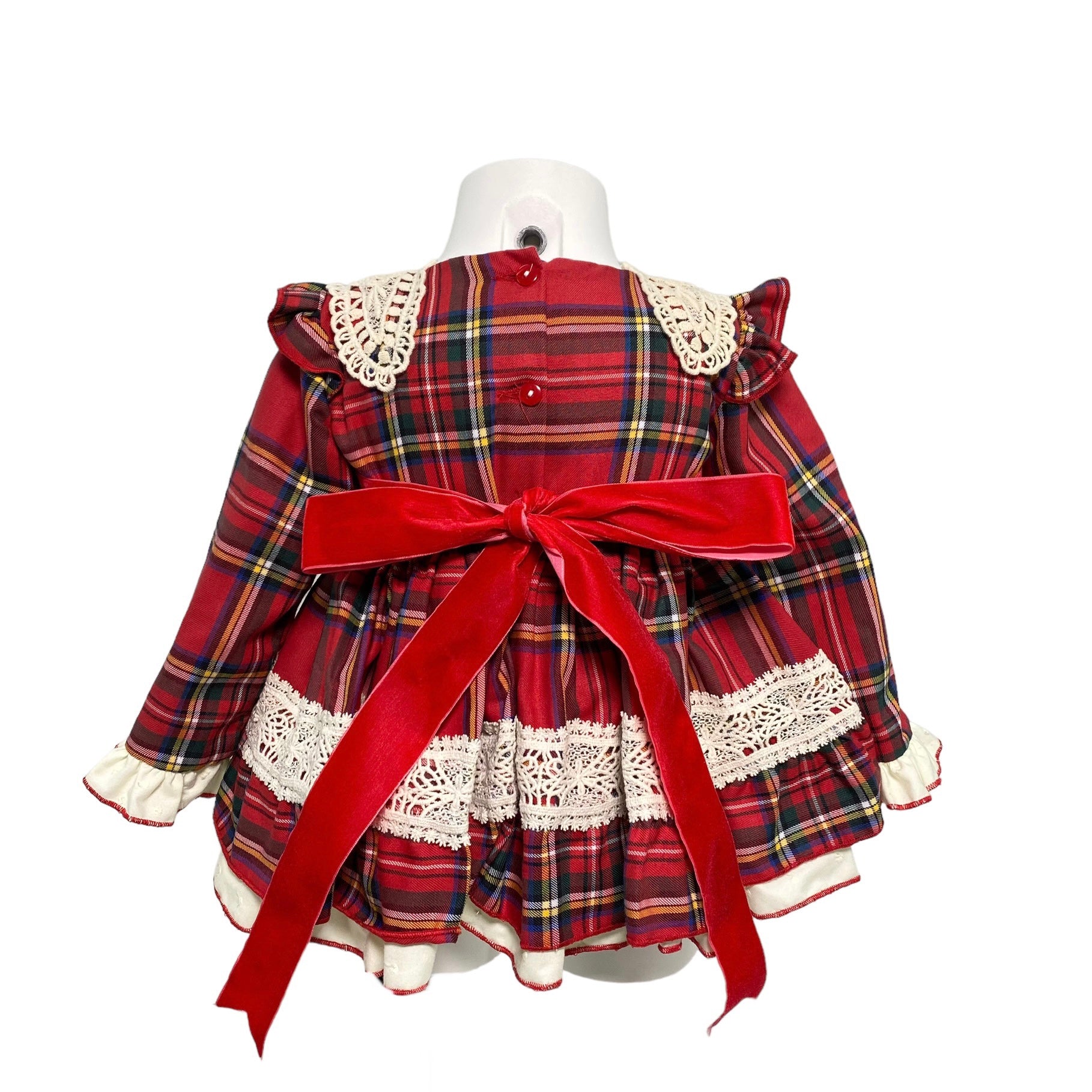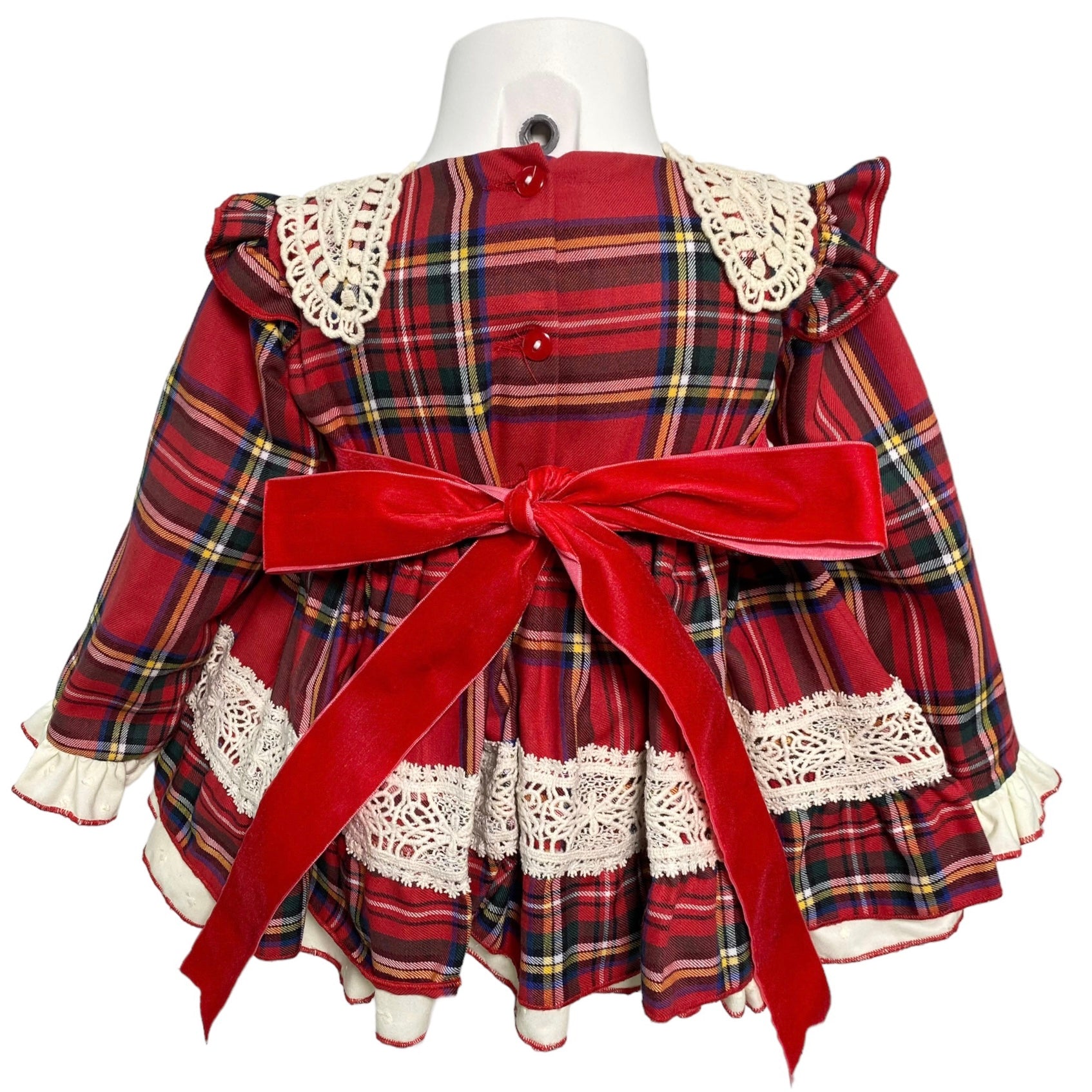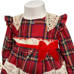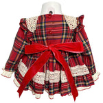 Abito manica lunga elegante svasato, fantasia scozzese, con balze e fiocco in velluto rosso in vita.