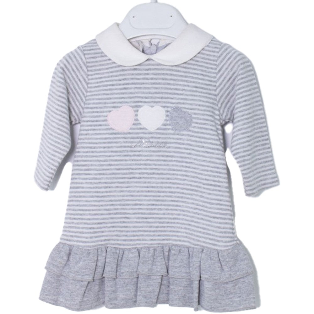 Abito in caldo cotone a righe grigie e bianche con balze con rouches sottostanti, colletto bianco e ricamo sul petto con strass