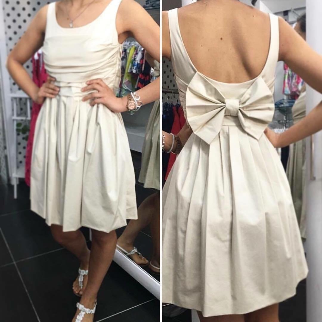 -Abito in Cotone smanicato beige con fiocco grande sul petto e baciapieghe lungo a gonna