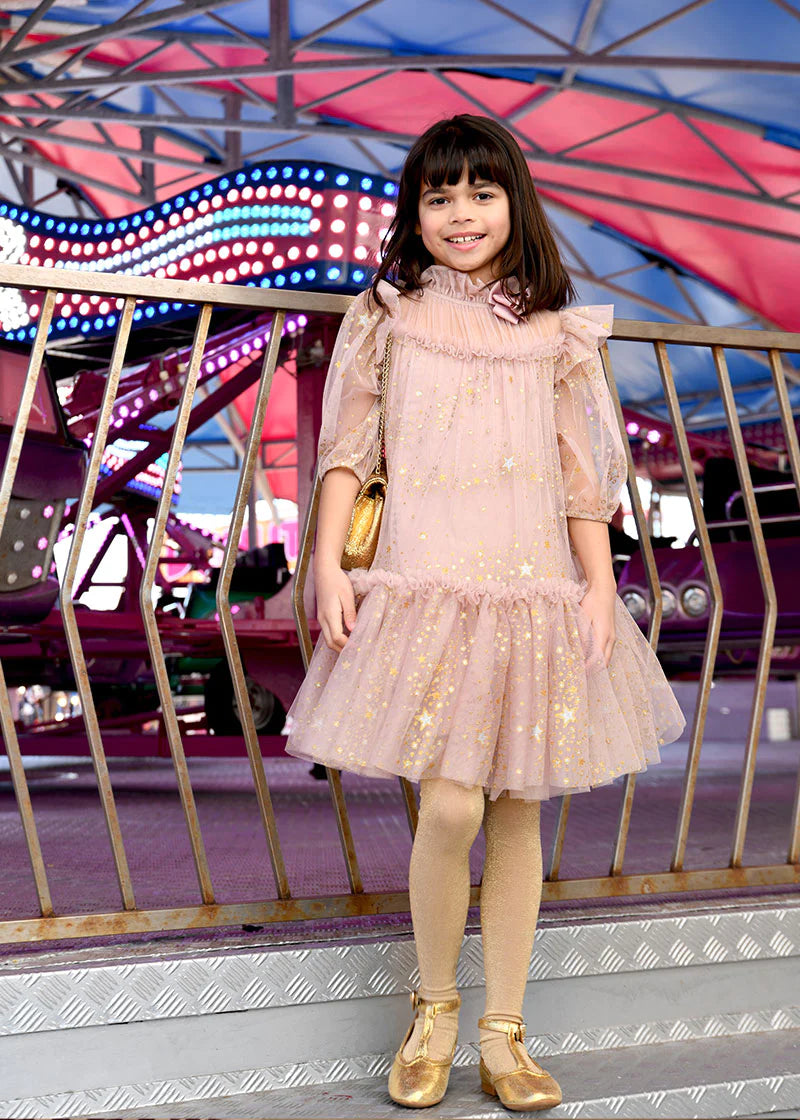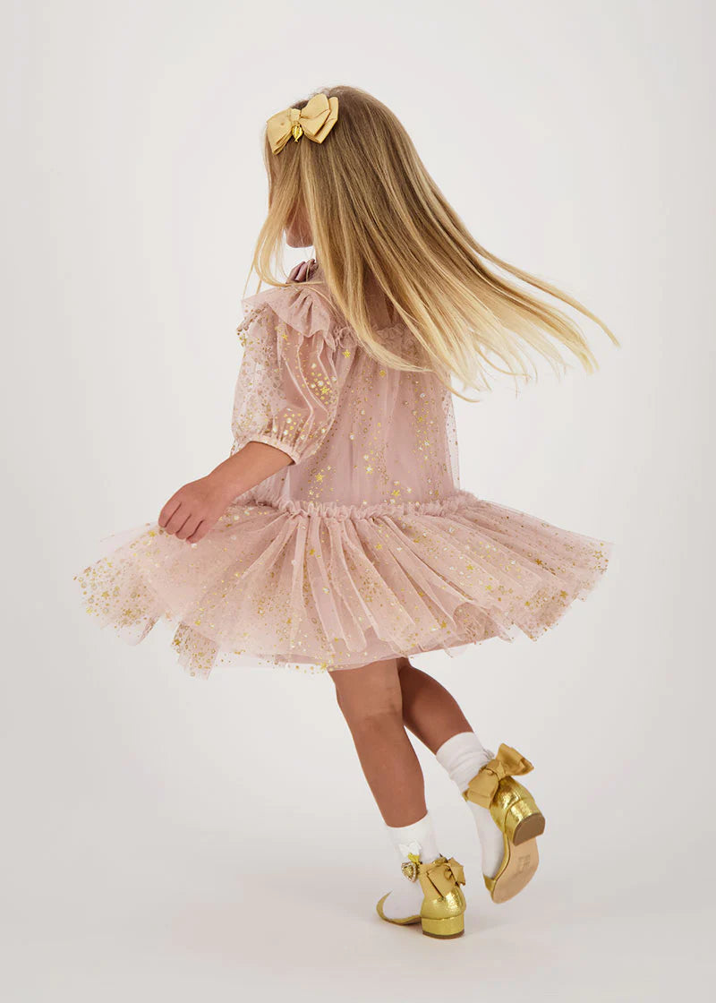 L'Abito In Tulle Con Stelle Glitter Bambina ANGEL'S FACE MYRTLE.STAR è un lussuoso abito da festa per bambina, con stampa stelle color champagne e oro.