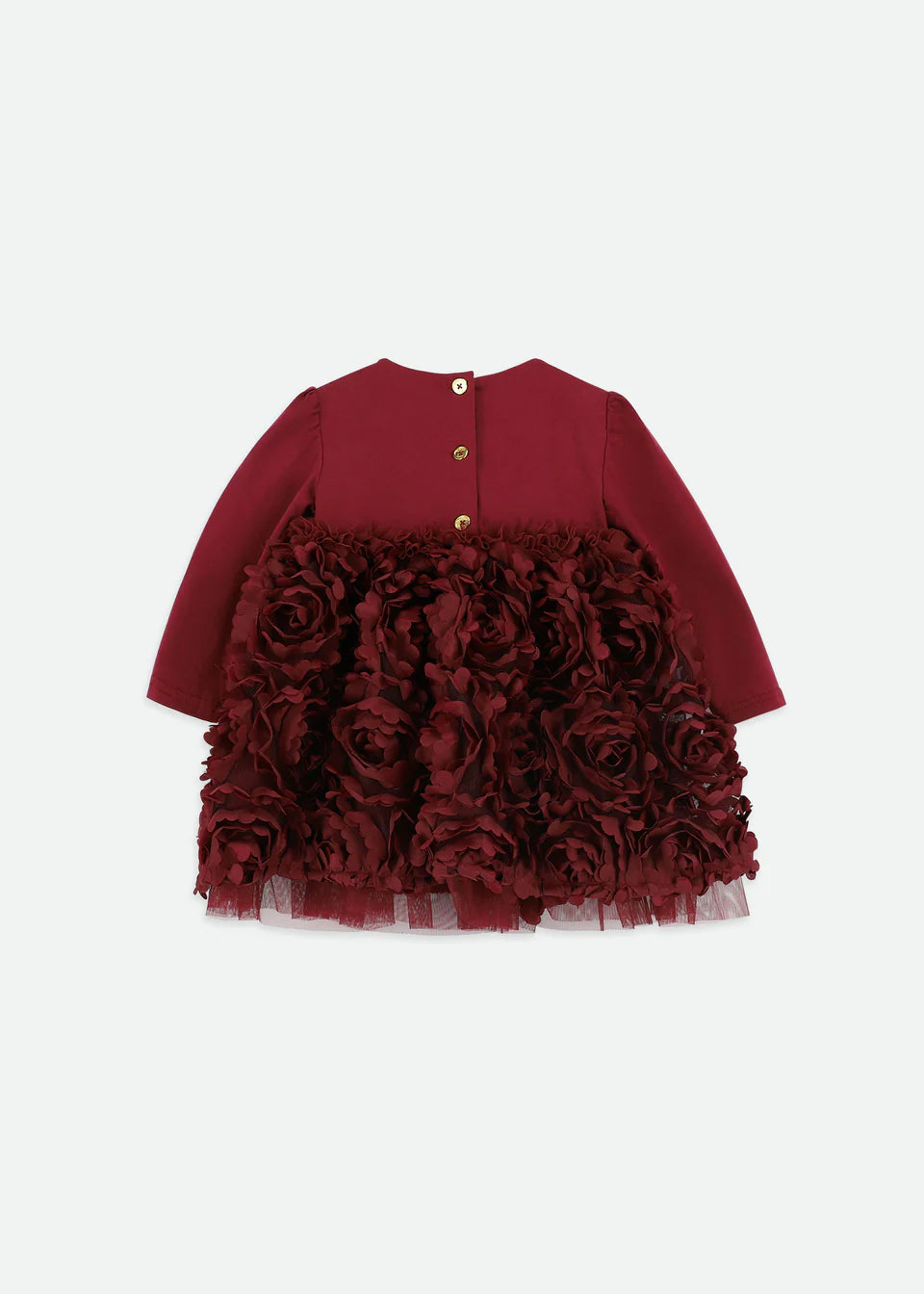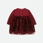 Splendido abito bordeaux con fiori 3D per neonata. Questo abito per occasioni speciali è perfetto per feste e celebrazioni. Presenta maniche lunghe in jersey e un morbido corpetto elasticizzato per un comfort che dura tutto il giorno, mentre la gonna è ricoperta da strati di splendide applicazioni floreali 3D per un look scenografico e strutturato. Completamente foderato in morbido cotone per una sensazione di morbidezza sulla pelle. Rifinito con un grande fiocco in grosgrain sul davanti, chiusura sul retro con bottoni dorati con logo.