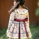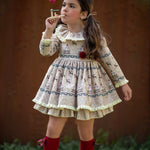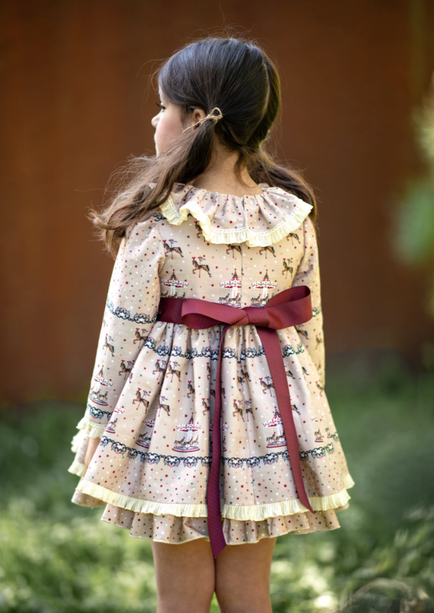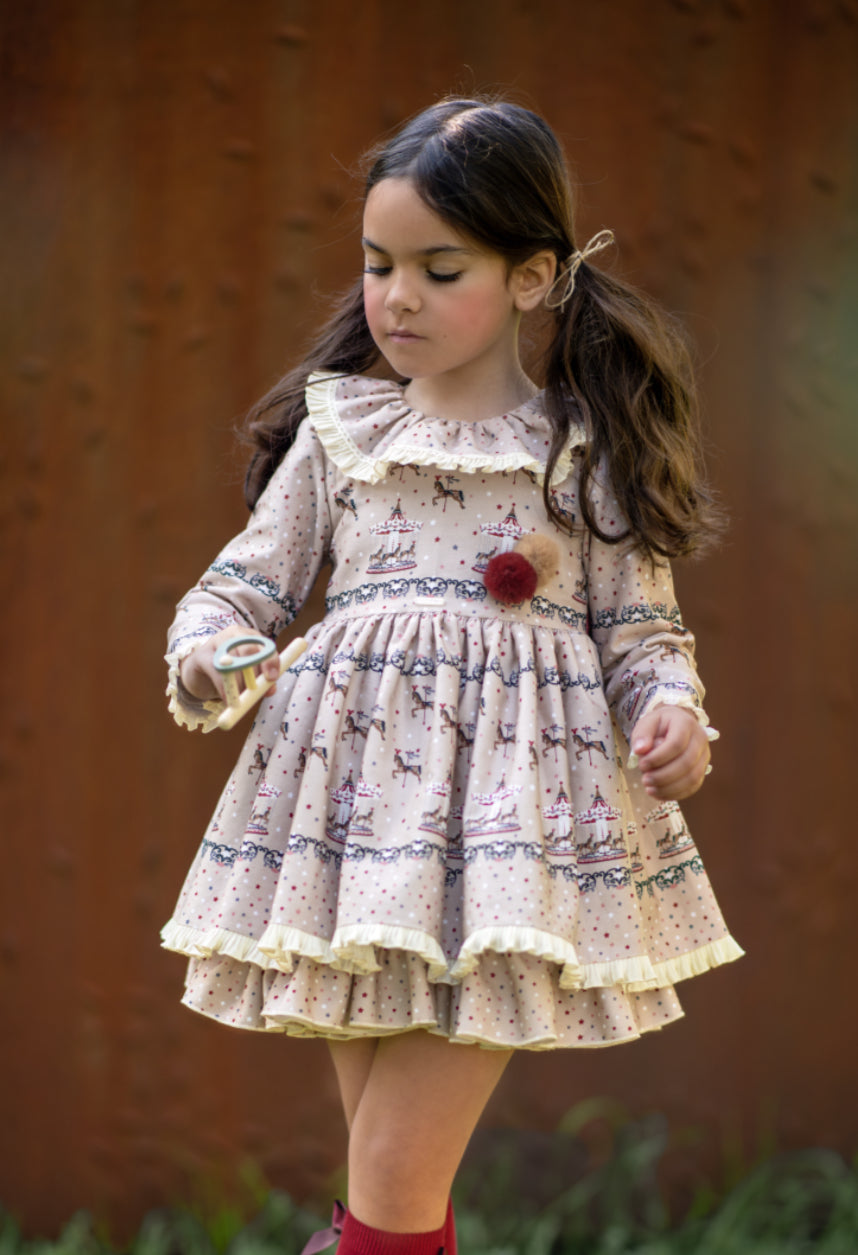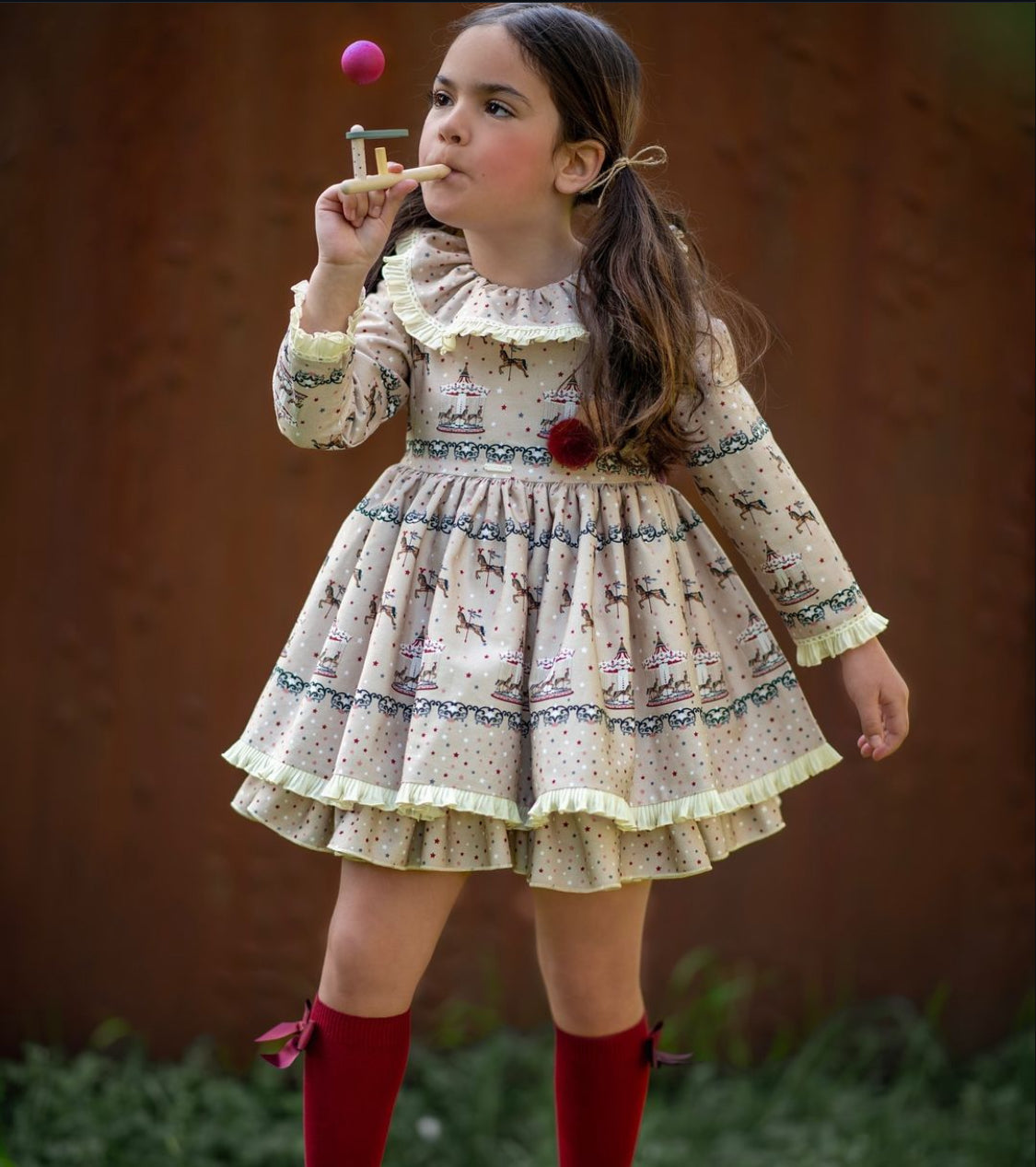 Abito beige manica lunga in caldo cotone con culotte fantasia carosello