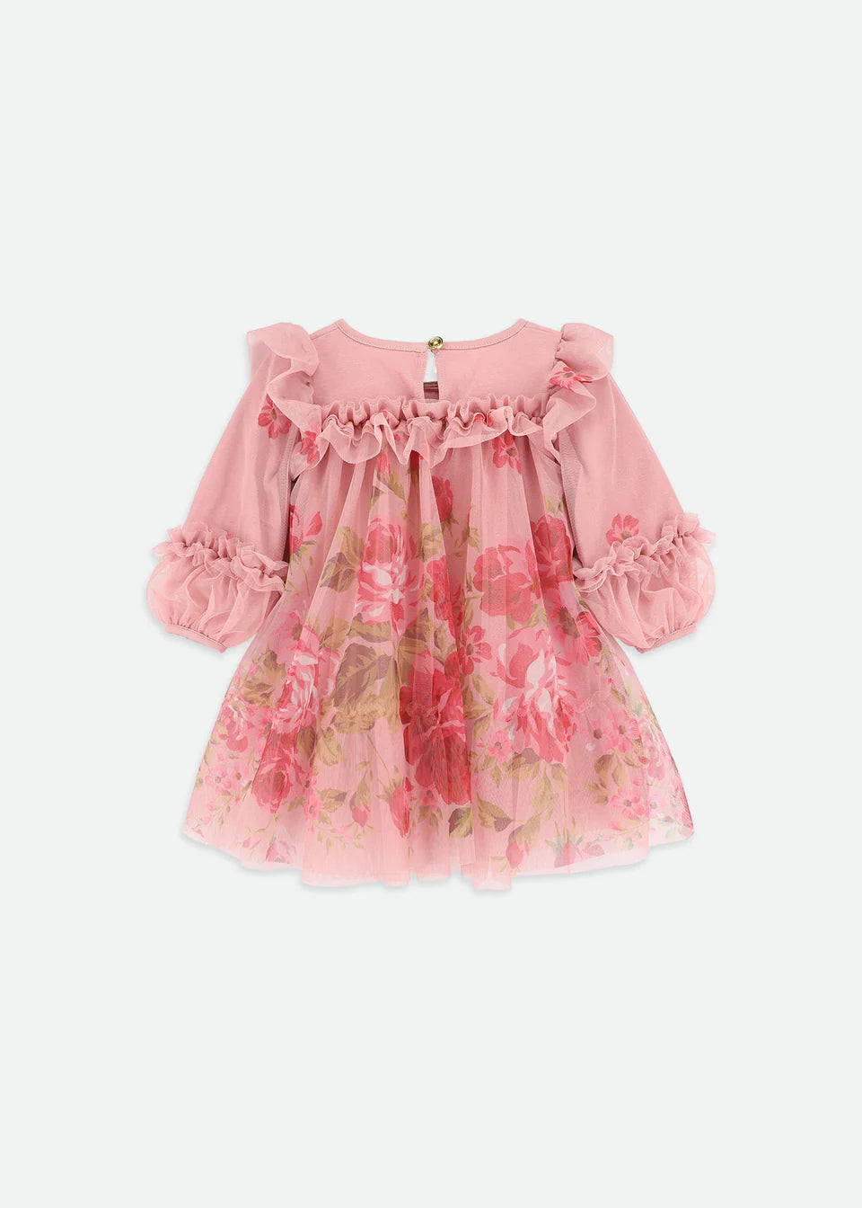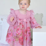 Splendido abito da neonata in tulle floreale rosa. Questo voluminoso abito in tulle è perfetto per feste o occasioni speciali. Maniche lunghe a sbuffo con polsini elasticizzati, volant lungo il carré e la scollatura e morbide arricciature creano una silhouette elegante. Interamente foderato in morbido misto cotone elasticizzato. L'abito è completato dal nostro fiocco esclusivo, con chiusura sul retro con un bottone dorato.