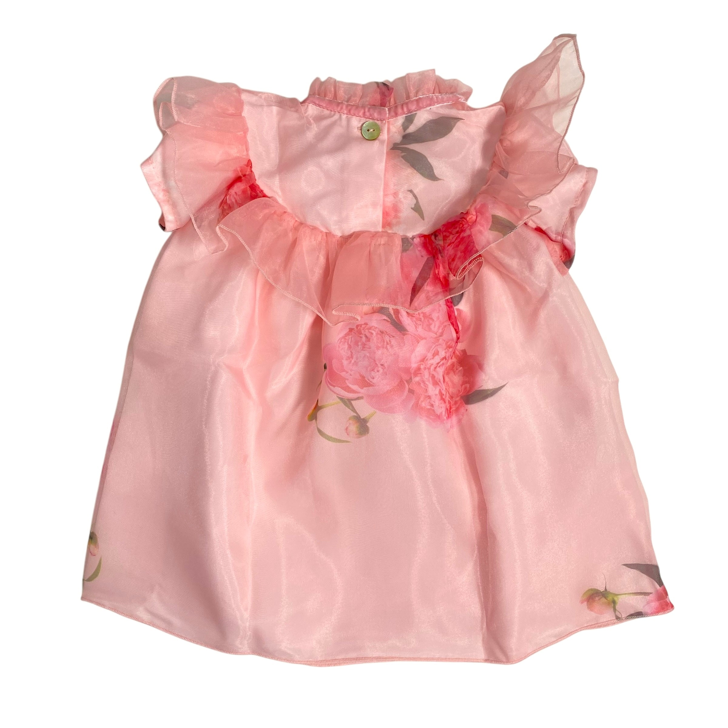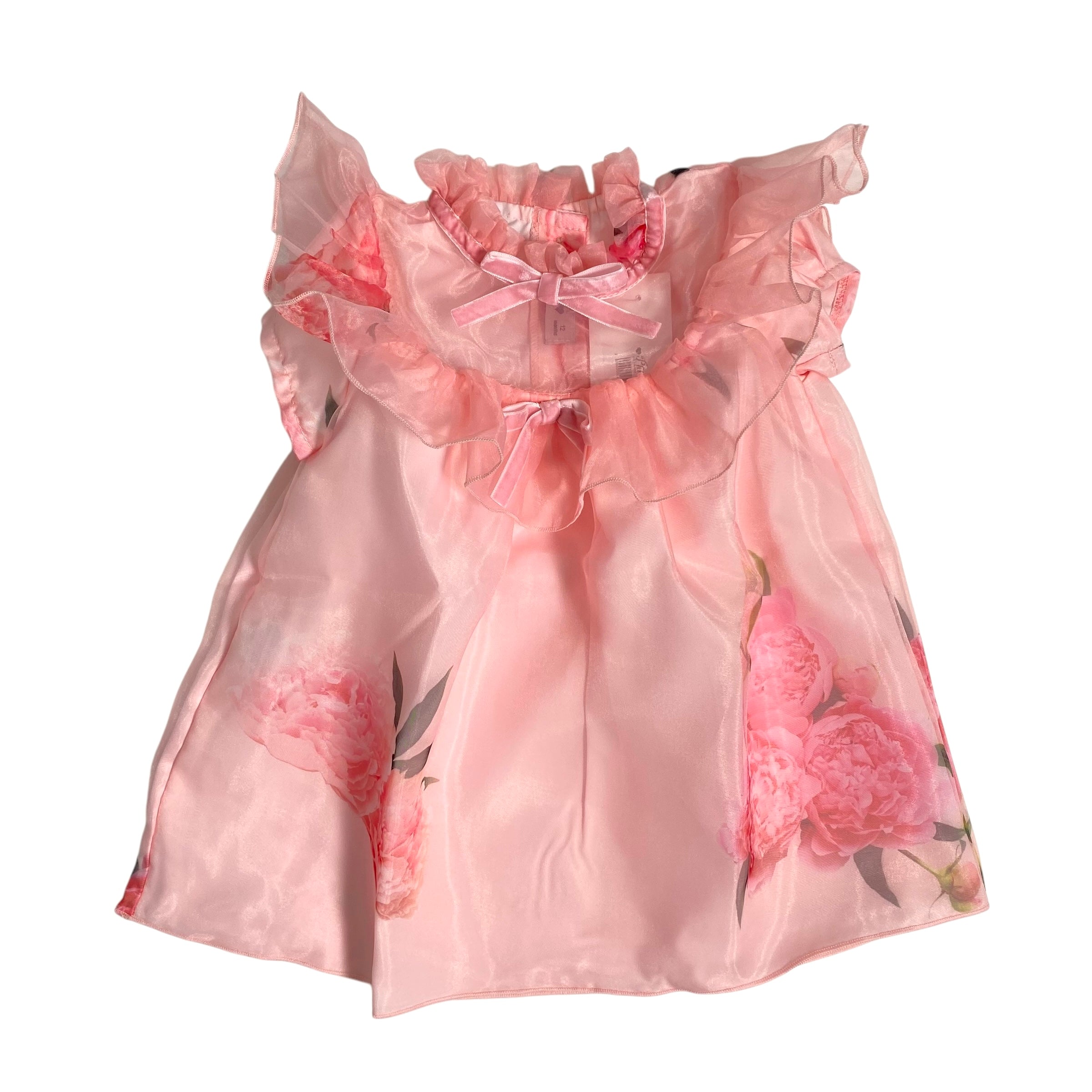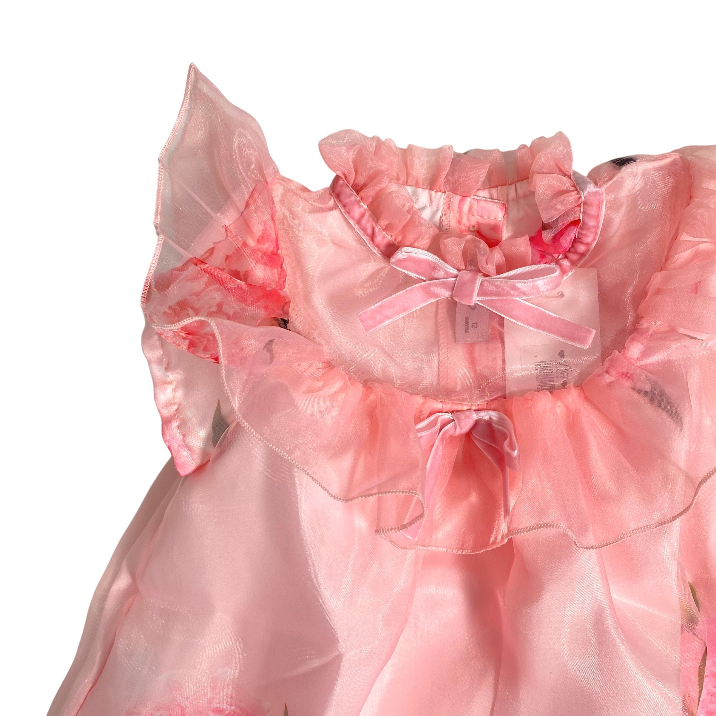 Uno splendido abito per occasioni speciali in organza rosa. Ideale per le feste, è realizzato in organza leggera e setosa e foderato in morbido cotone. Rifinito con volant, ha una gonna ampia. Chiusura con cerniera sul retro.
