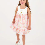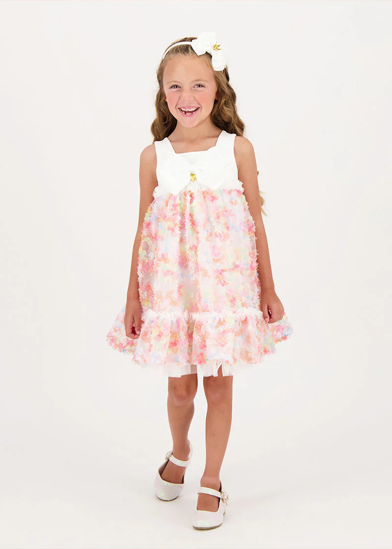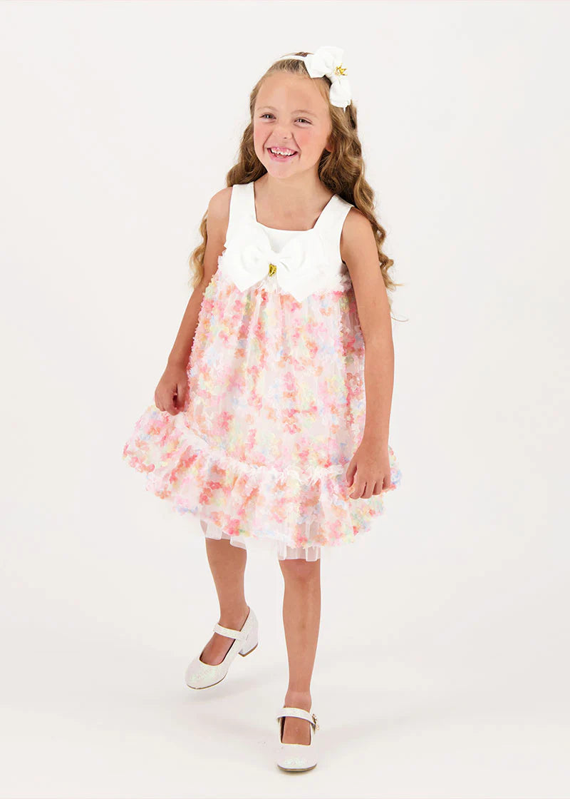 Grazioso abito multicolore bucaneve per bambina con voluminosa gonna in tulle 3D. il favoloso vestito presenta un fiocco in tessuto al centro del corpetto in cotone e si chiude sul retro con un ciondolo a cuore dorato.