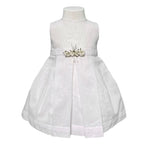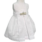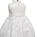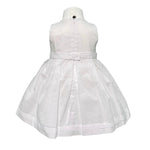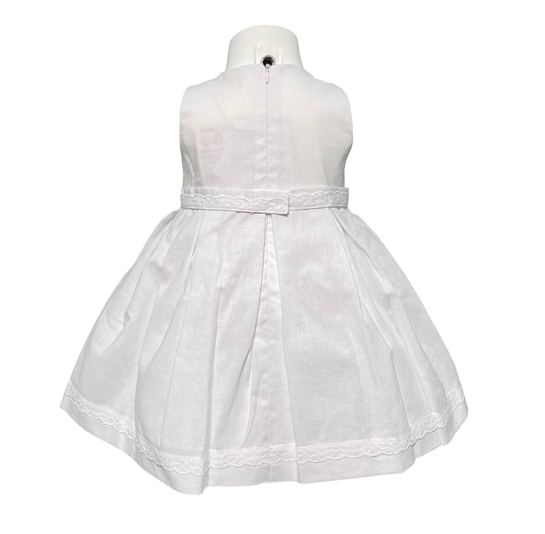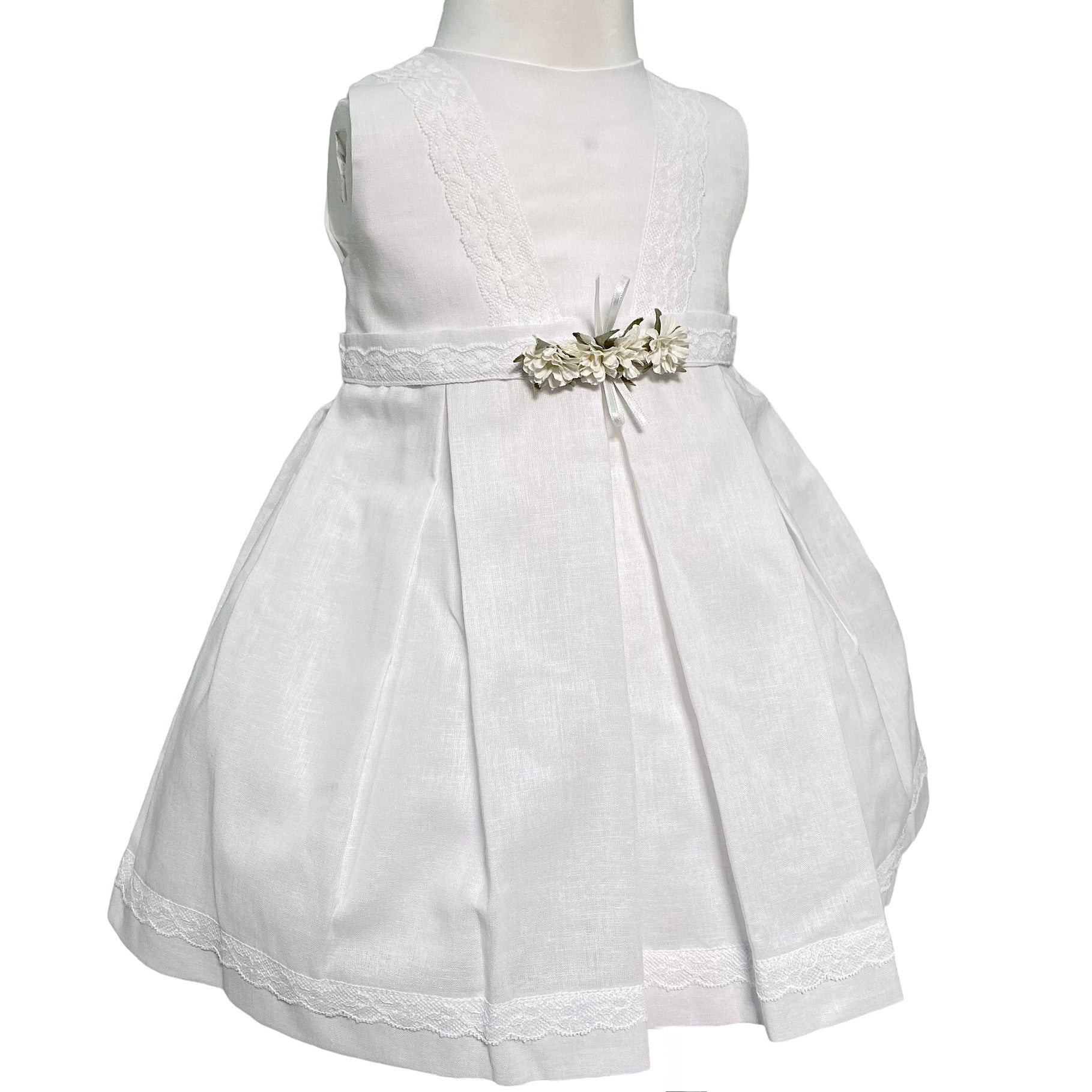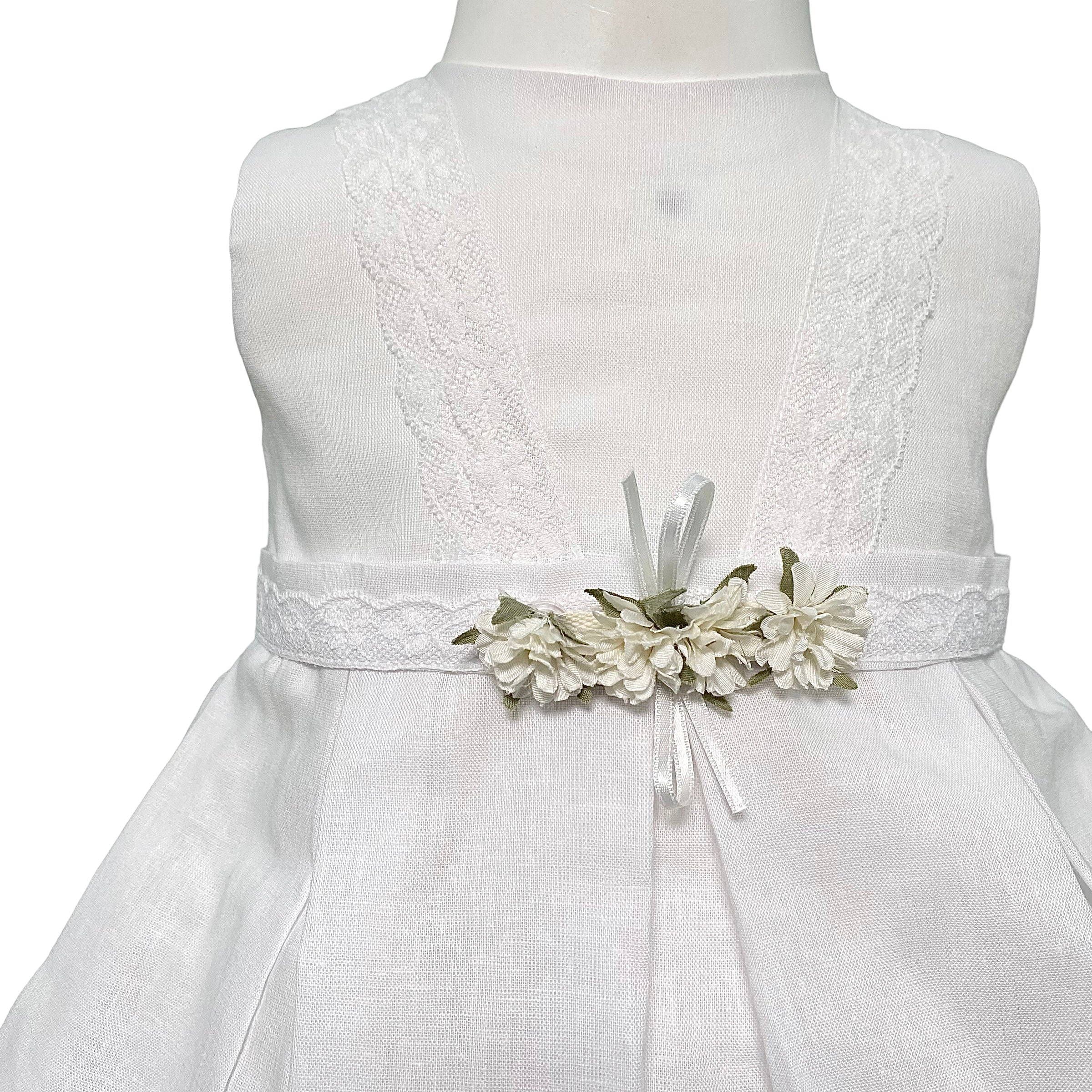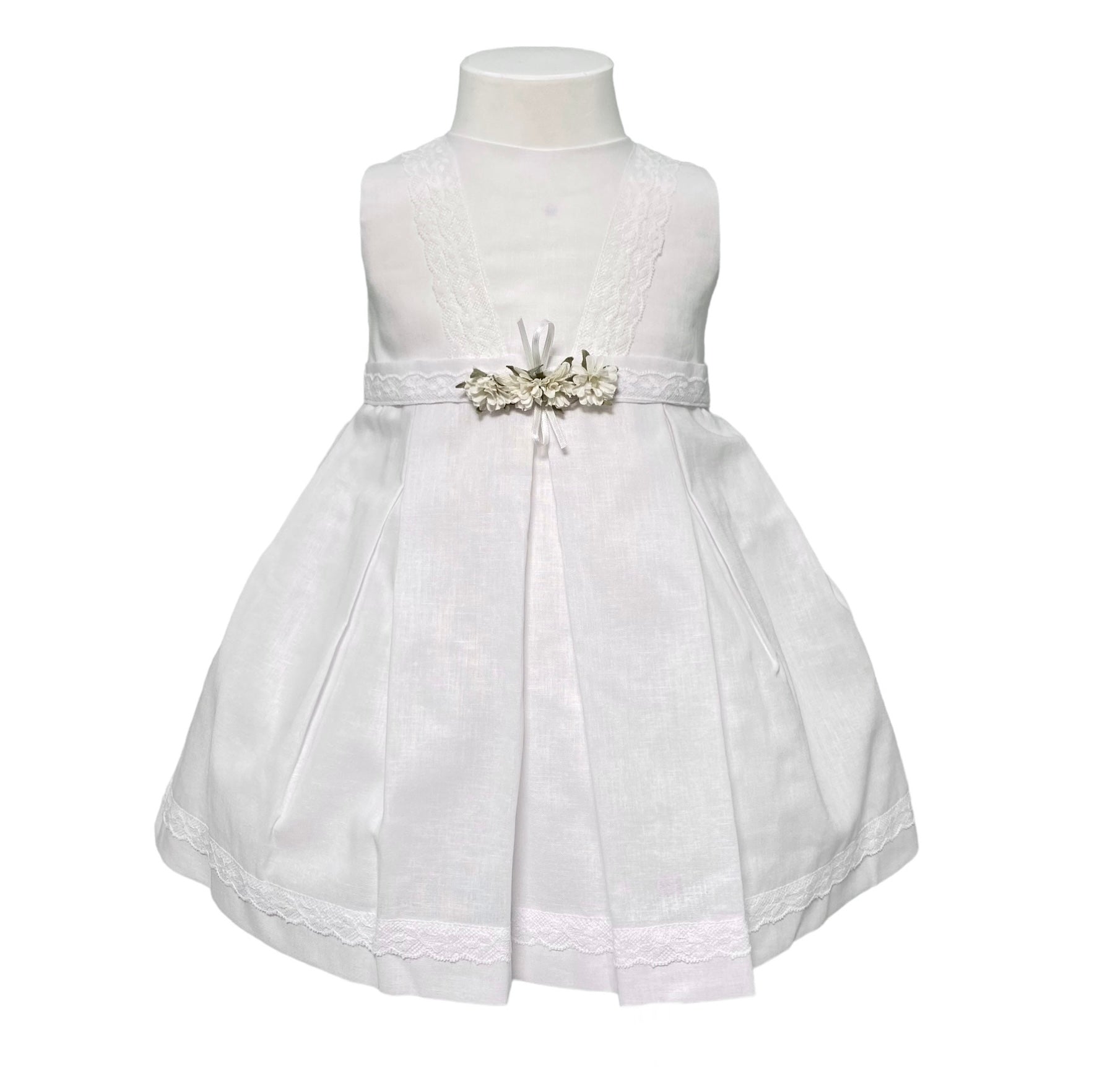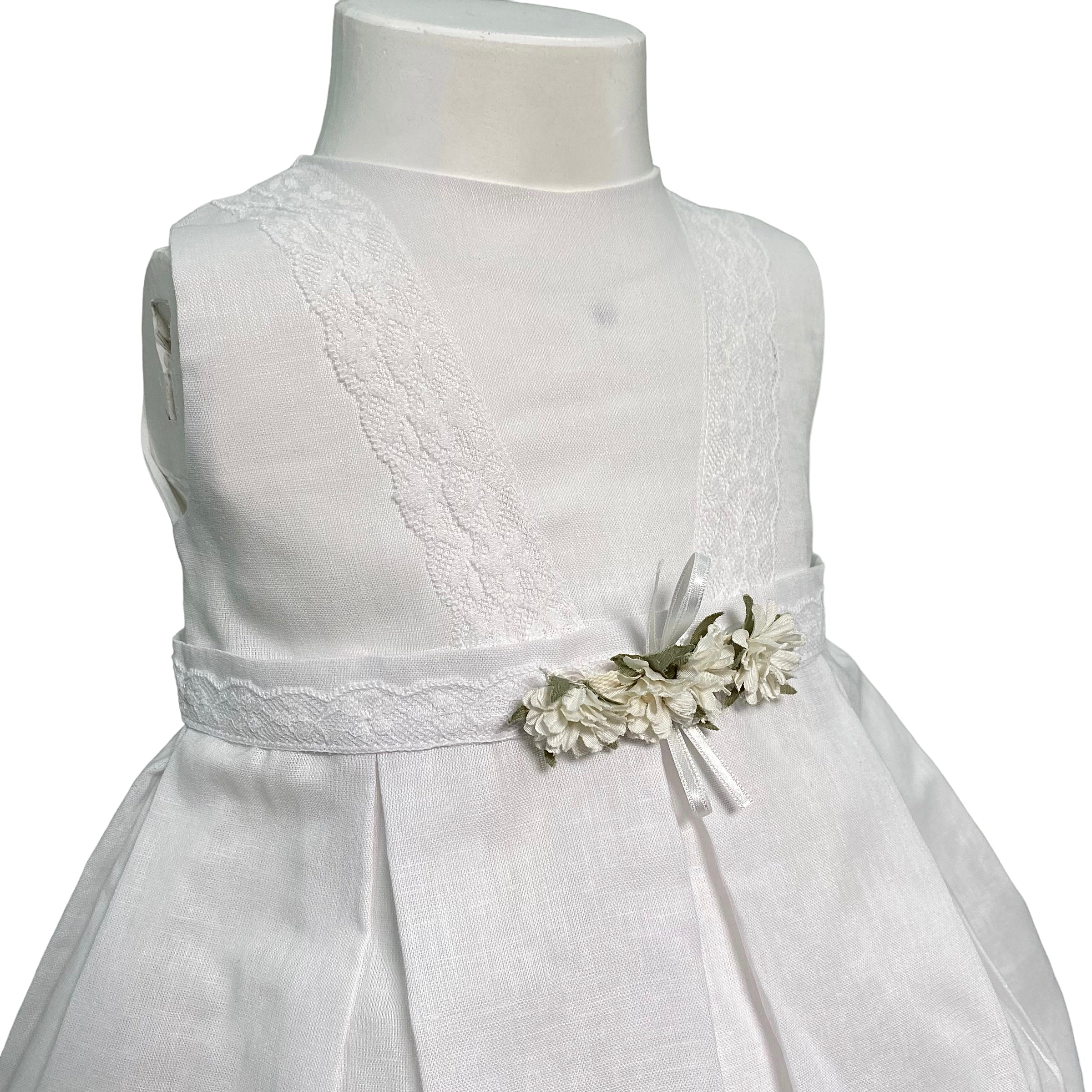 Abito smanicato in misto lino, in tinta unita bianco, con applicazione di pizzo e fiori.