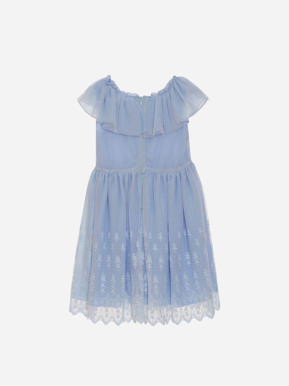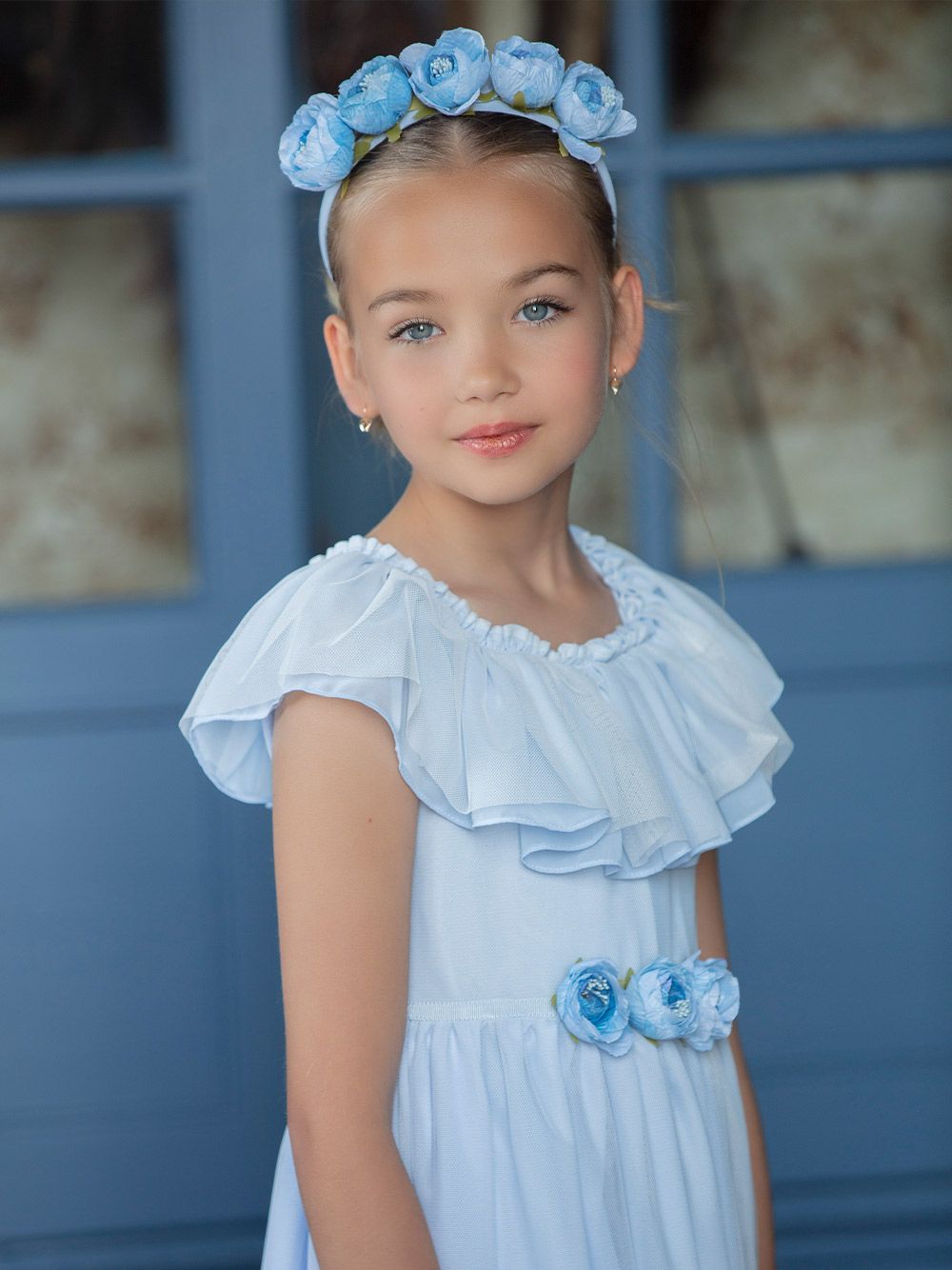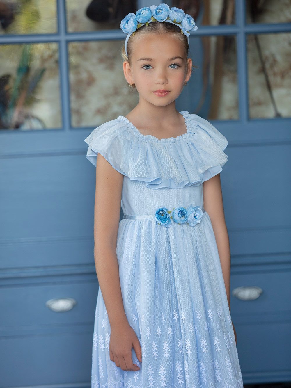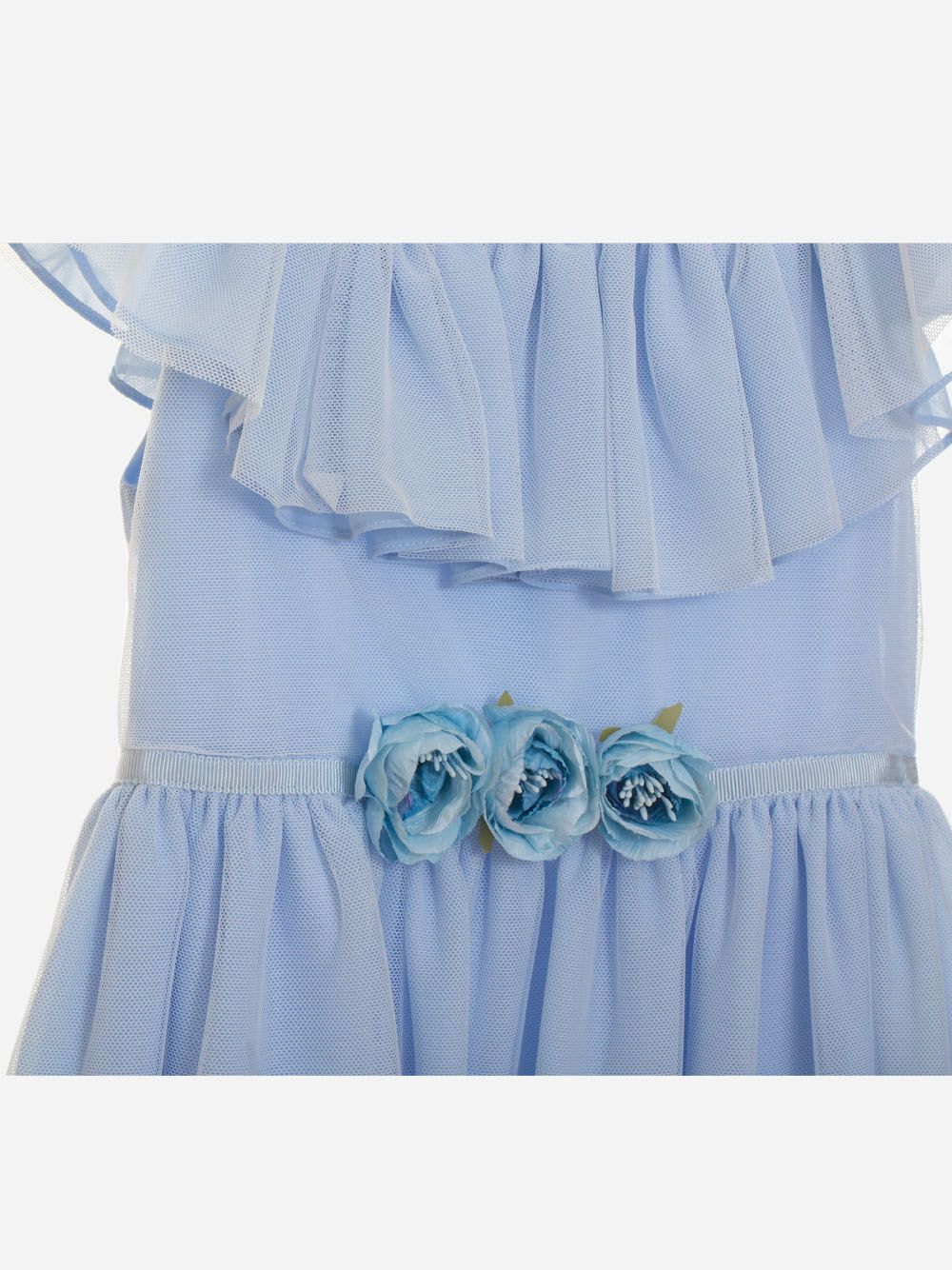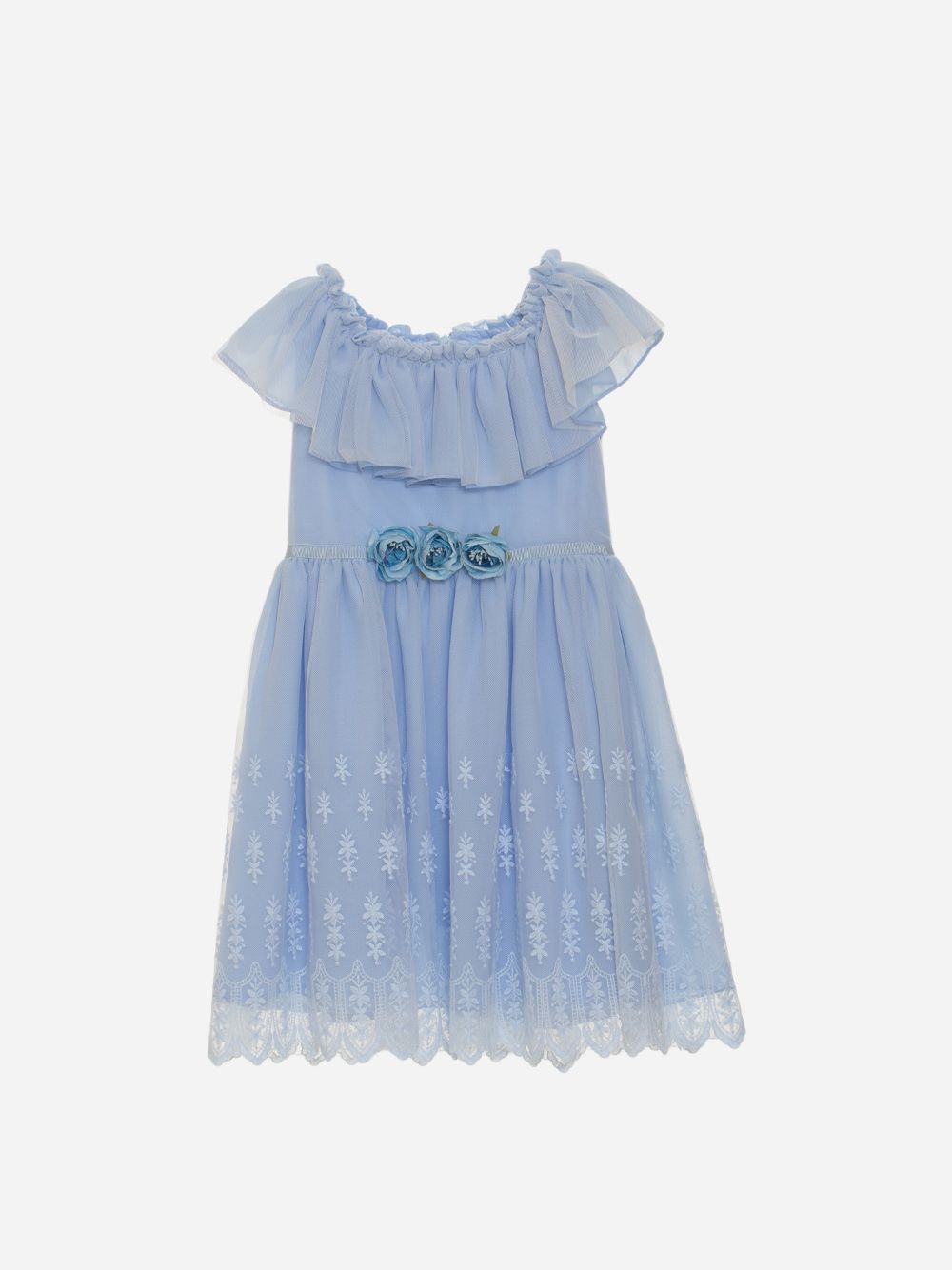 Splendido vestito blu da festa per ragazze di Patachou realizzato in pizzo con tre graziose rose blu in vita davanti.