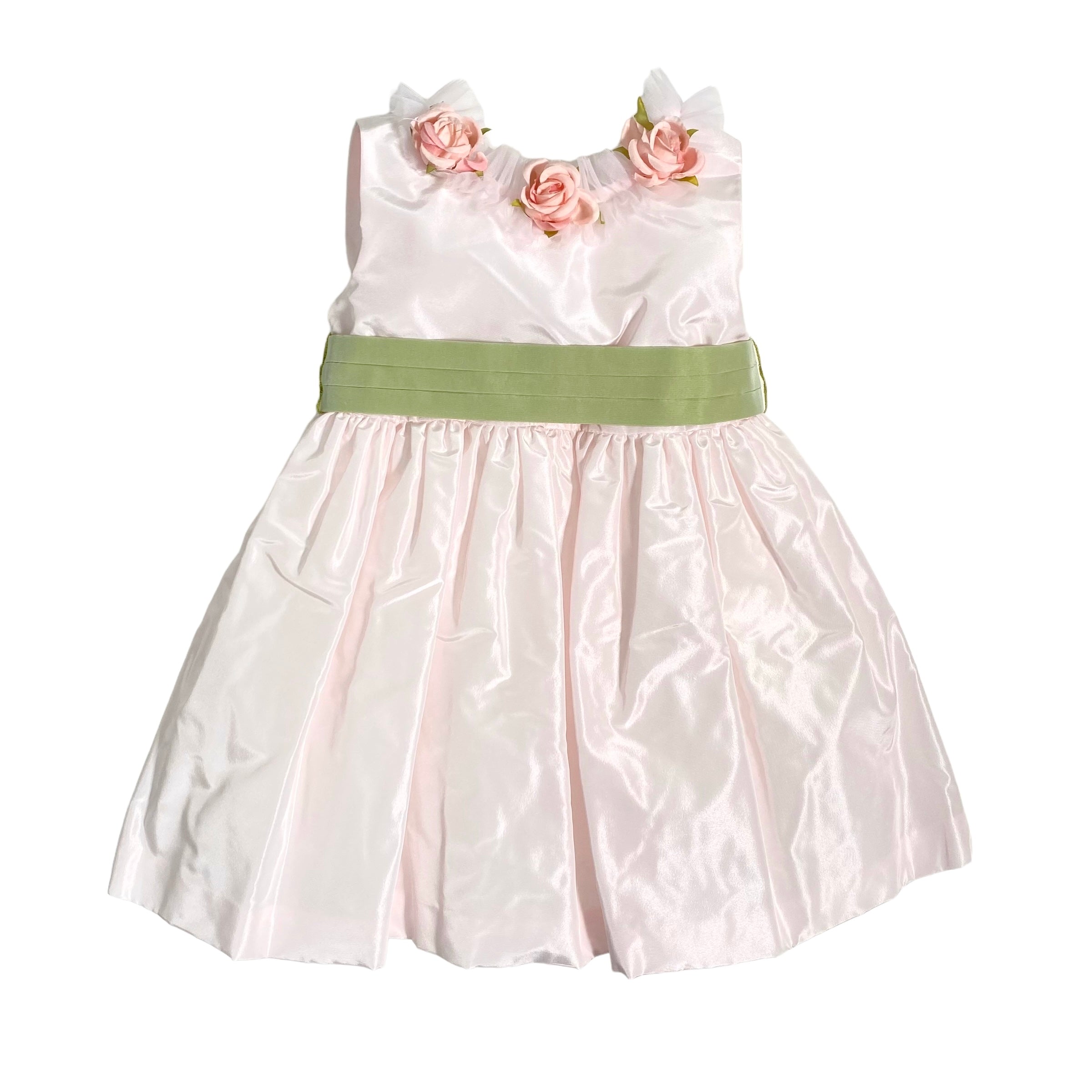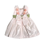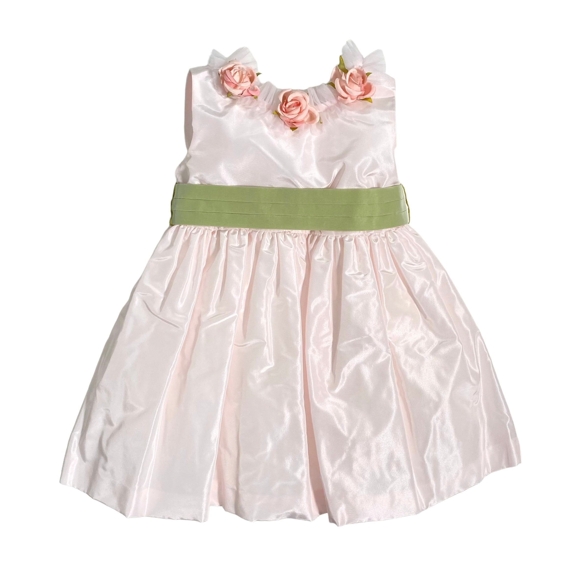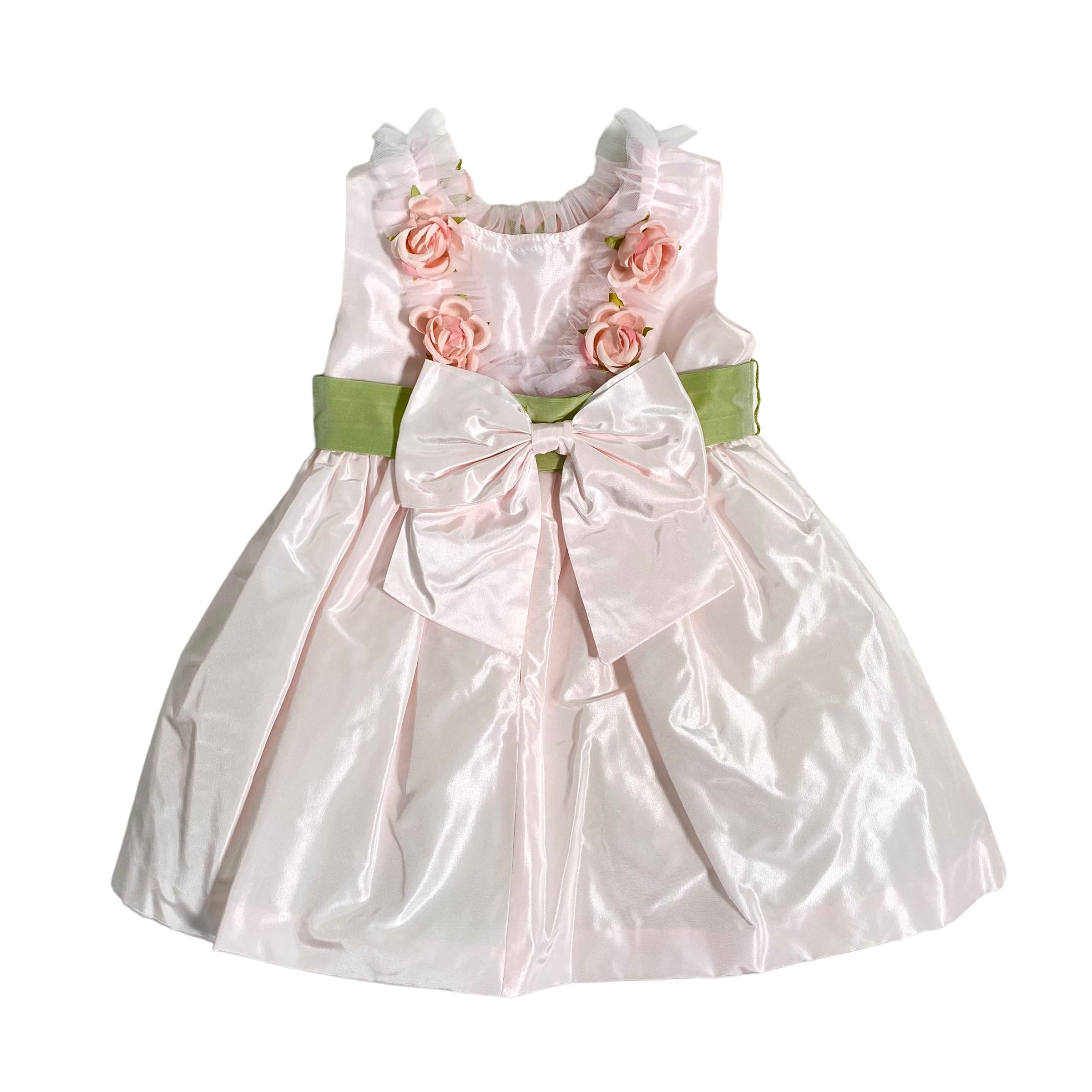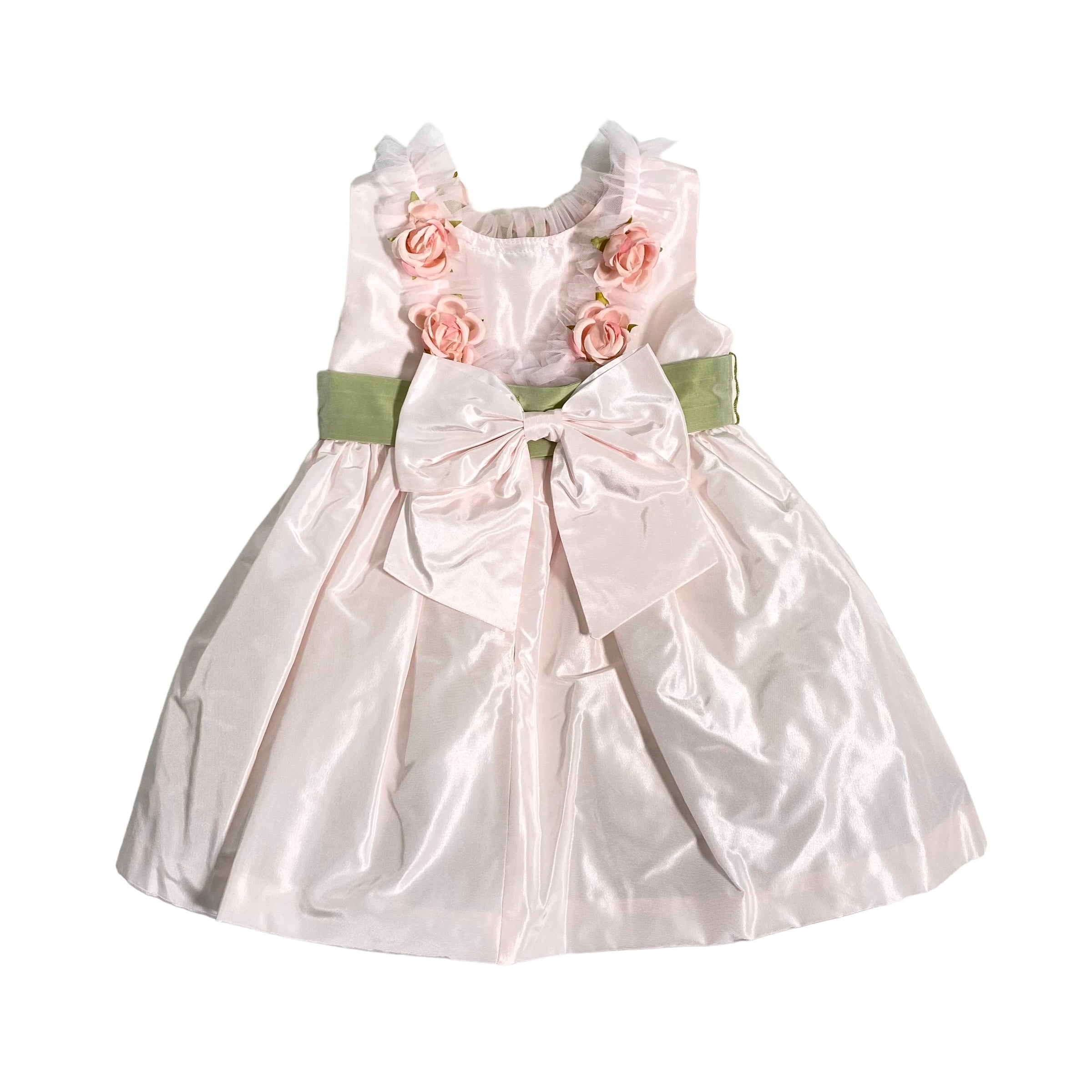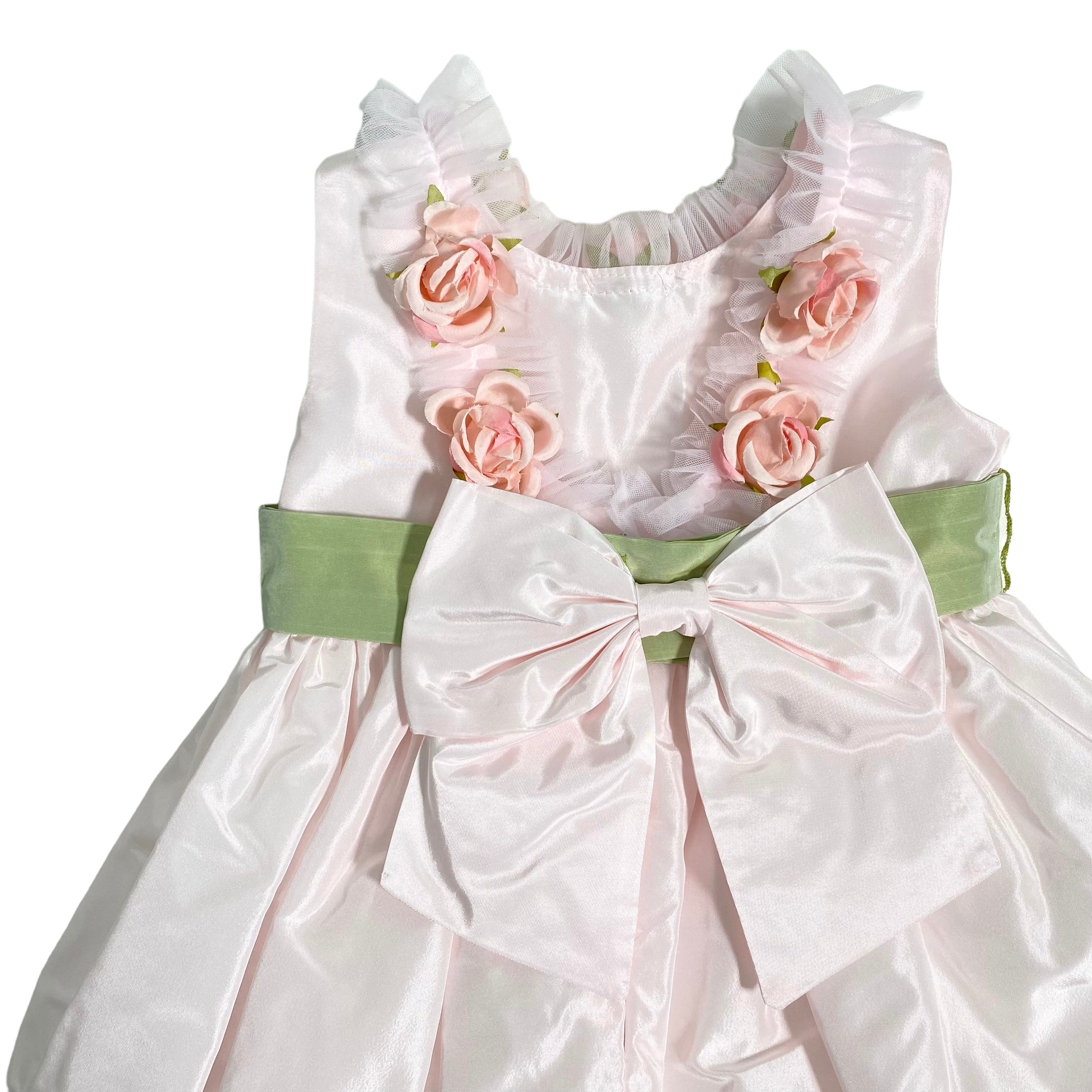 Un abito smanicato in tafta' neonata perfetto per la tua principessa. Con scollo schiena e applicazione di rose e tulle, la fascia in vita e lo stile bambolina daranno un tocco elegante. Goditi il fiocco sul retro per un look ancora più dolce.